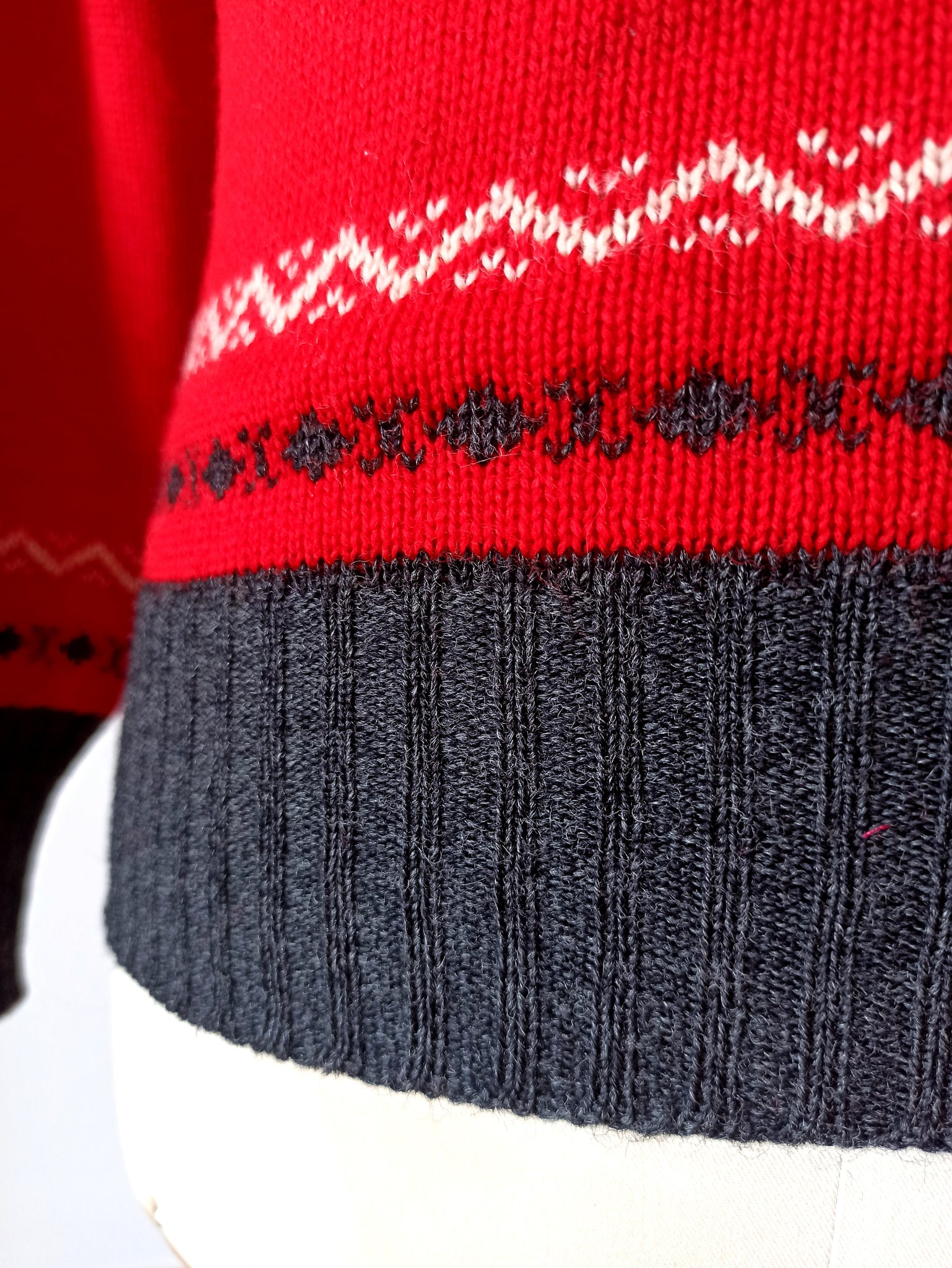 This is a fabulous men's sweater from the very late 1940s or very early 1950s by Fashion Hill, USA. Wool knitted in red, dark grey, white and cream. Wide waistband. Tag reads size S.