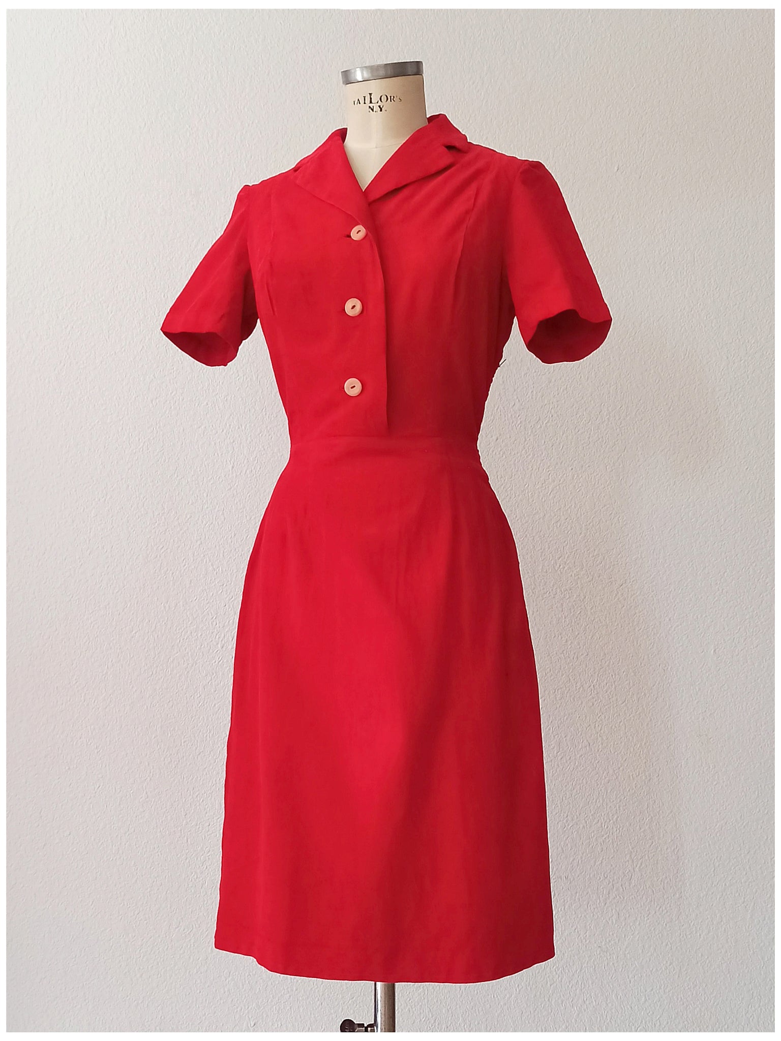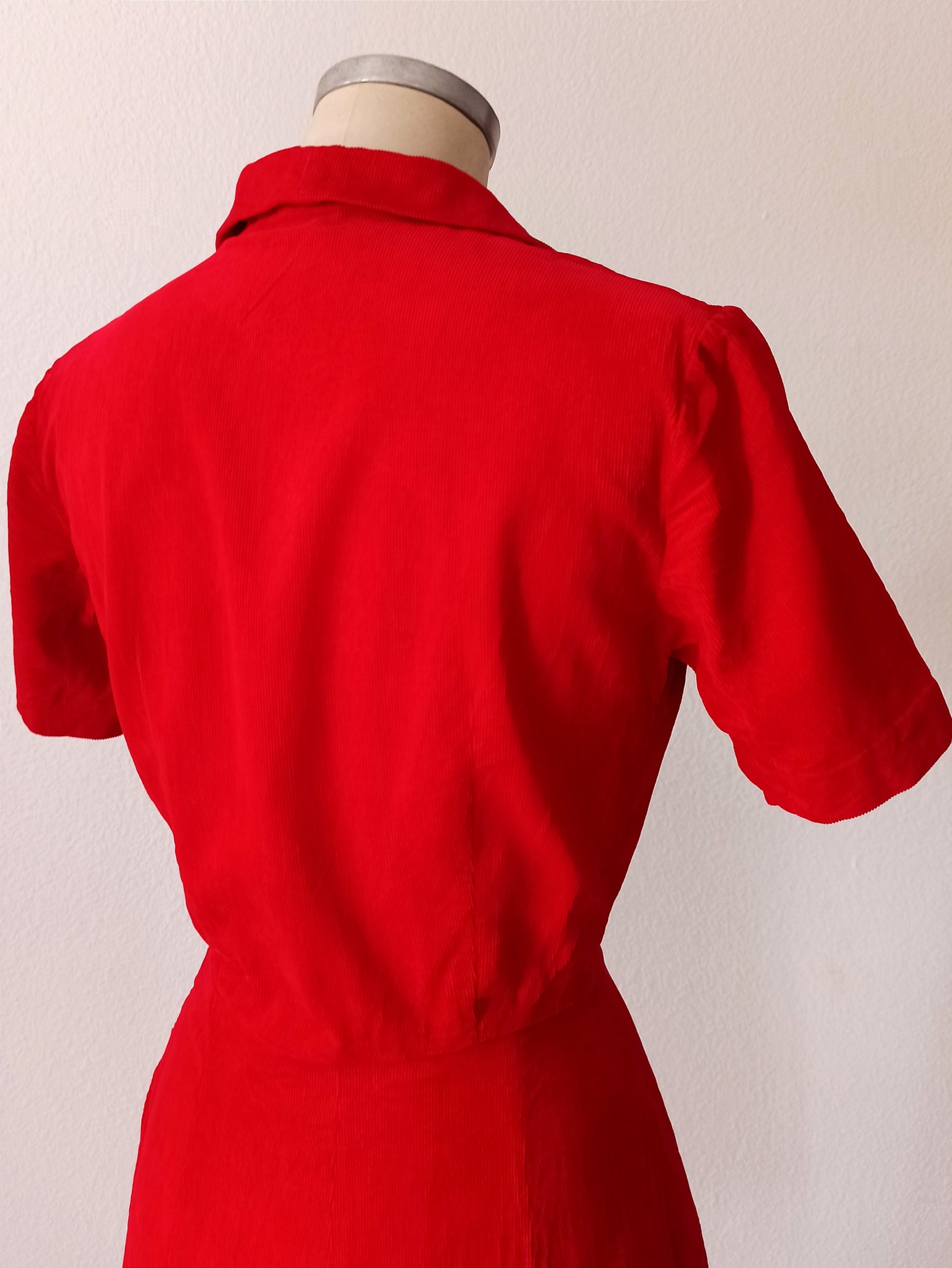This is a truly stunning dress from the very late 1940s or very early 1950s. The fabric is a glorious soft velvety corduroy in a solid red lipstick. Fabulous shirt collar and front buttons. Vertical waist-seams, fits like a glove! She closes with a side metal zipper.
