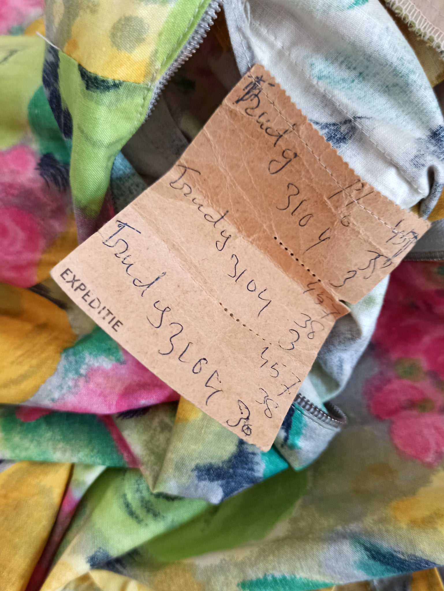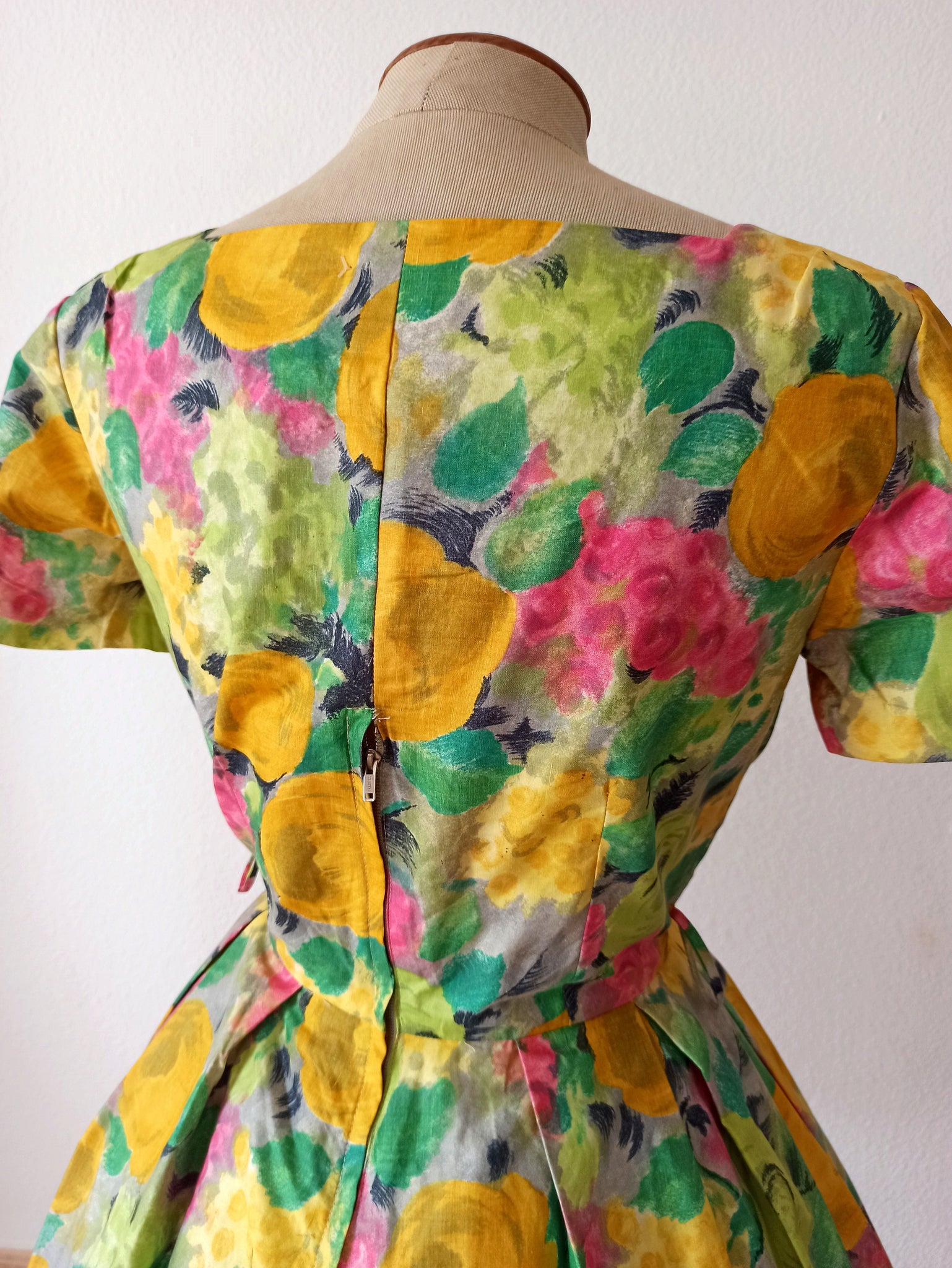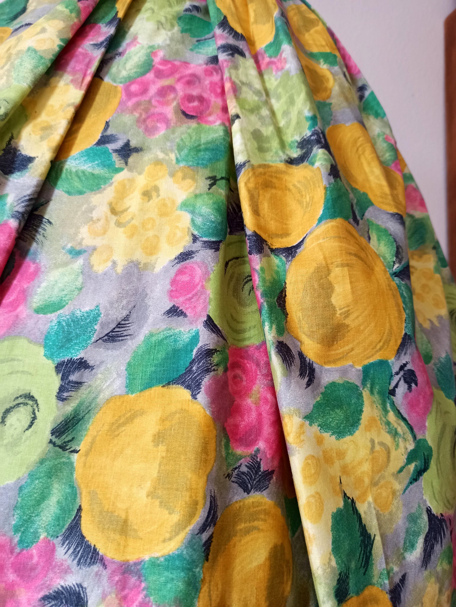 This is a stunning dress from the late 1950s or very early 1960s in deadstock condition, it still has the original production tag. The fabric is a top quality cotton with a truly fabulous roseprint. The colors are super vibrant! She has a classic cut with a precious neckline. She closes with a back metal zipper. Tag reads size 38.