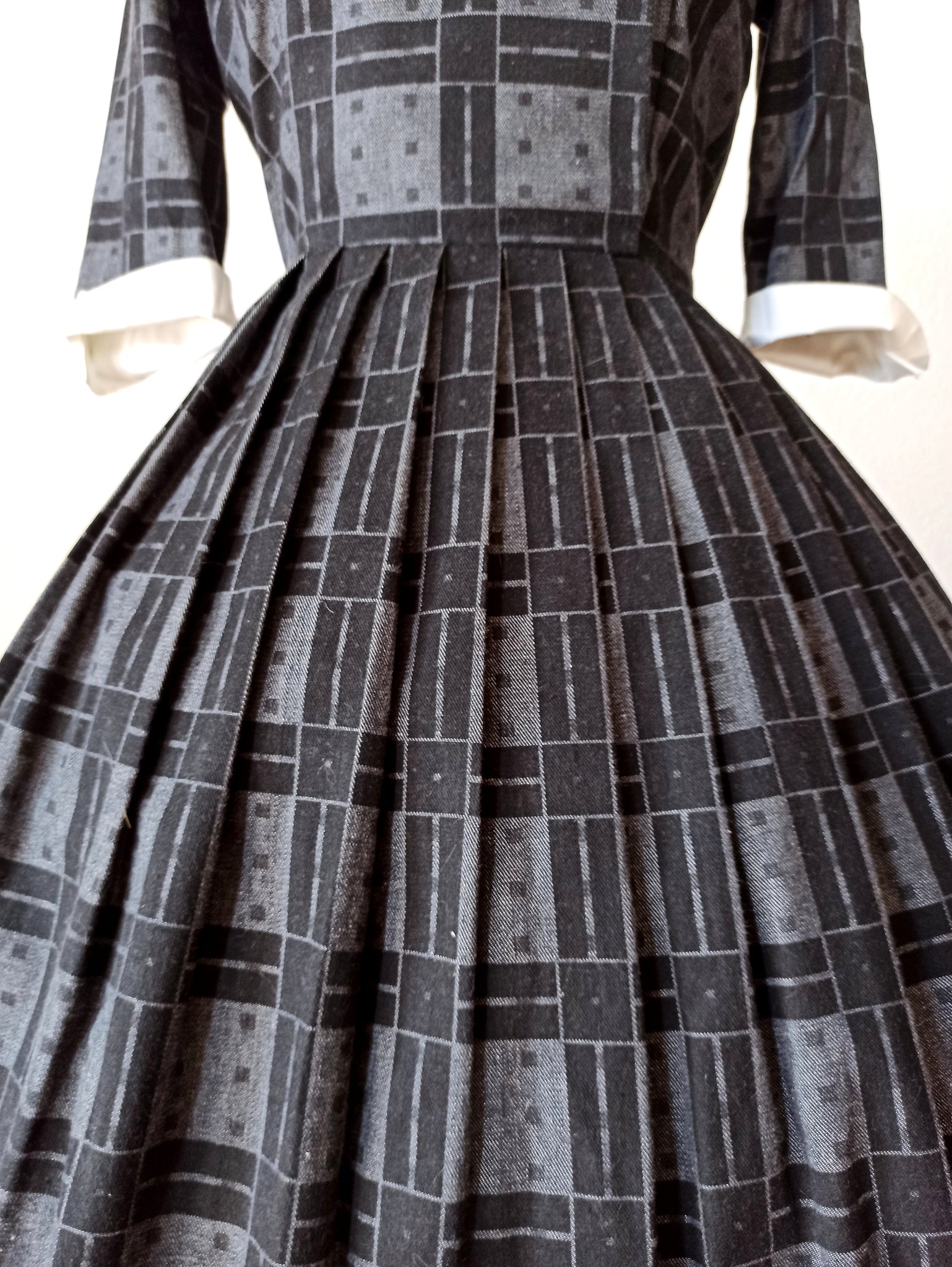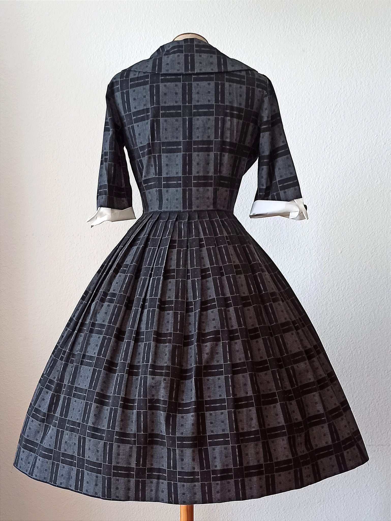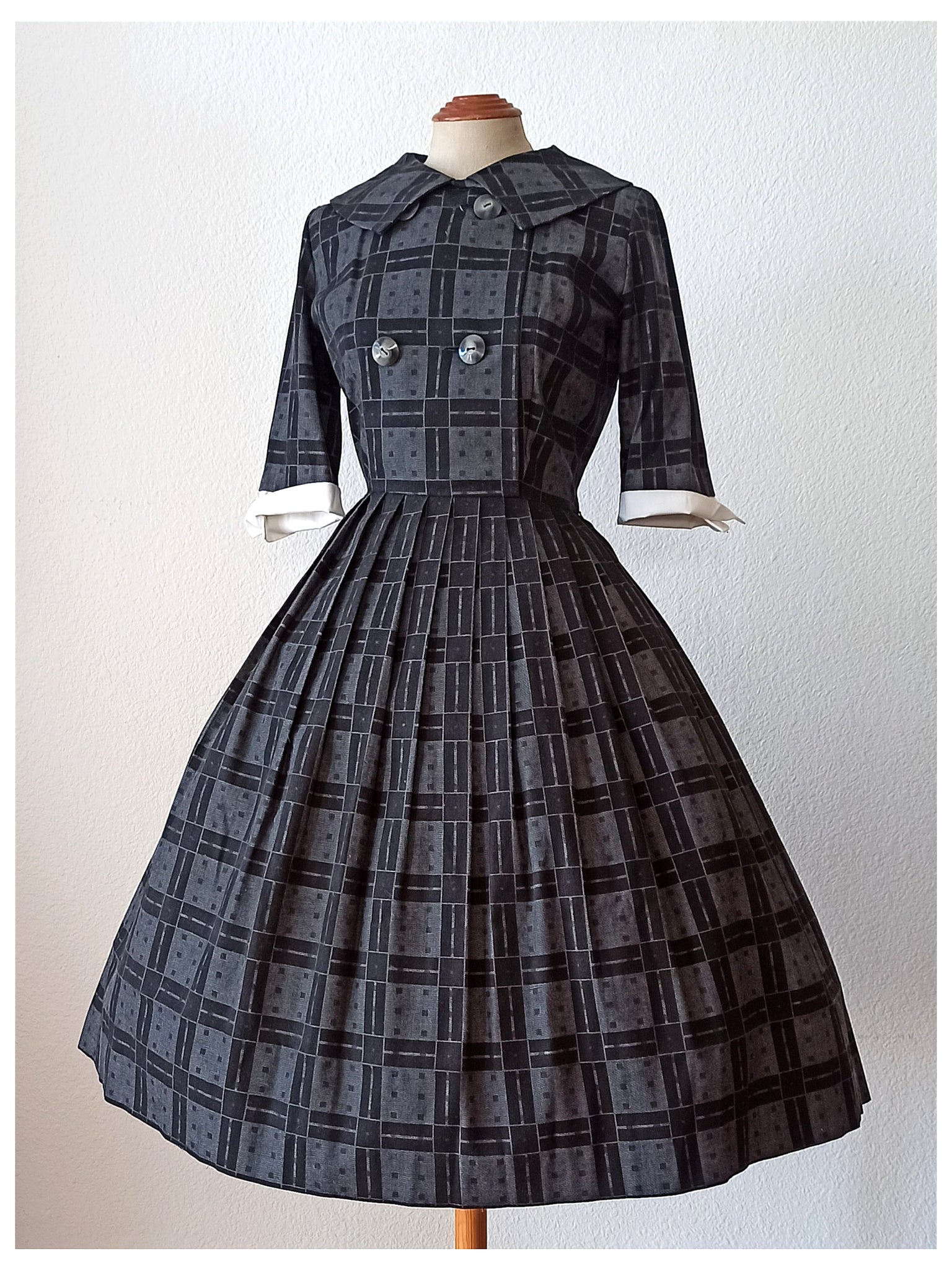 This is a gorgeous dress from the late 1950s or very early 1960s. The fabric is good quality cotton in dark grey and black with white cuffs. Very chic design with a wide collar and a set of front buttons. She closes with a side zipper.