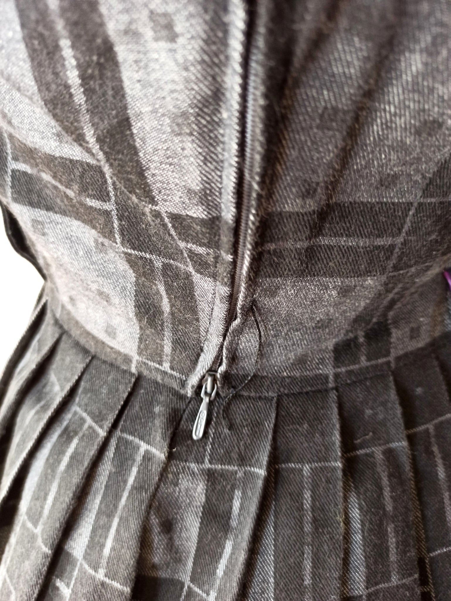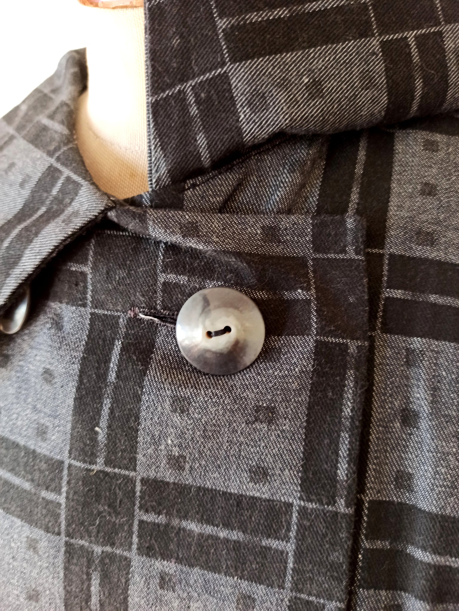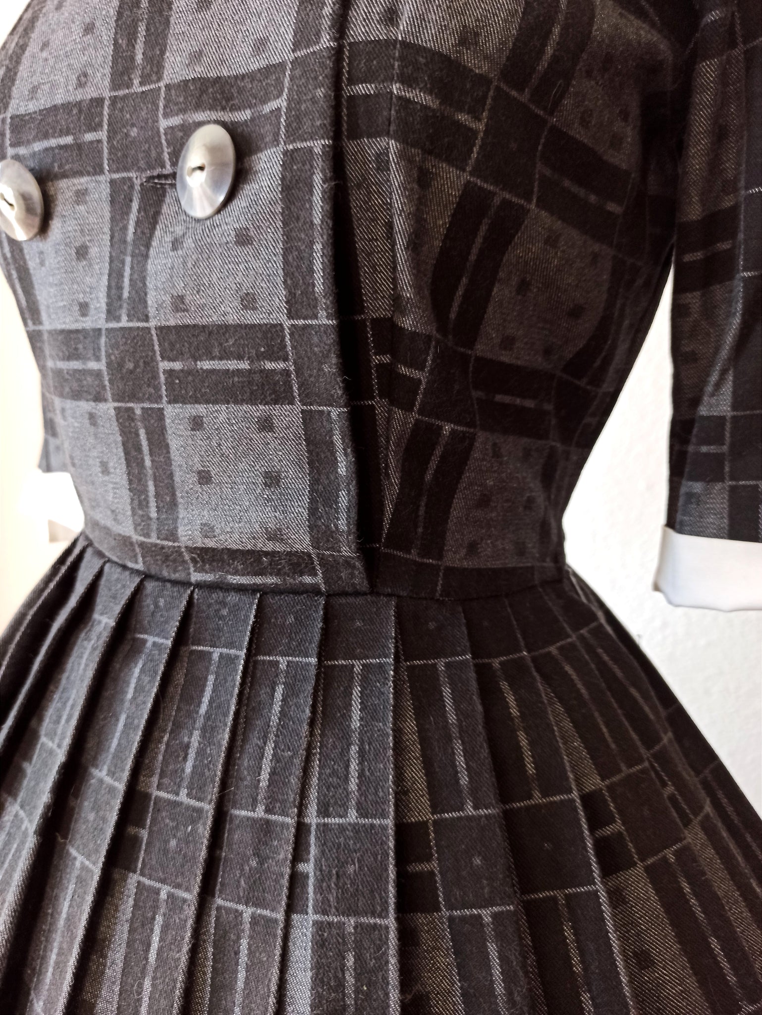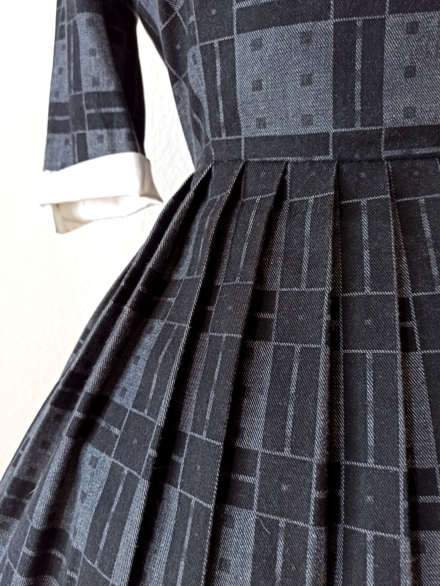 This is a gorgeous dress from the late 1950s or very early 1960s. The fabric is good quality cotton in dark grey and black with white cuffs. Very chic design with a wide collar and a set of front buttons. She closes with a side zipper.