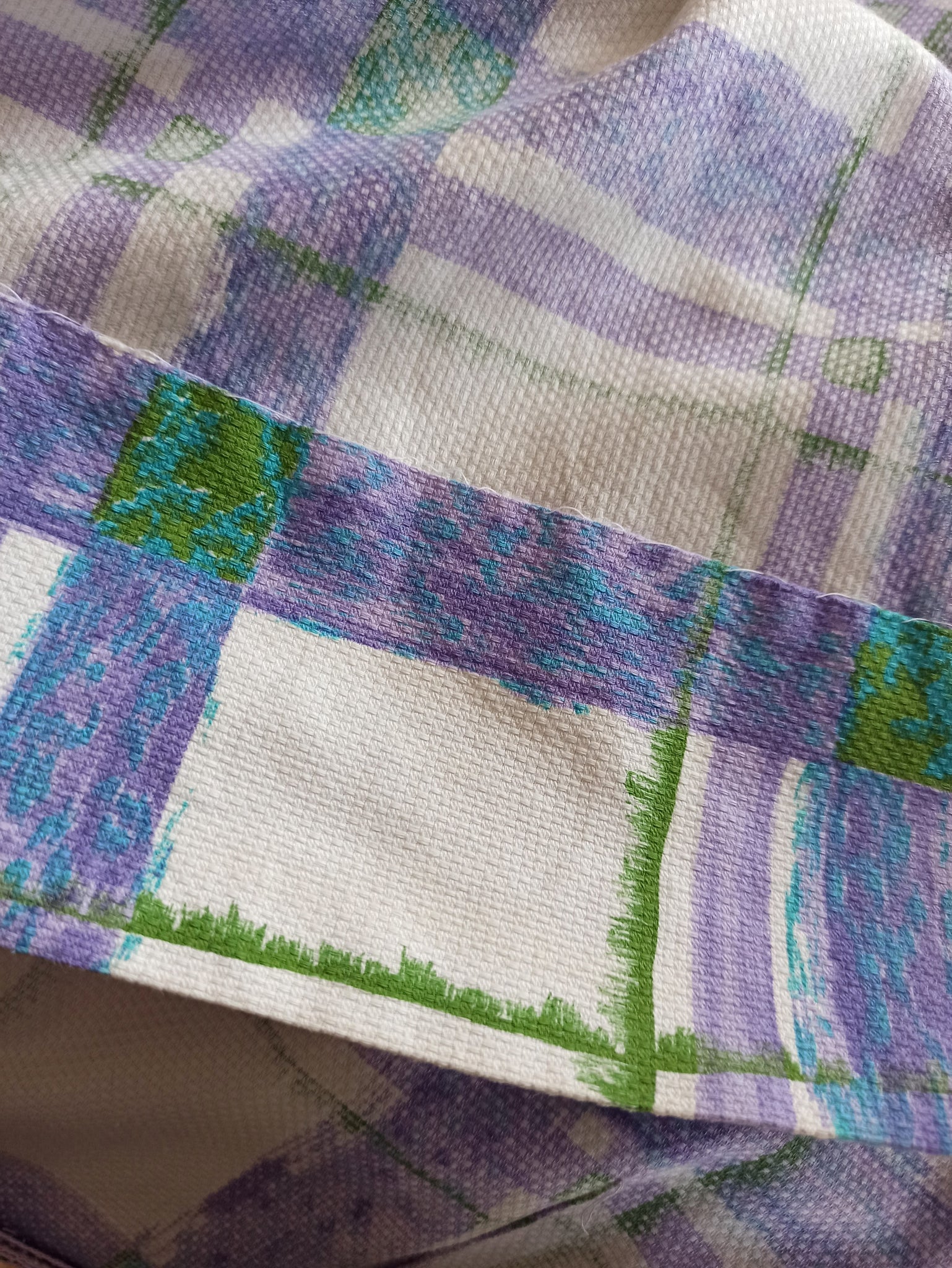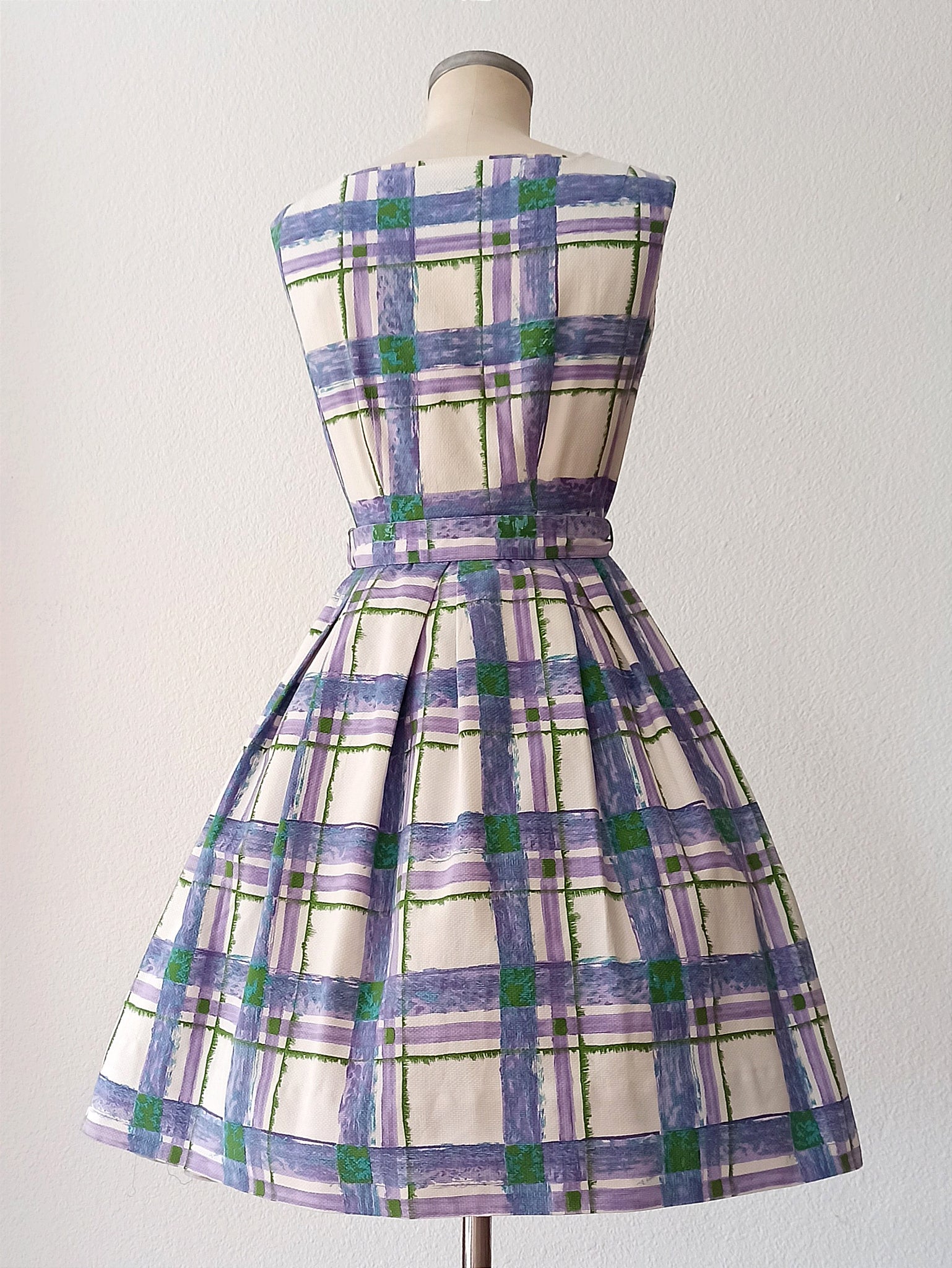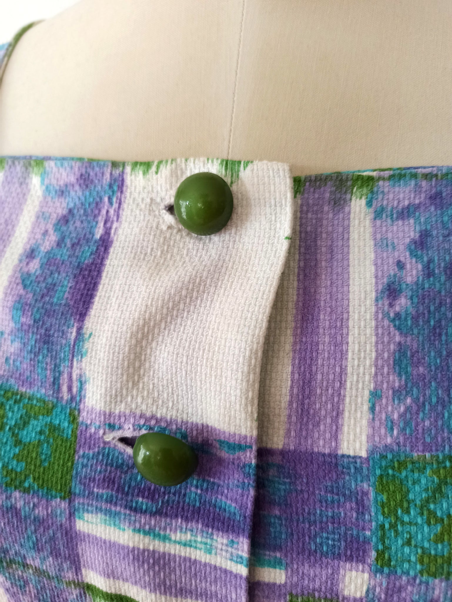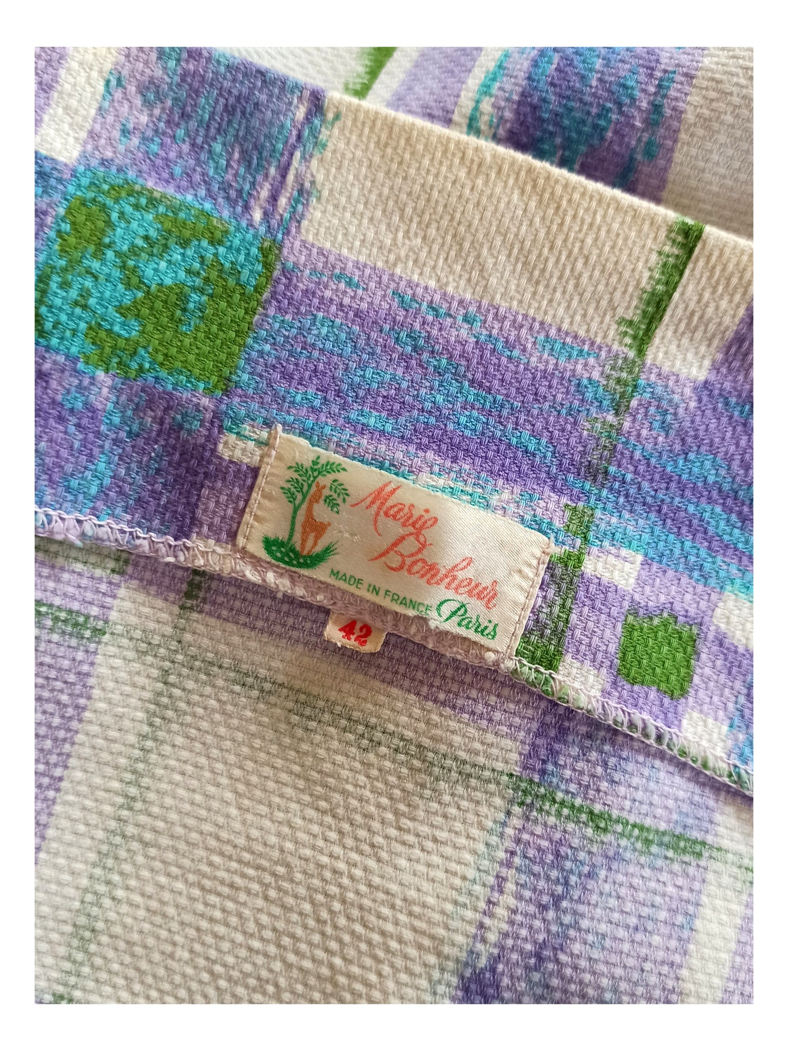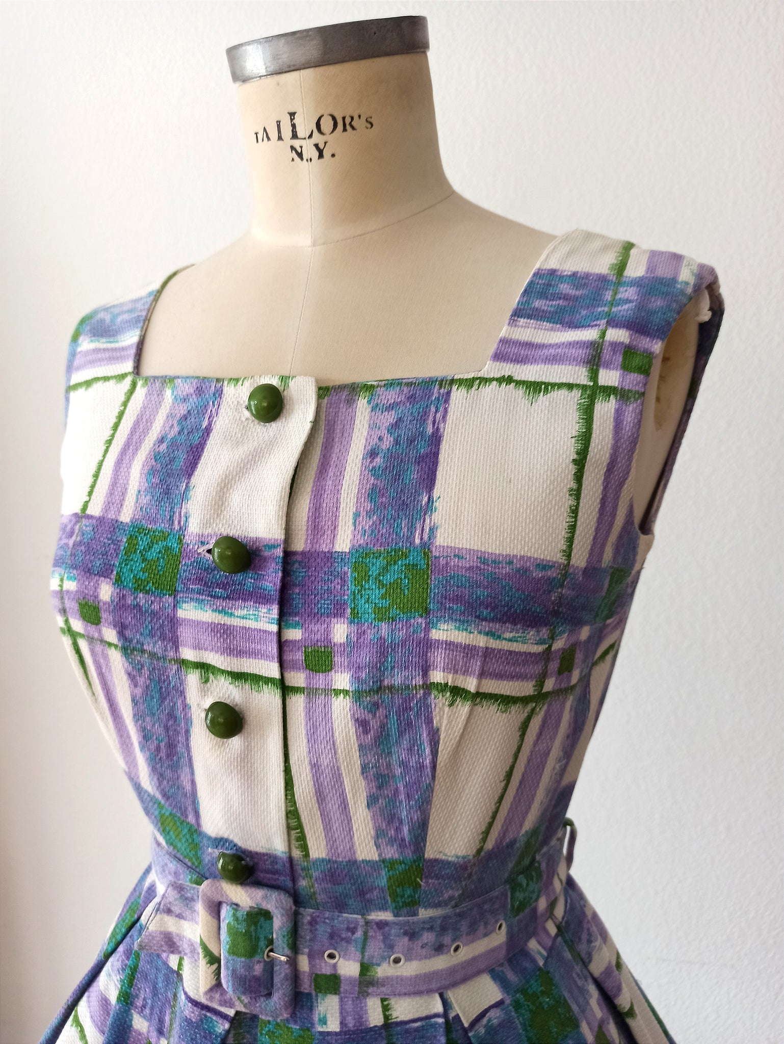 This is a truly adorable dress from the late 1950s or very early 1960s by Marie Bonheur, Paris. The fabric is top quality textured cotton in white, green and purple. She has an exquisite tailoring with a very nice neckline and four ball shaped green front buttons. Matching belt!