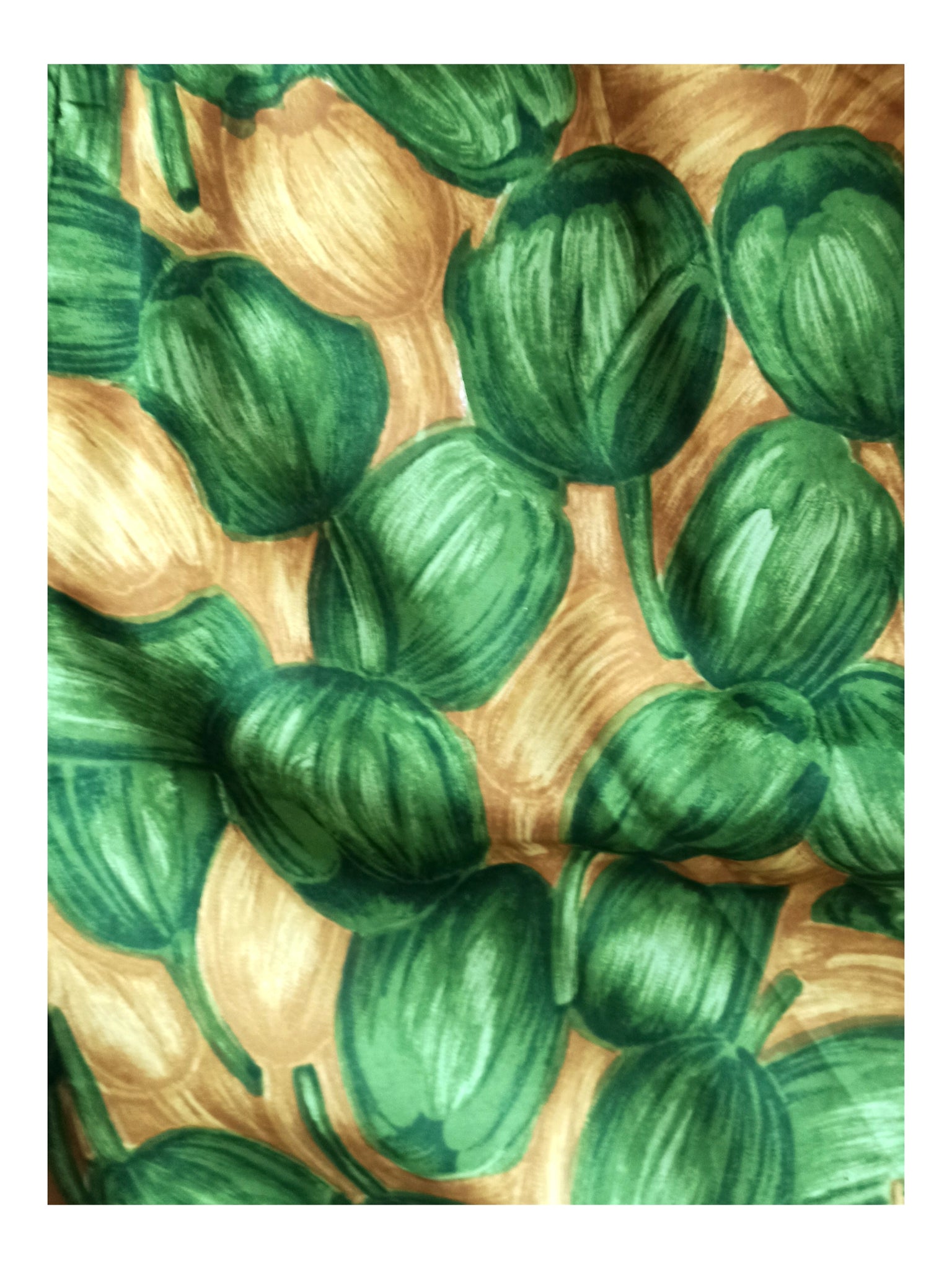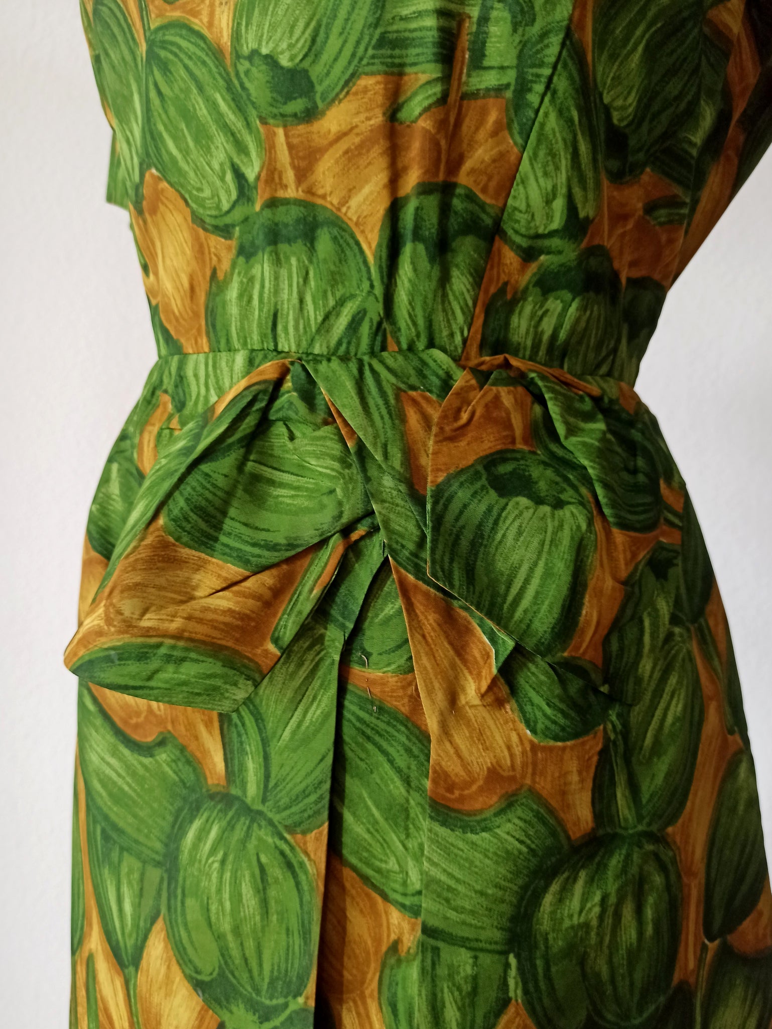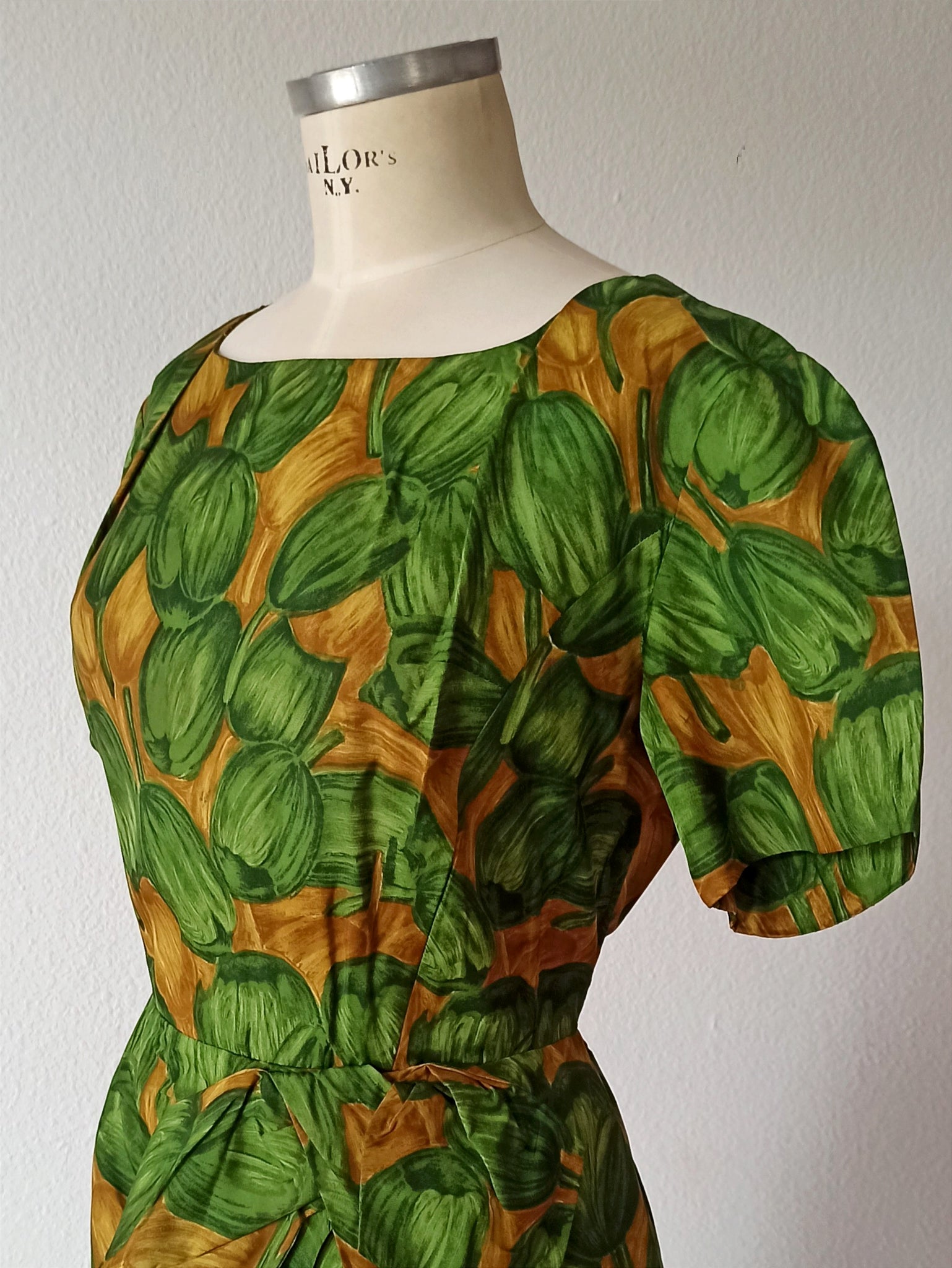 This is a stunning dress from the very late 1950s or very early 1960s. The fabric is a precious satin silk with an amazing floral print in golden brown and green. Exquisitely tailored. She has a beautiful neckline and a precious design on the hips. Fully lined. She closes with a back zipper.