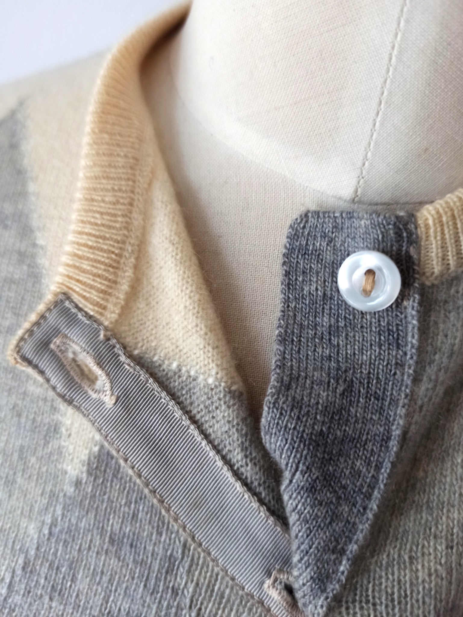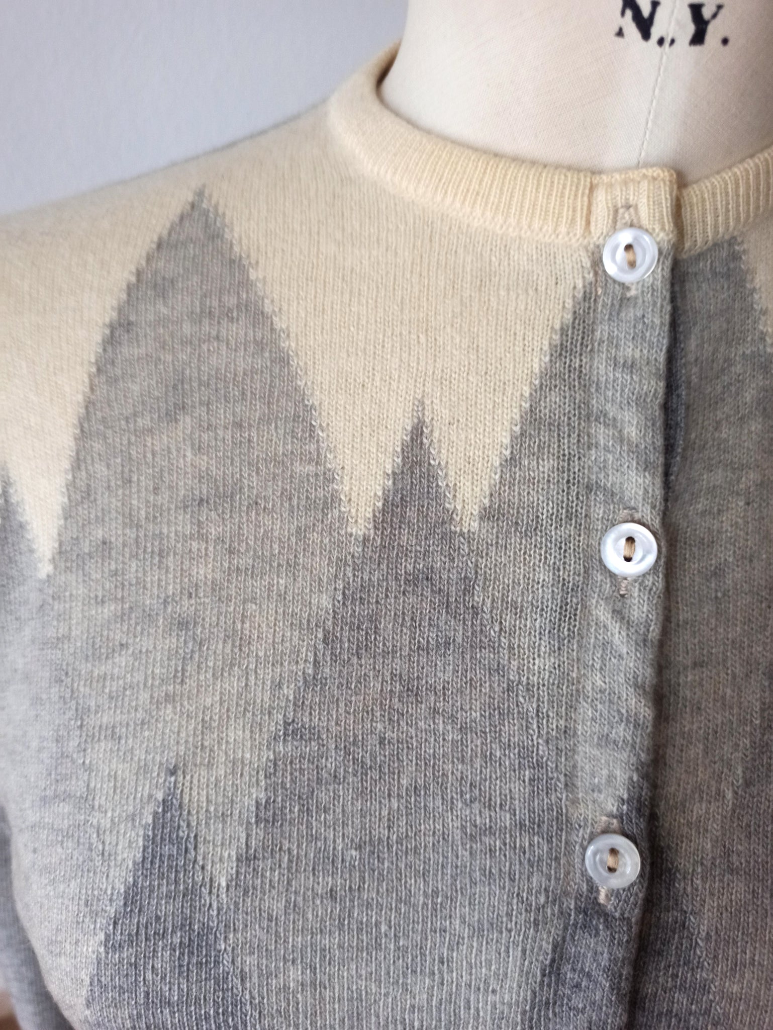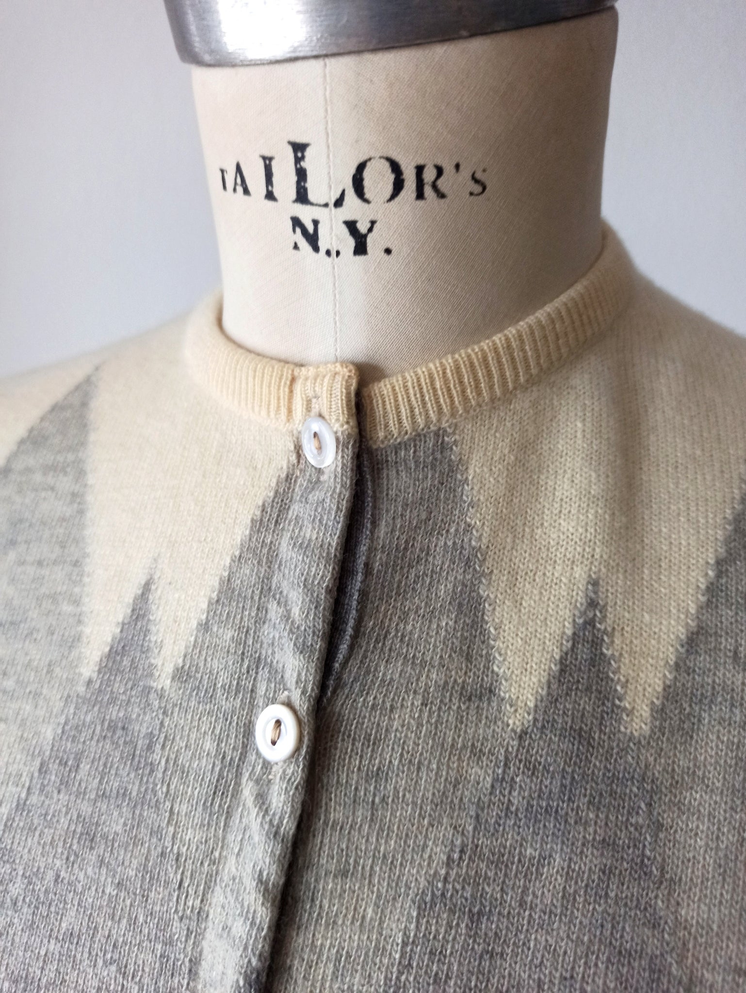 This is an iconic Intarsia cardigan from the 1950s by Ballantyne, Scotland producing for Marshall Field & Company. 100% Cashmere in a beautiful greyscale, neckline and upper part is beige color. Extremely soft.