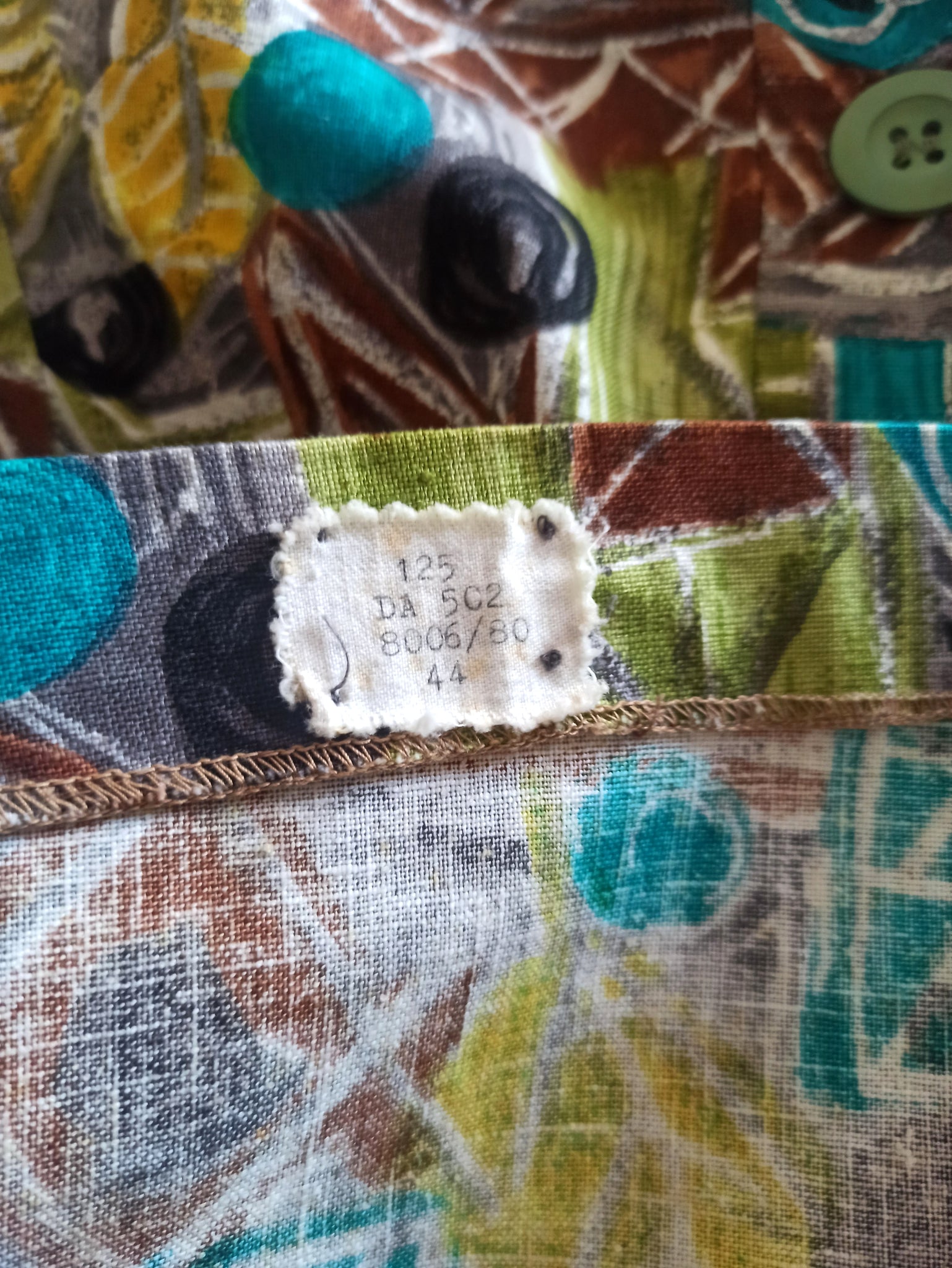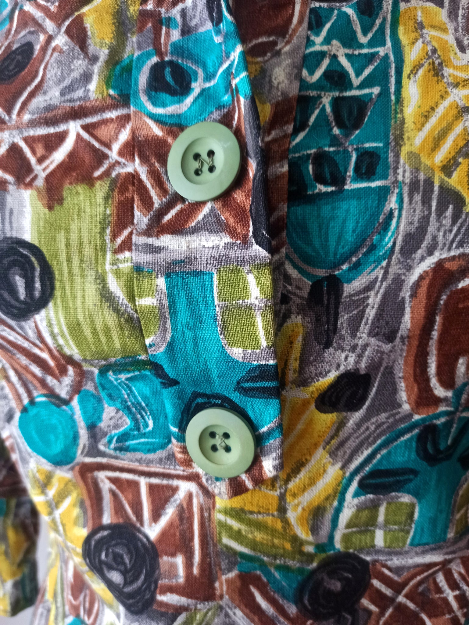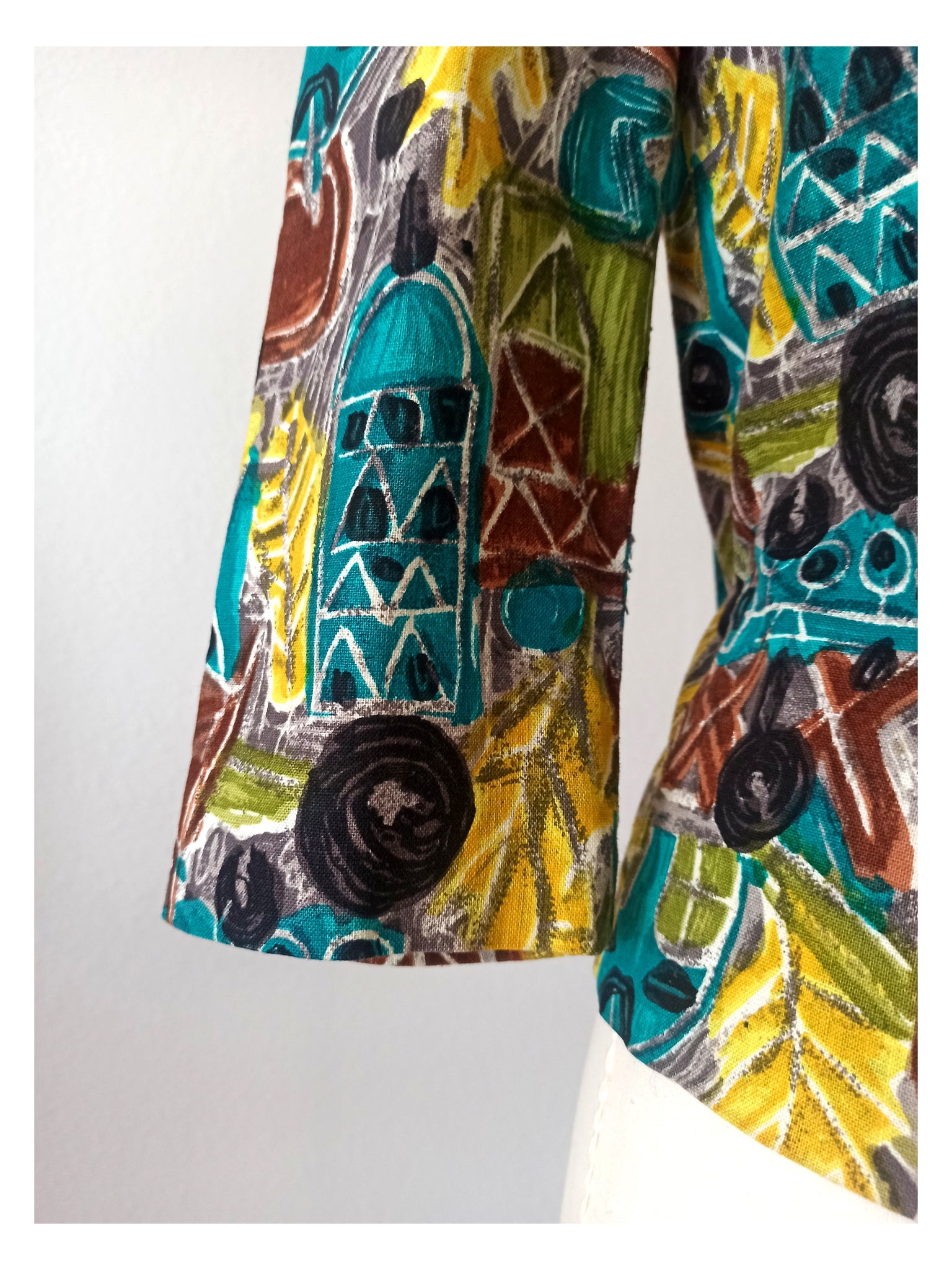 This is a fabulous top from the 1950s in like new condition. The fabric is top quality cotton, feels like linen, with an amazing and busy novelty print with buildings and other shapes. Gorgeous fit and very cool look with a pair of capri pants! Tag reads size 44.
