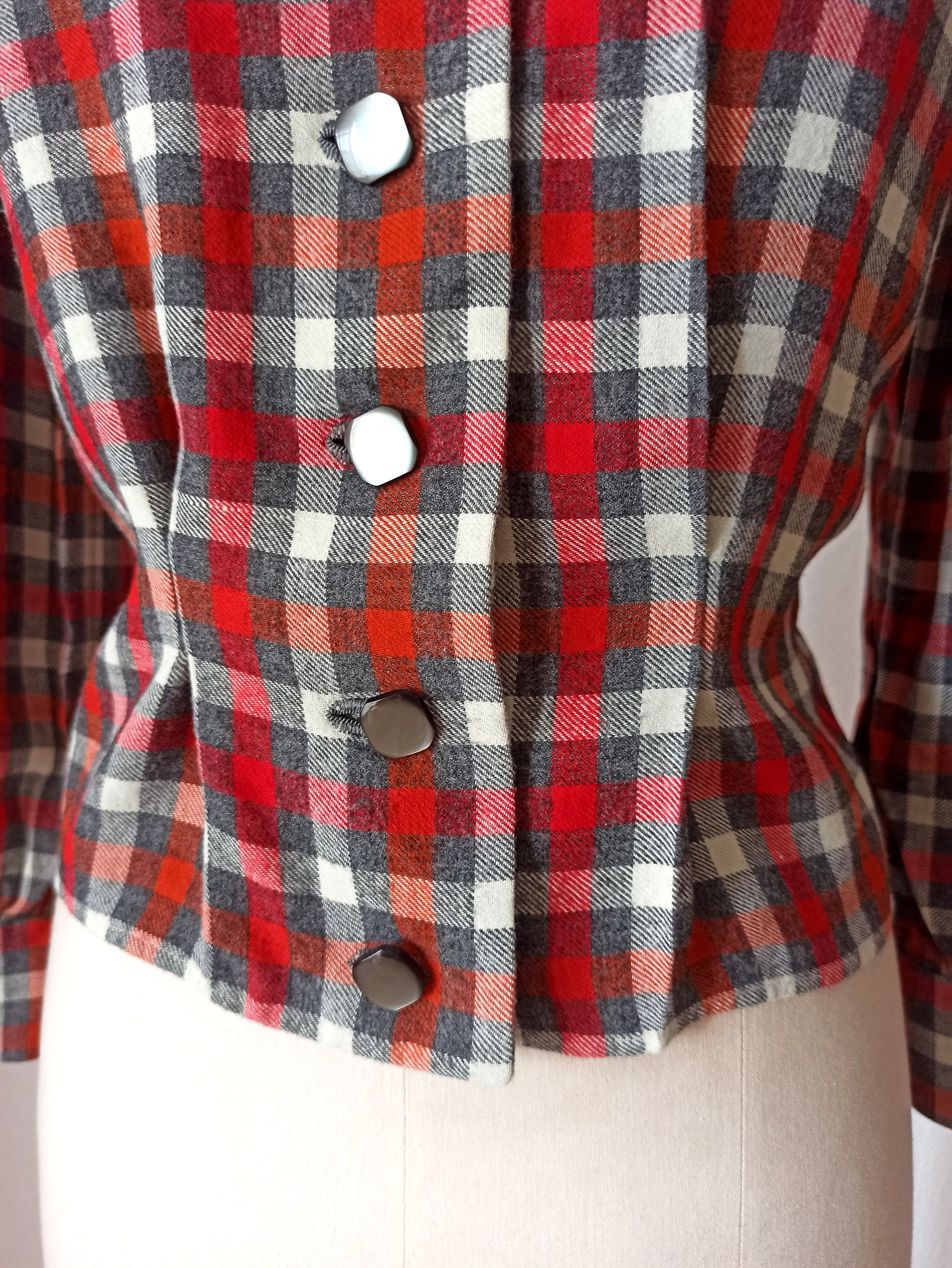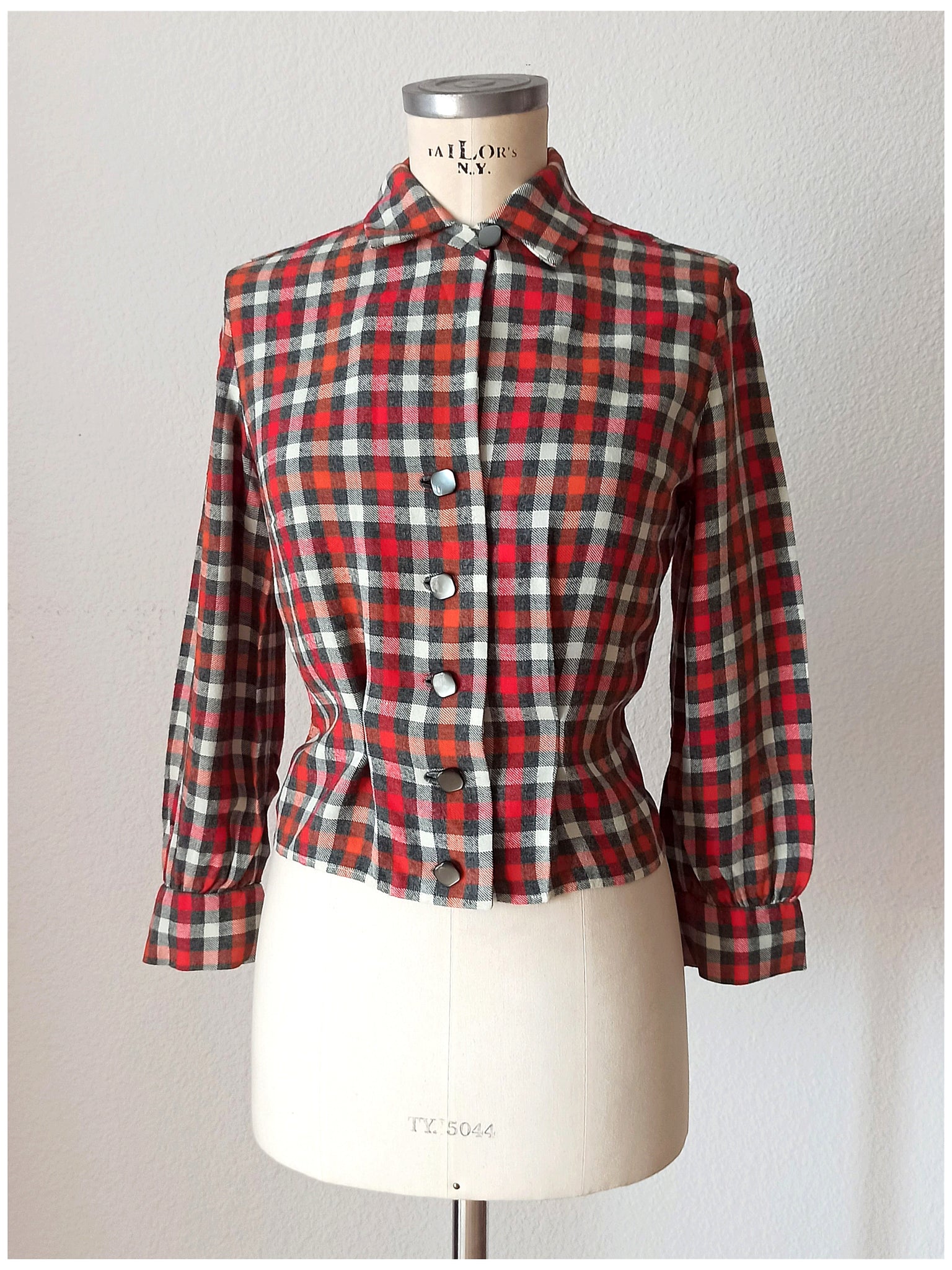 This is a gorgeous blouse from the early 1950s. The fabric is a super soft plaid flannel wool in red, grey and white. Beautiful shape with front vertical waist seams. She closes with front buttons.