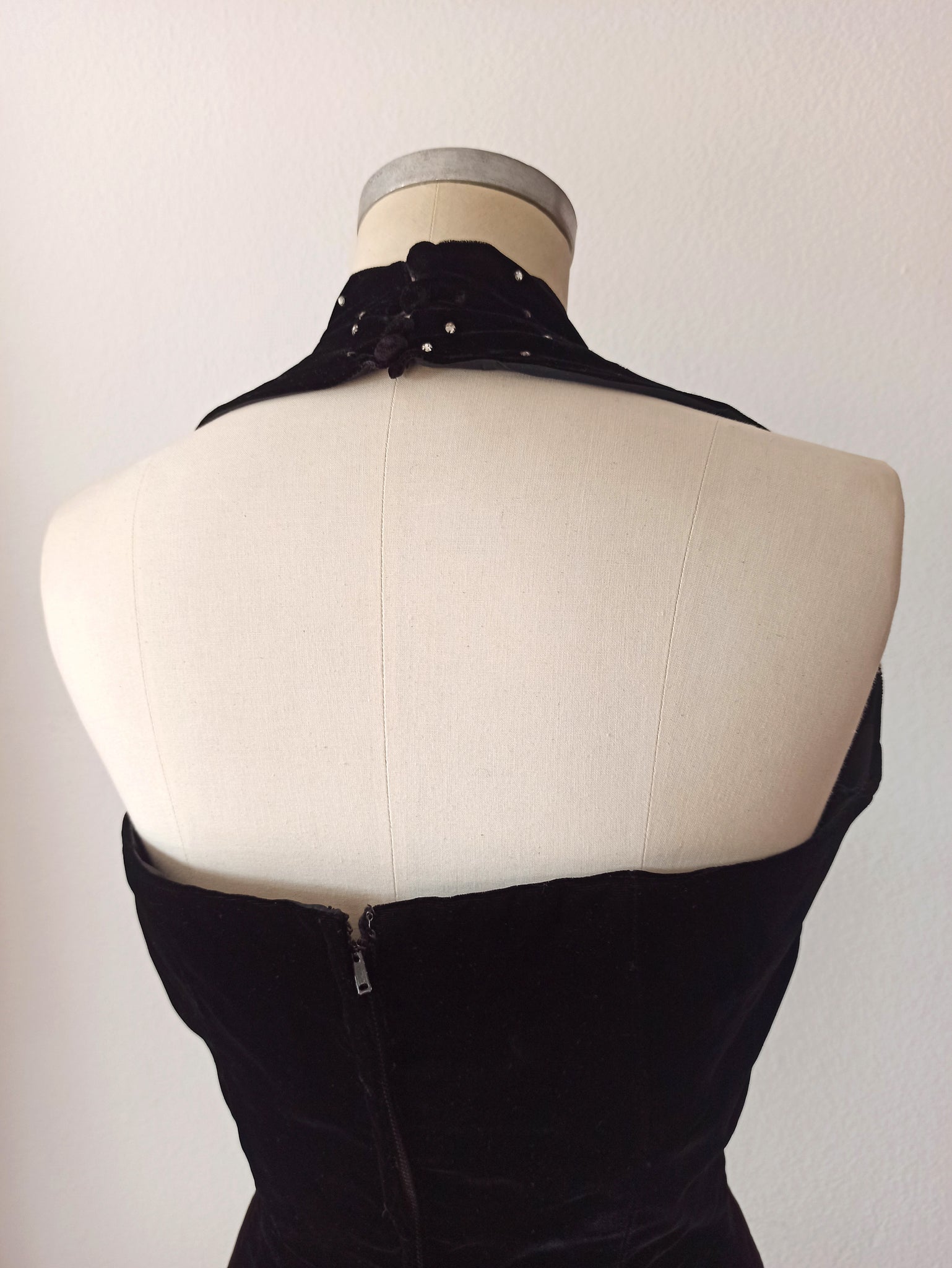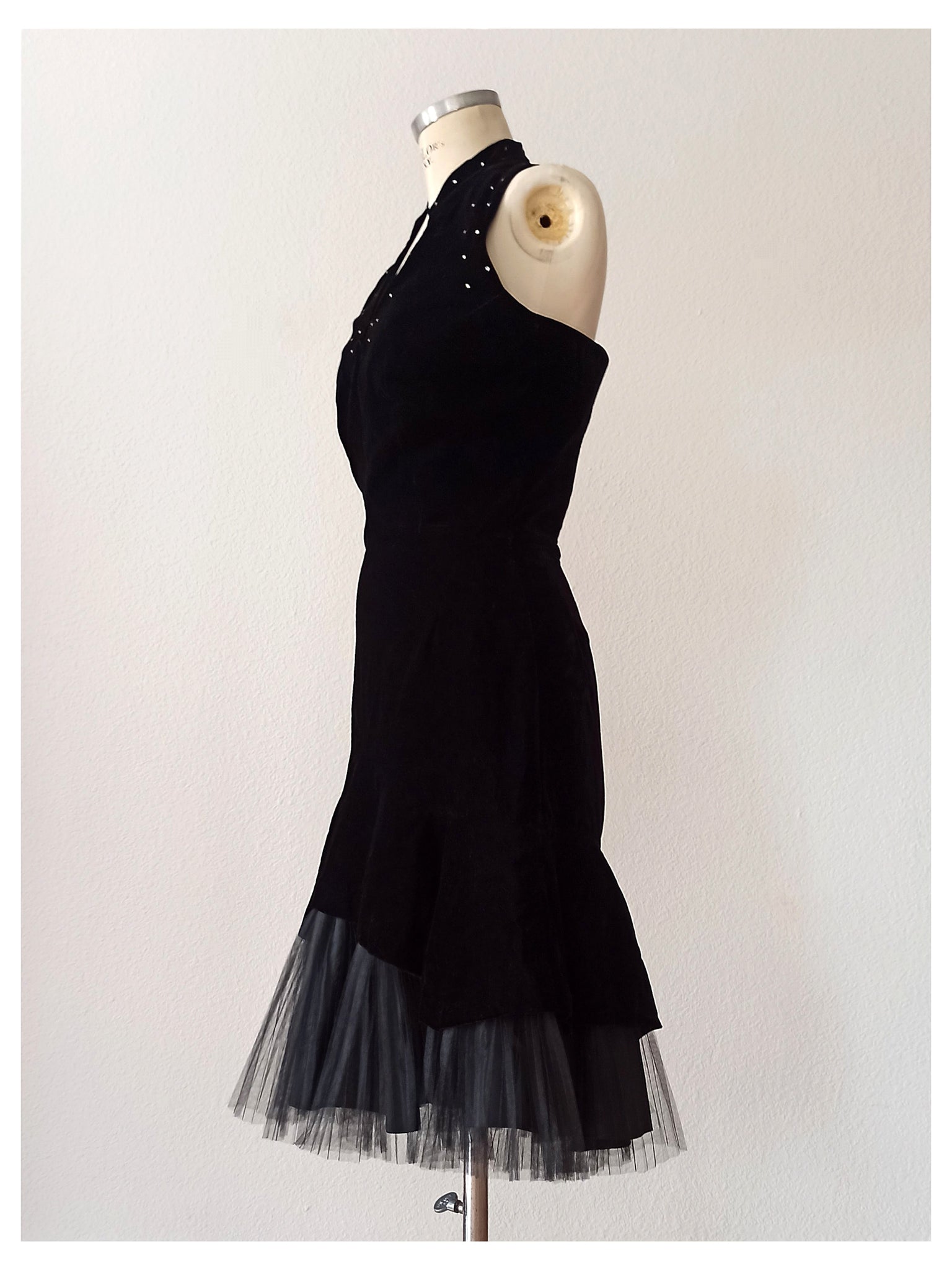 This is a stunning dress from the 1950s. The fabric is a very soft velvet in a solid black color. She has a superb halter neckline full of rhinestones. The neckline closes on the back with loop buttons. Hyper curvy cut with a fabulous fishtail finished with black lace. Fully lined and the bodice is boned. She closes with back metal zipper.