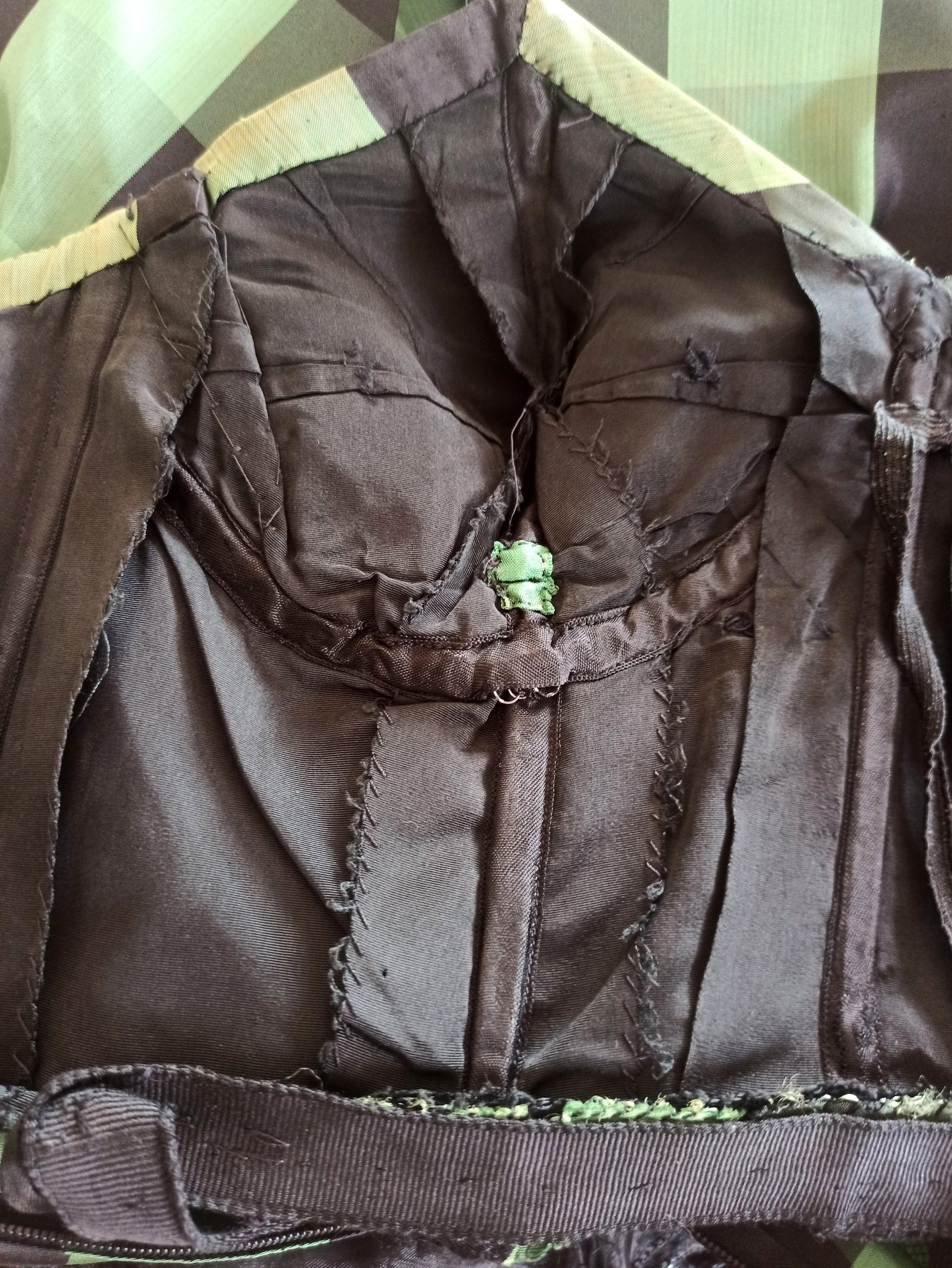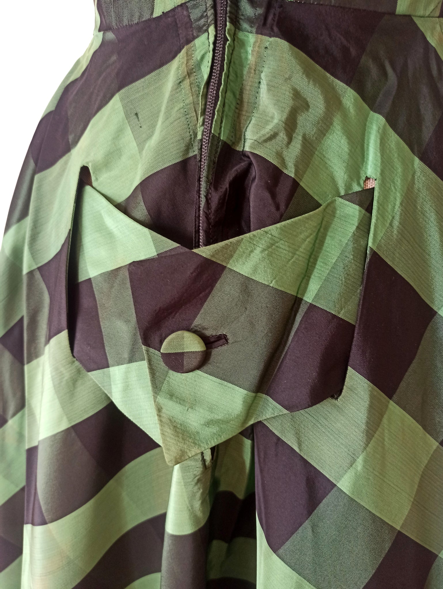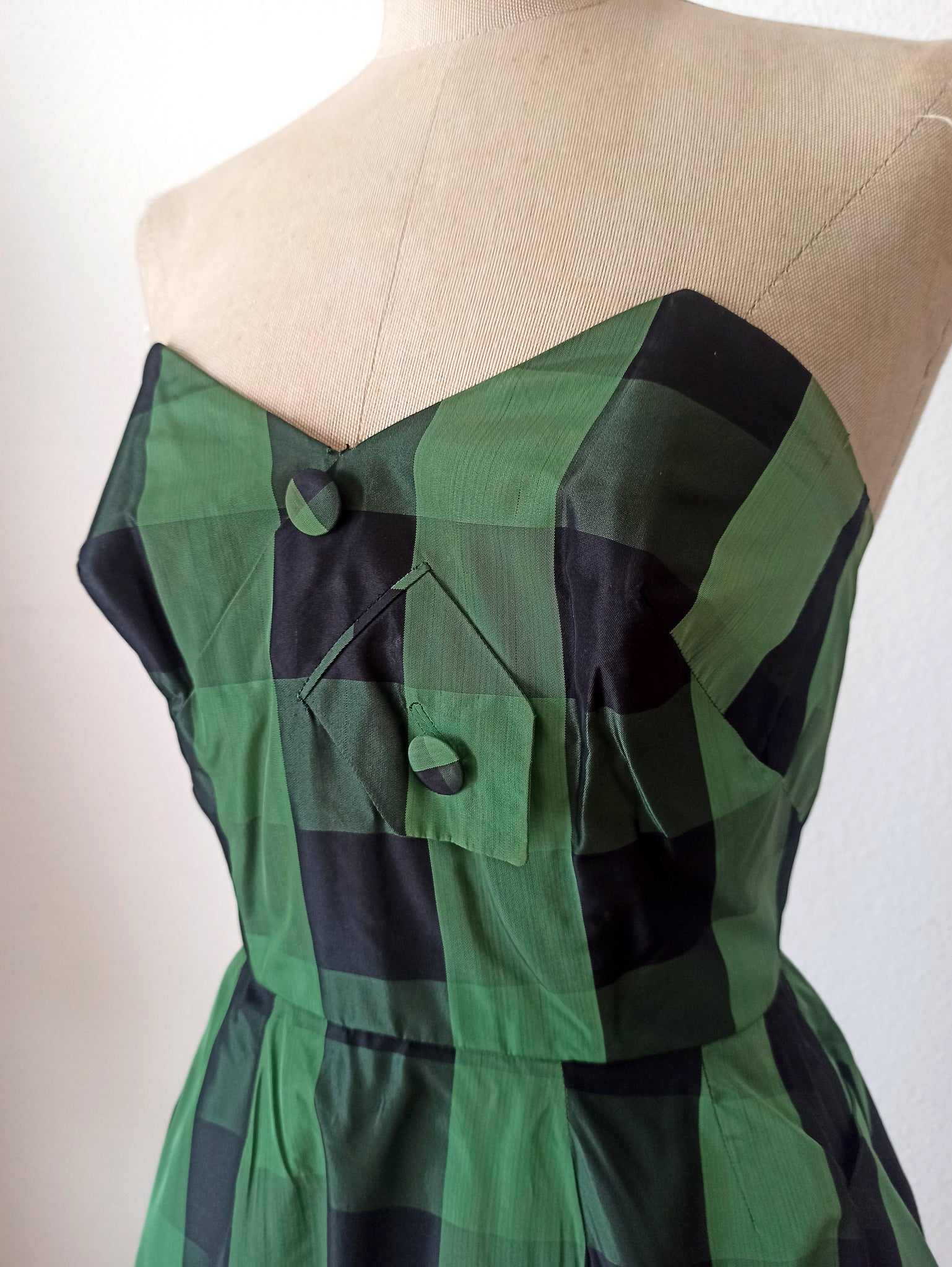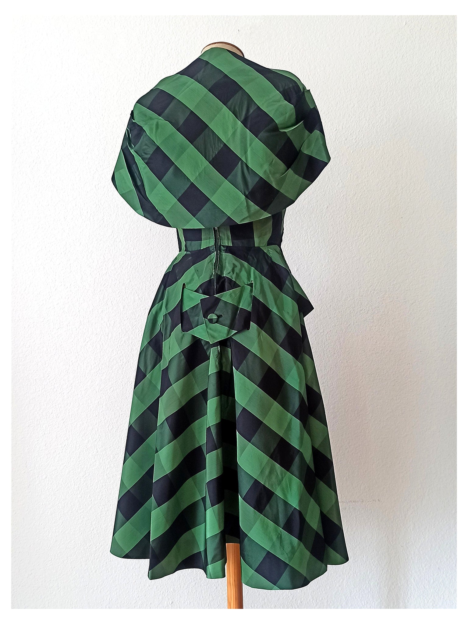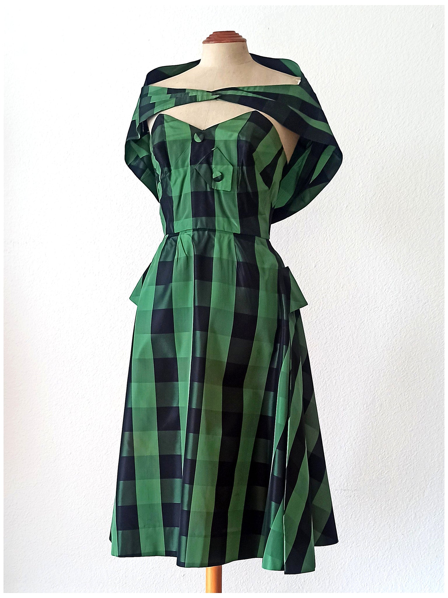 This is an spectacular dress from the 1950s. The fabric is high quality satin in green and black. She has an incredibly gorgeous strapless boned bodice and a fabulous skirt. This little matching cape is just delicious! She closes with a back metal zipper.