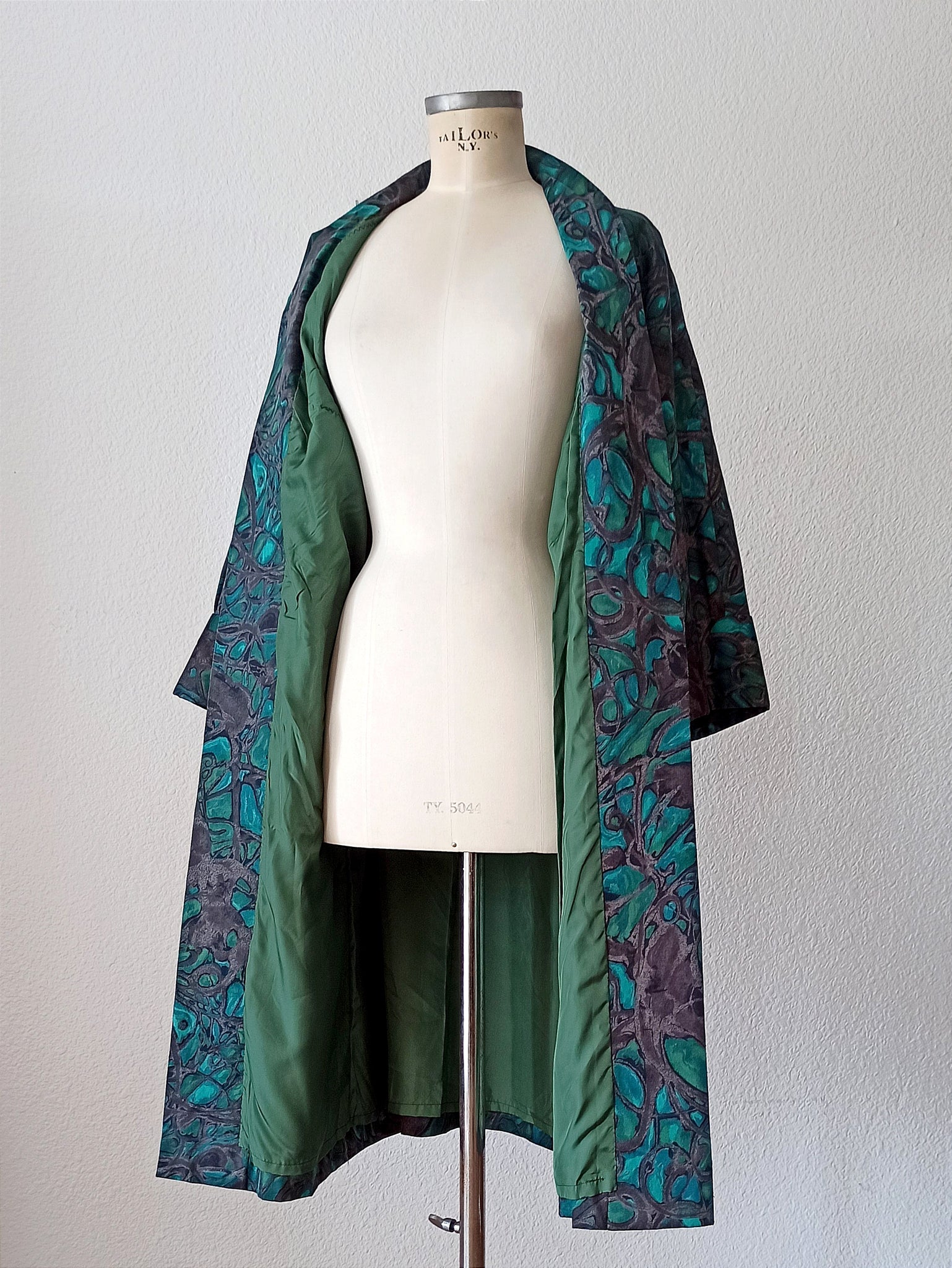 This is a stunning Spring/Summer coat or duster from the late 1950s. The fabric is a precious cotton silk with an amazing abstract print. She has an exquisite Kimono shape with wide cuffs. This garment looks fabulous and super elegant combined with a black night dress. Fully lined.