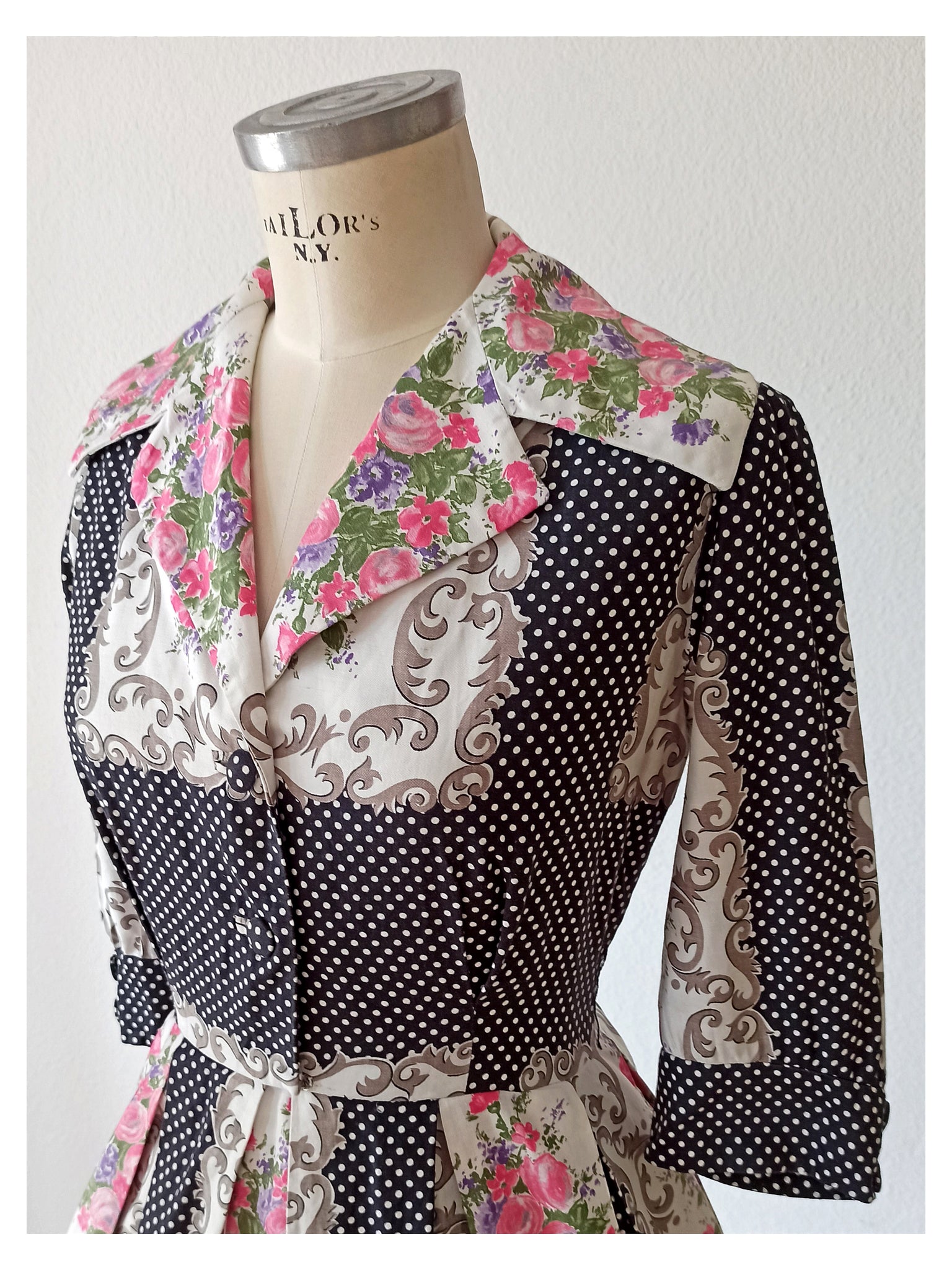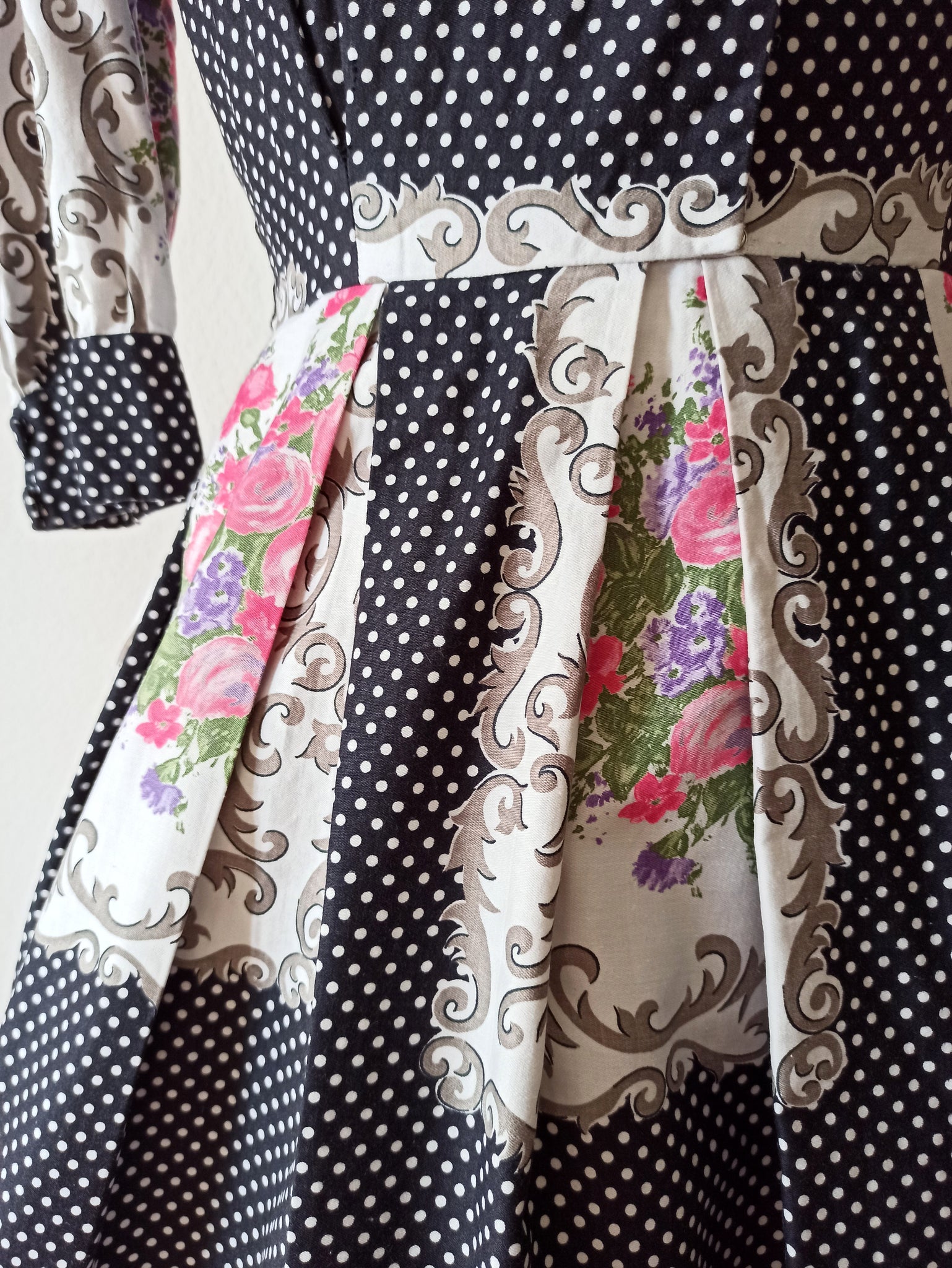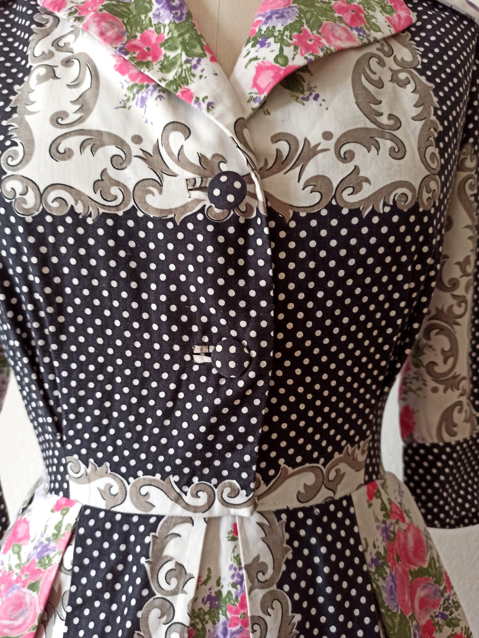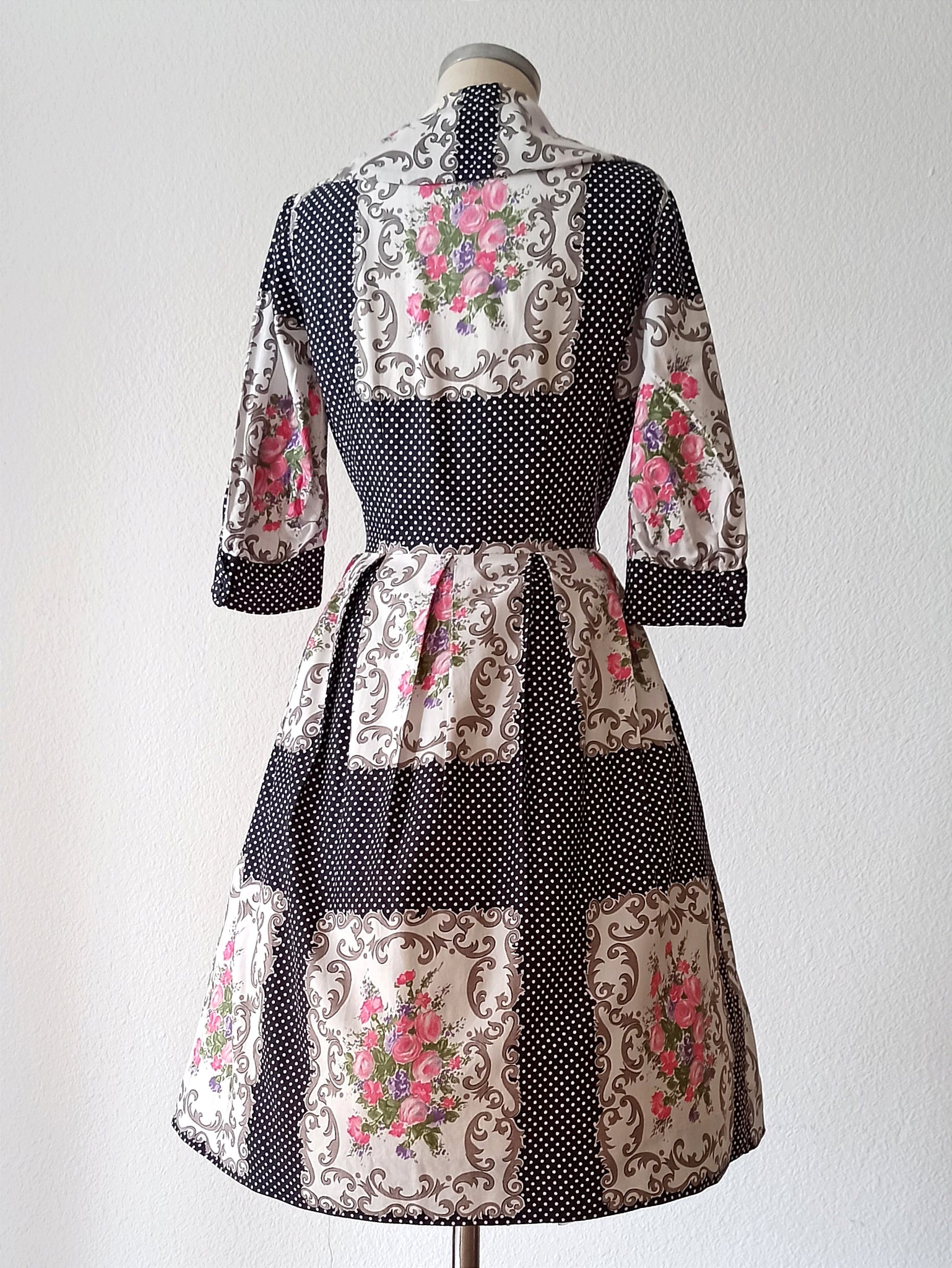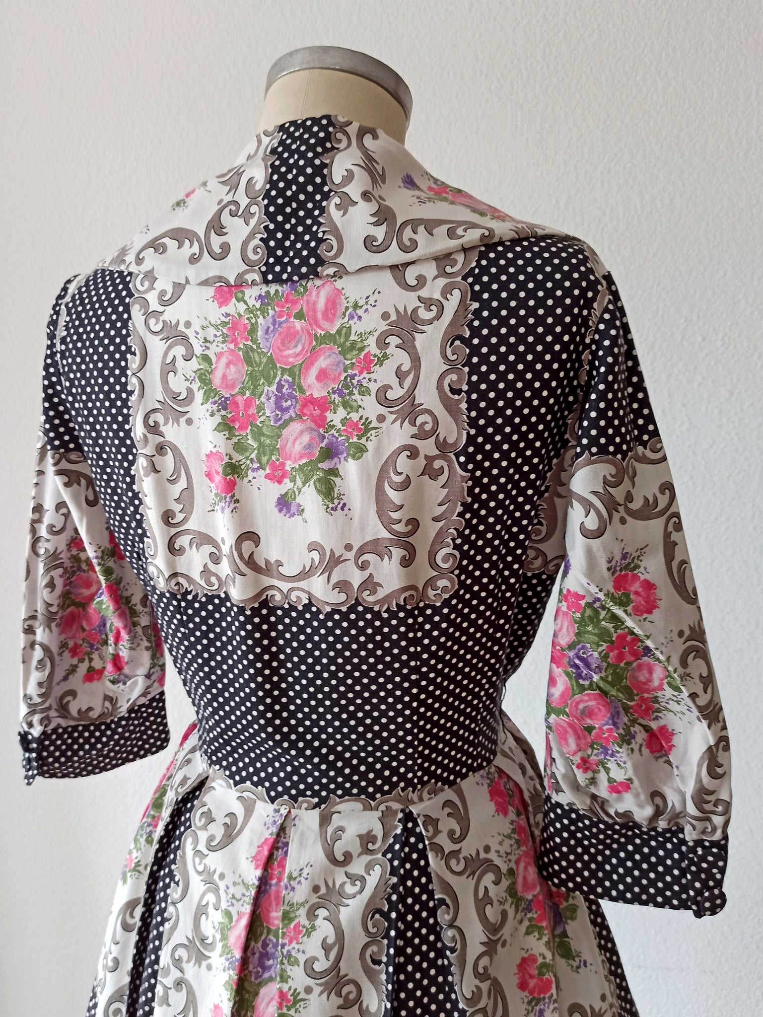 This is a stunning dress from the 1950s probably made in Germany. The fabric is a top quality cotton with a fabulous and unusual combination of a framed floral print with roses and a color block in black with white dots. Vibrant colors! She has a beutiful collar andn 3/4 cuffed sleeves. She closes with front buttons and snaps.