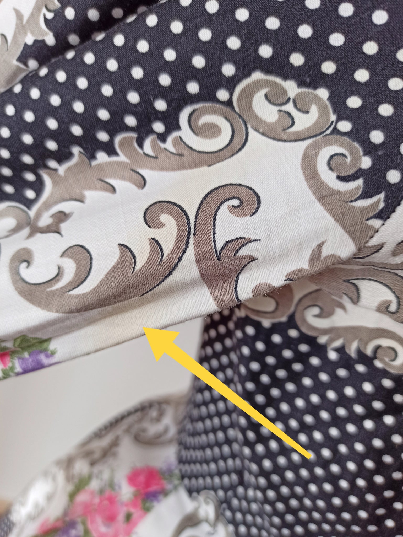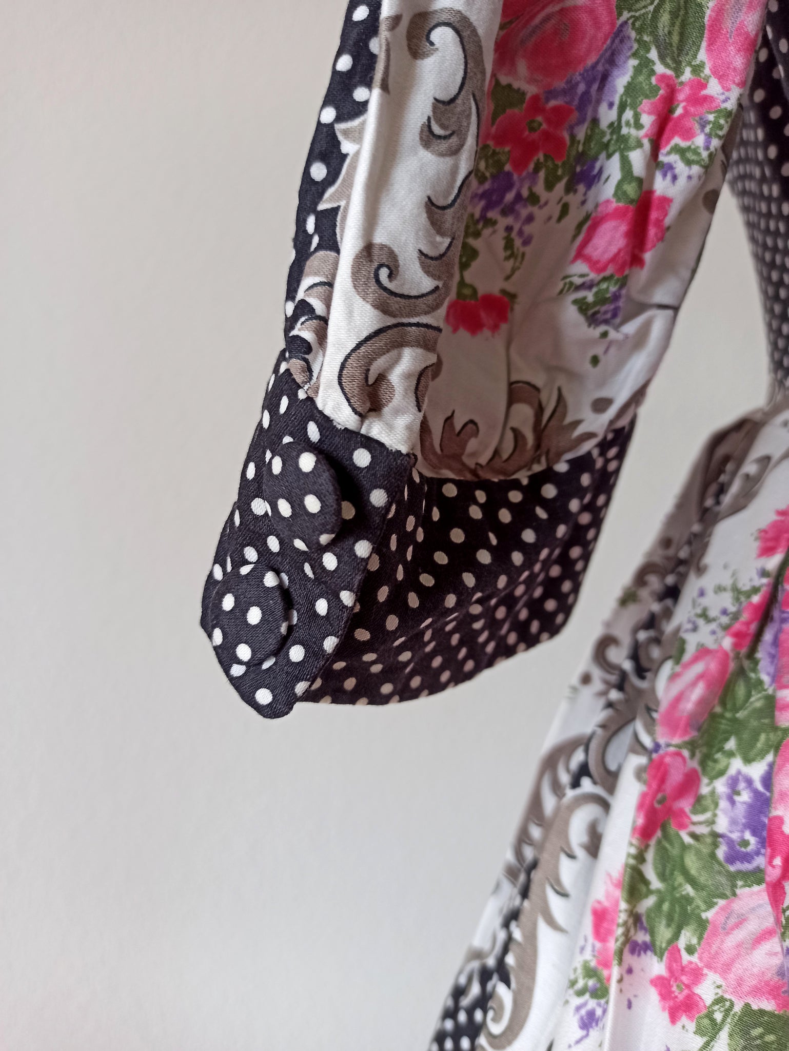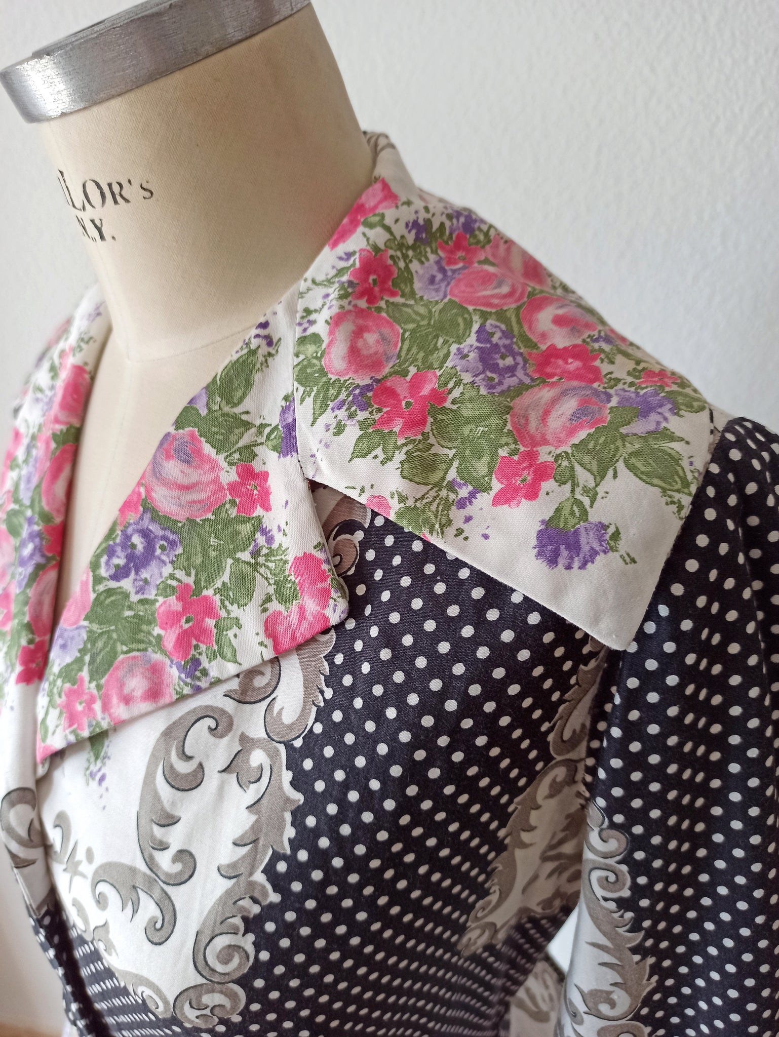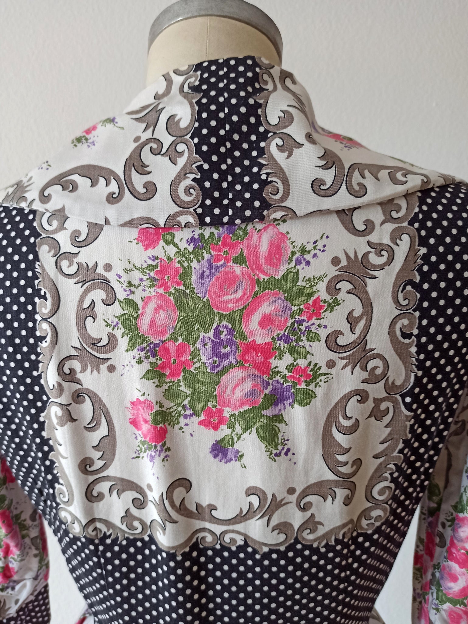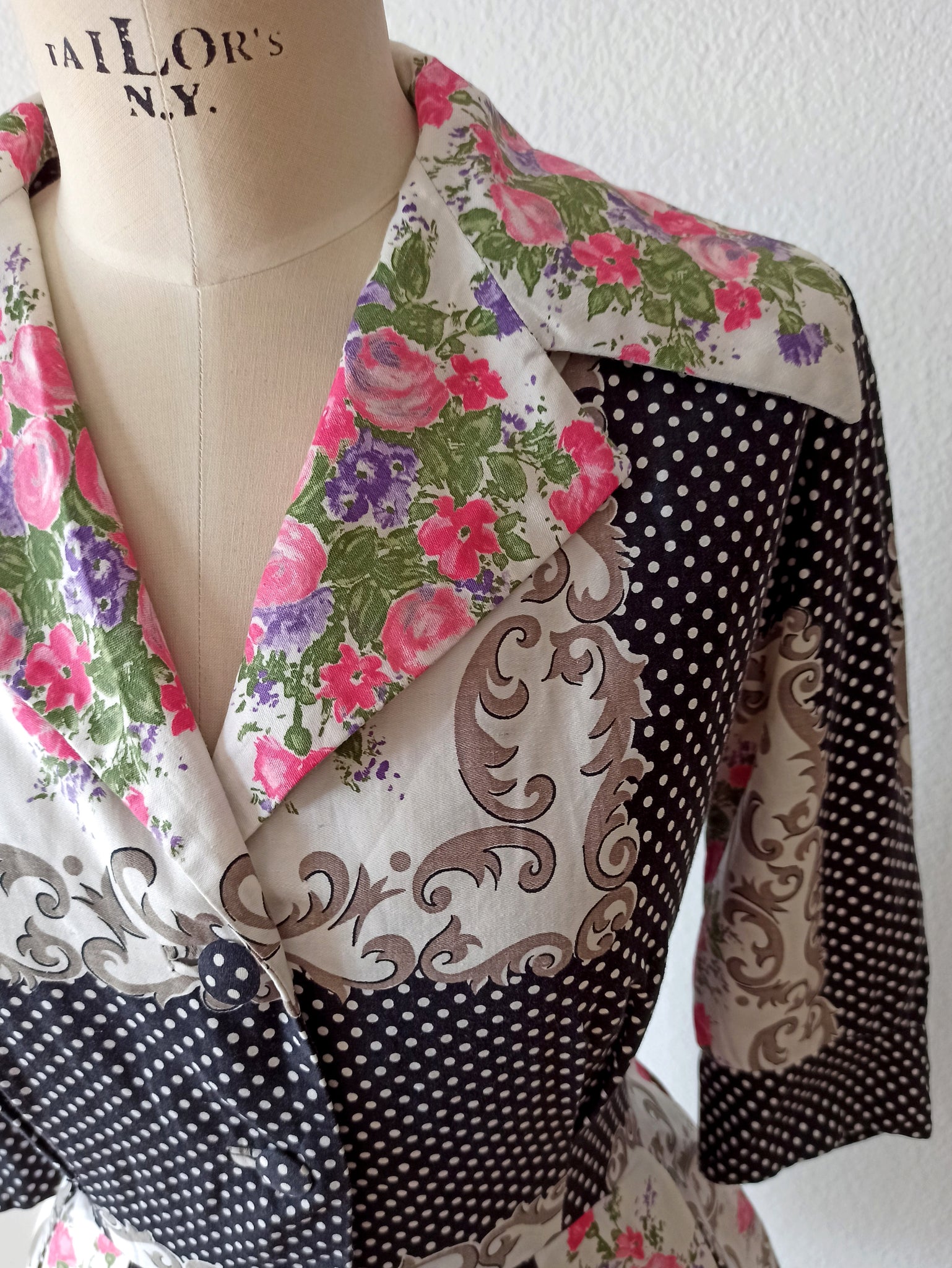 This is a stunning dress from the 1950s probably made in Germany. The fabric is a top quality cotton with a fabulous and unusual combination of a framed floral print with roses and a color block in black with white dots. Vibrant colors! She has a beutiful collar andn 3/4 cuffed sleeves. She closes with front buttons and snaps.