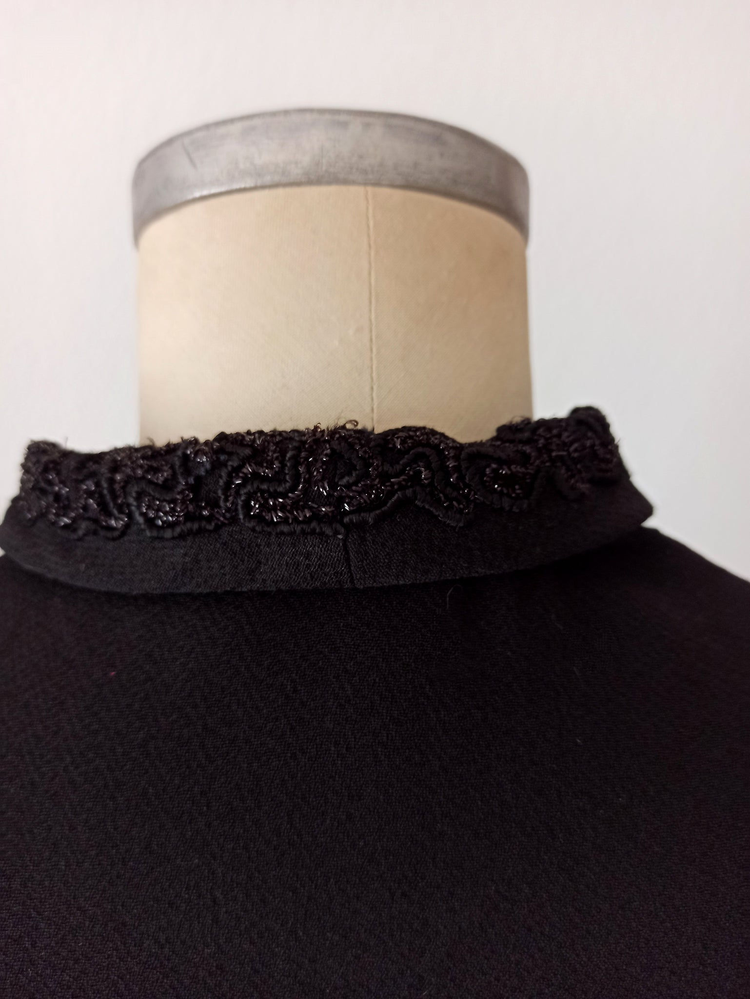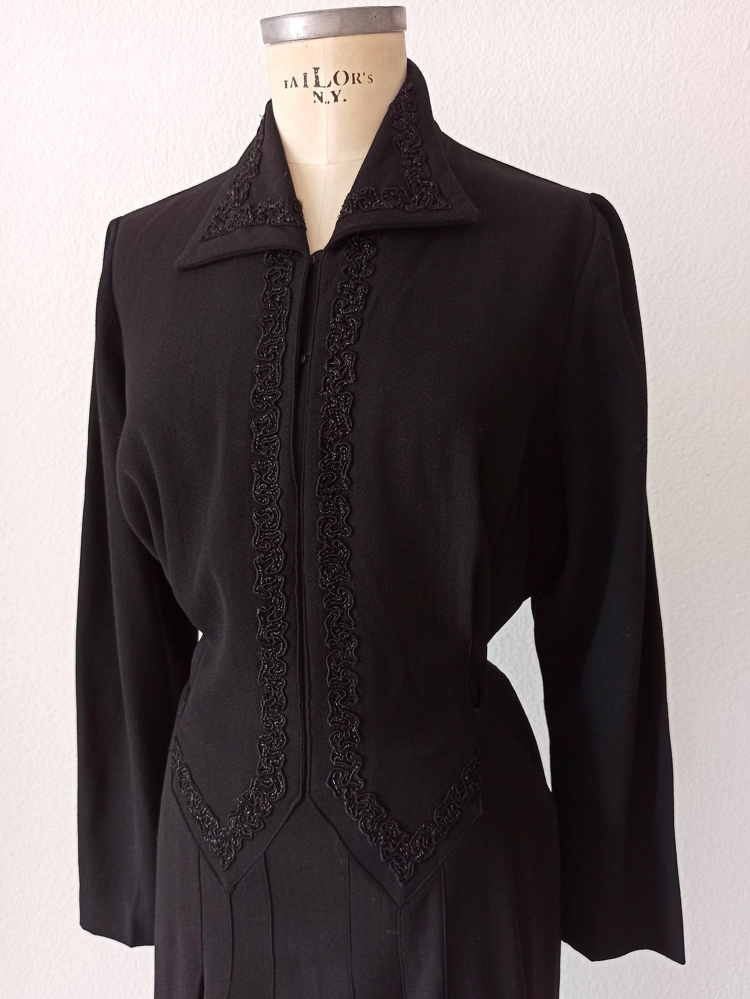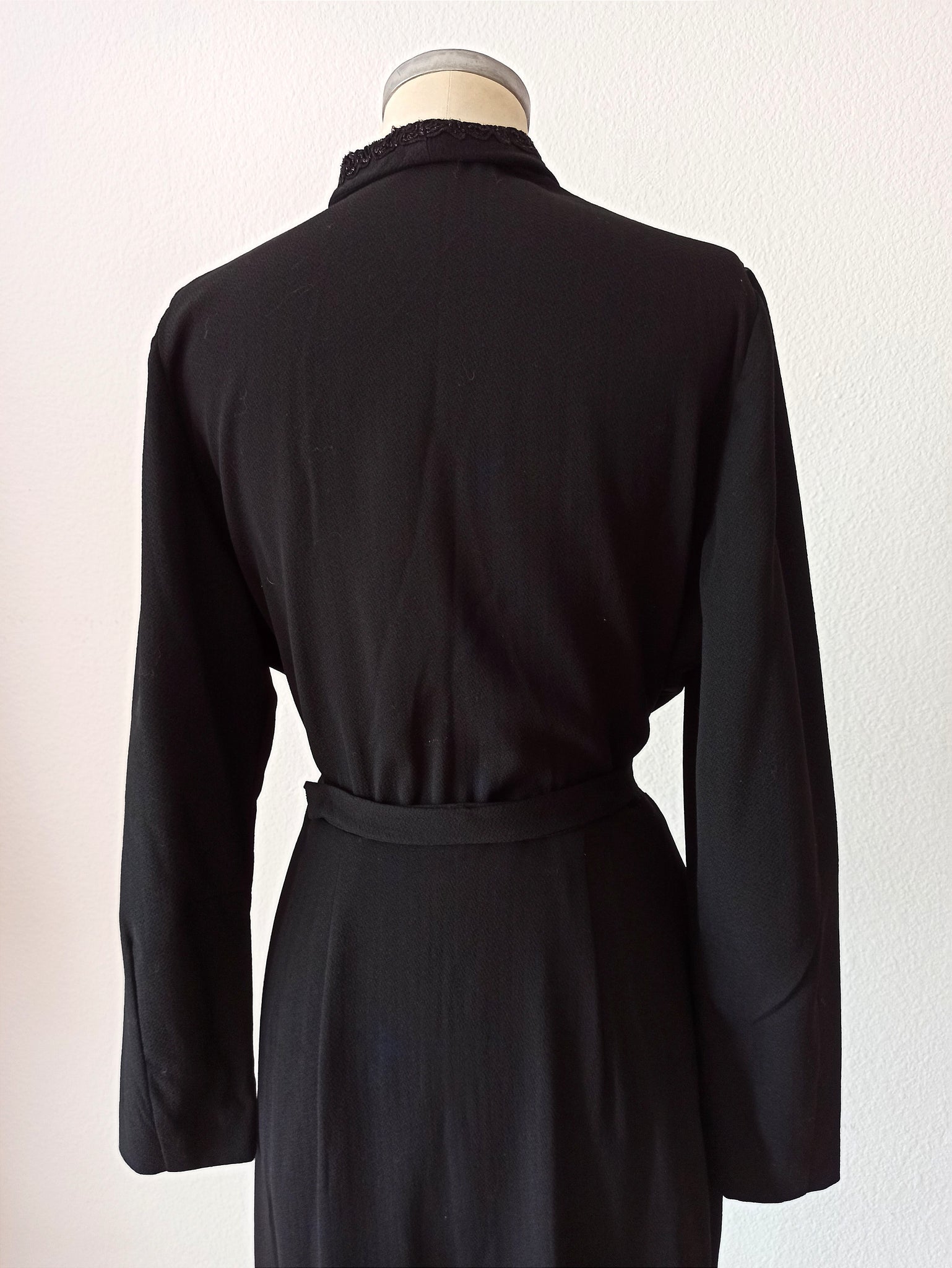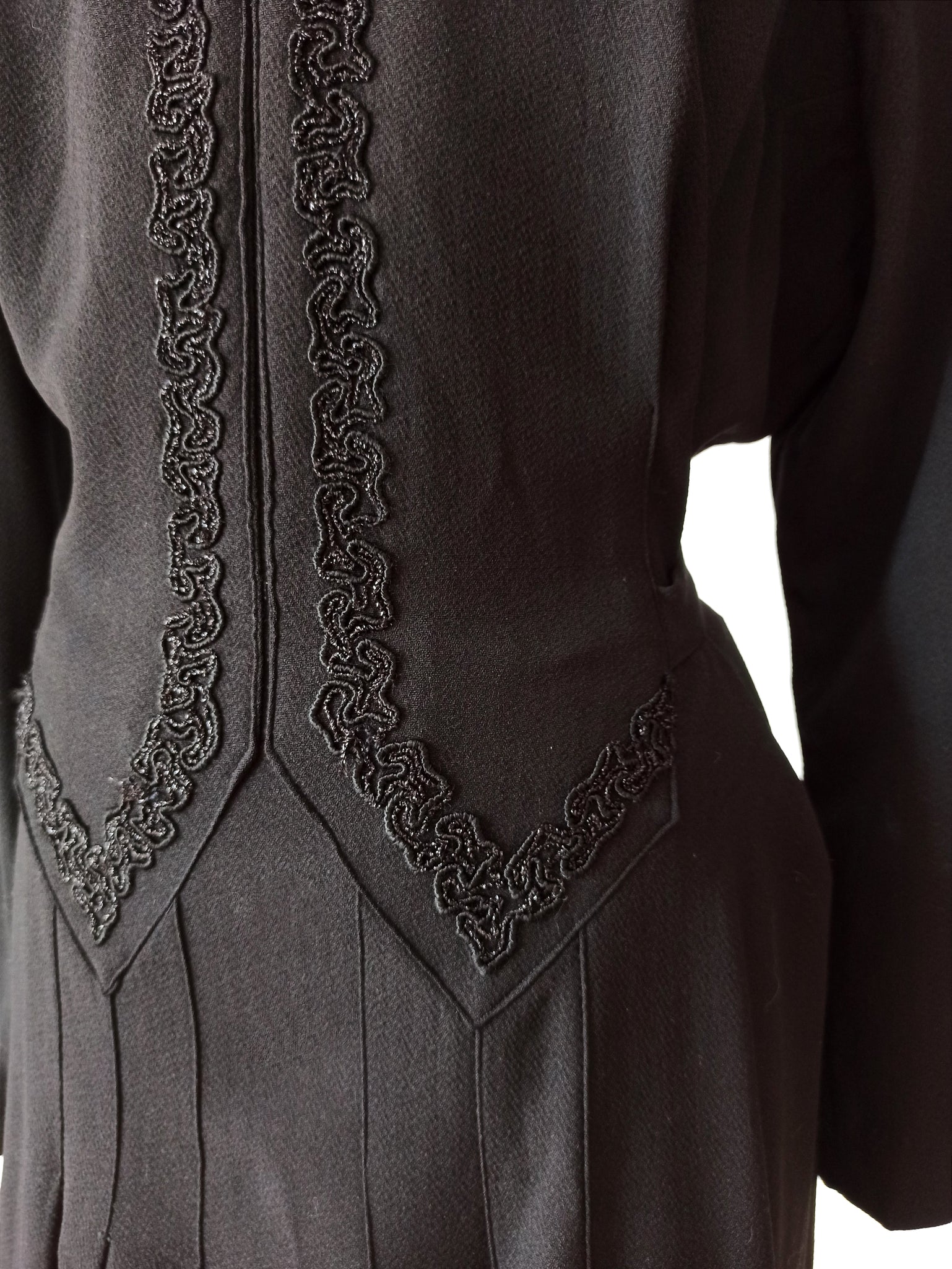 This is a superb dress from the 1940s. The fabric is a black gabardine wool of a very good quality. Exquisite collar and front design, beautifully shaped. The waist has to be adjusted with a belt from the sides to the back.