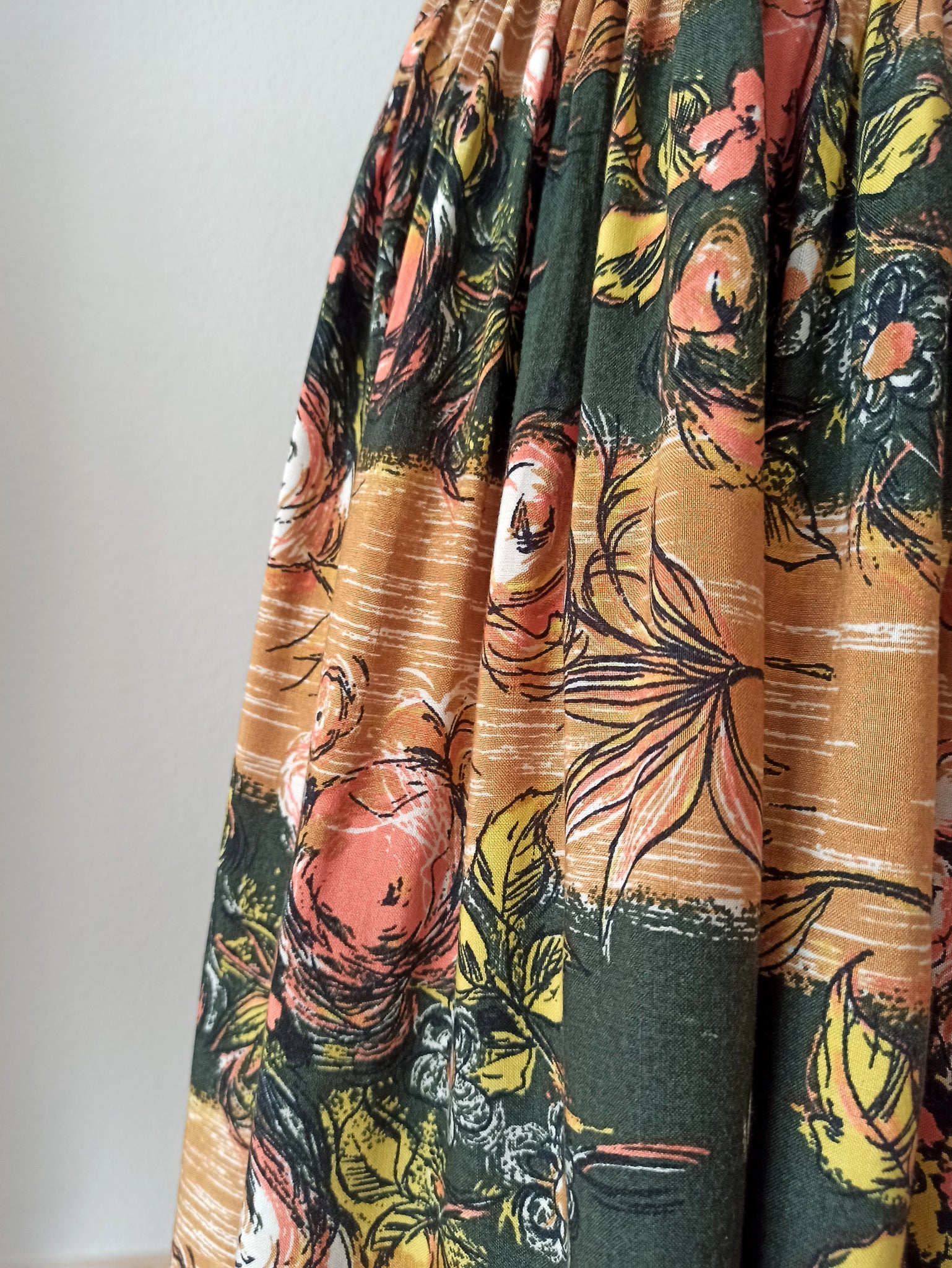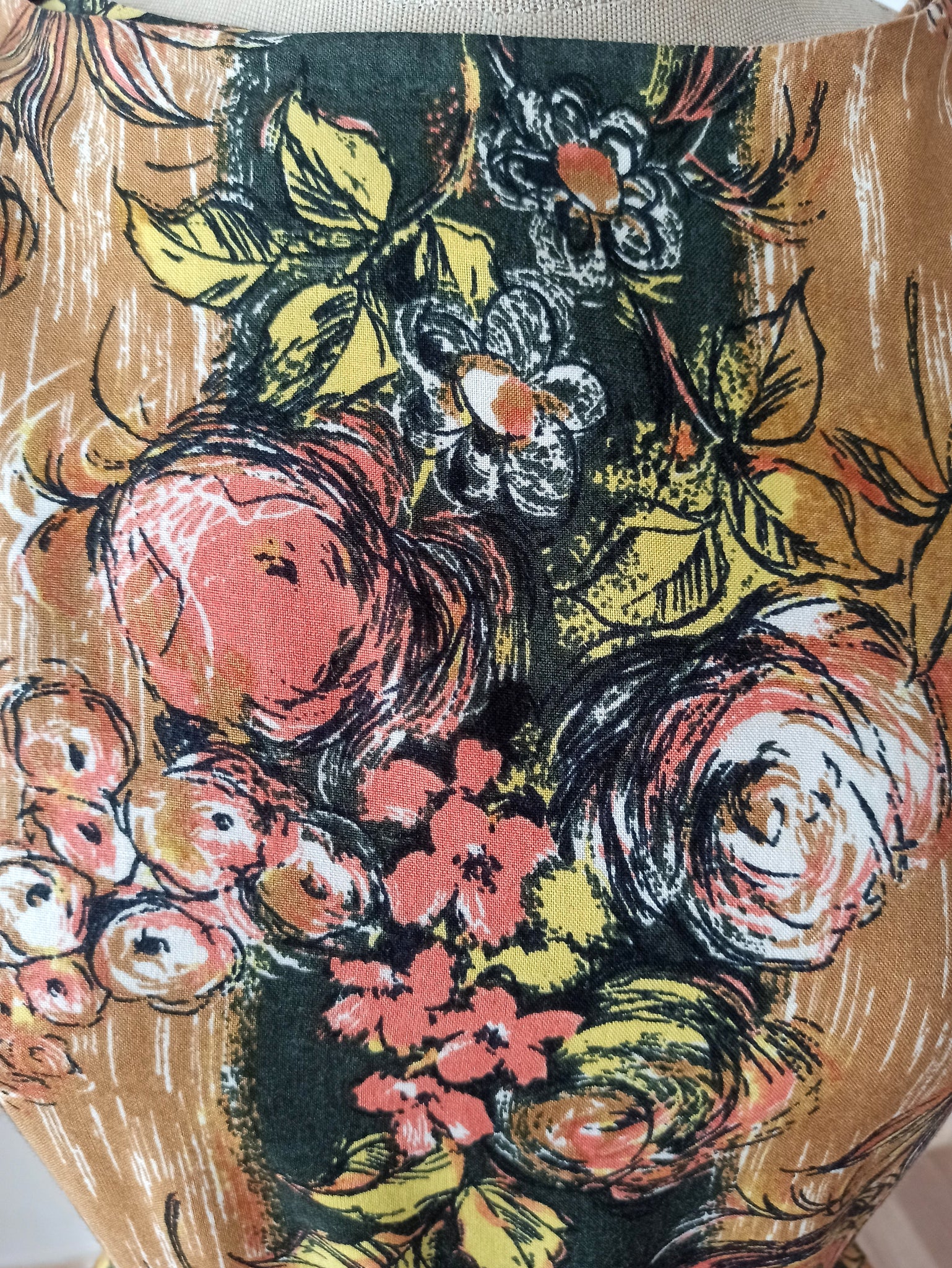 This is a truly stunning dress from the late 1940s or early 1950s. The fabric is rayon with an amazing floral novelty print, delicious colors! The background is dark green and light brown. She looks simple but when worn it really fits like a glove! She closes with a side zipper (probably not the original).