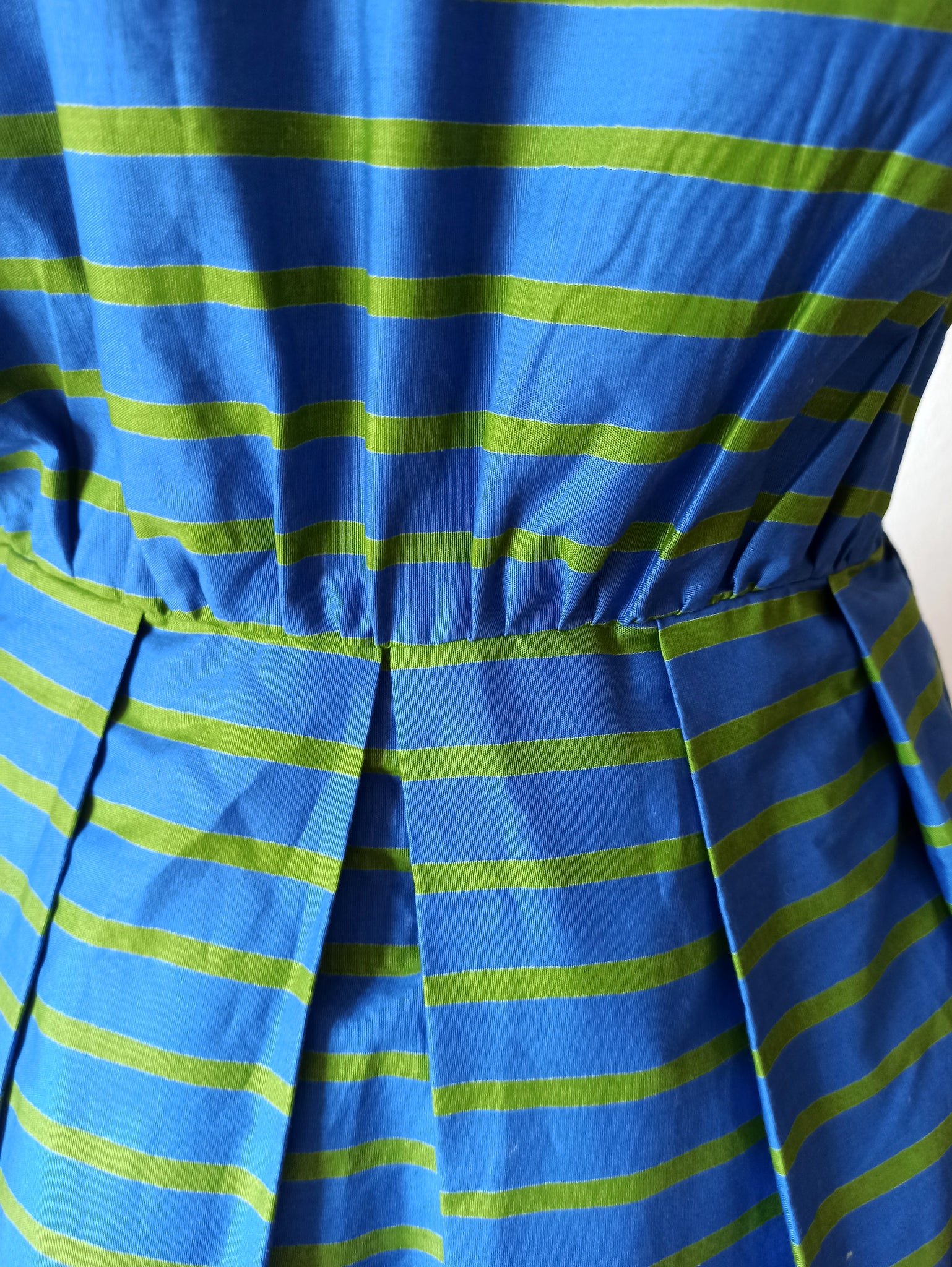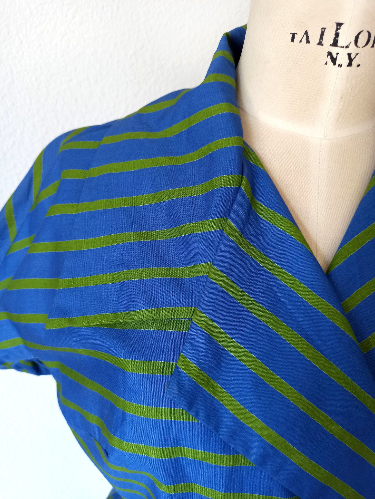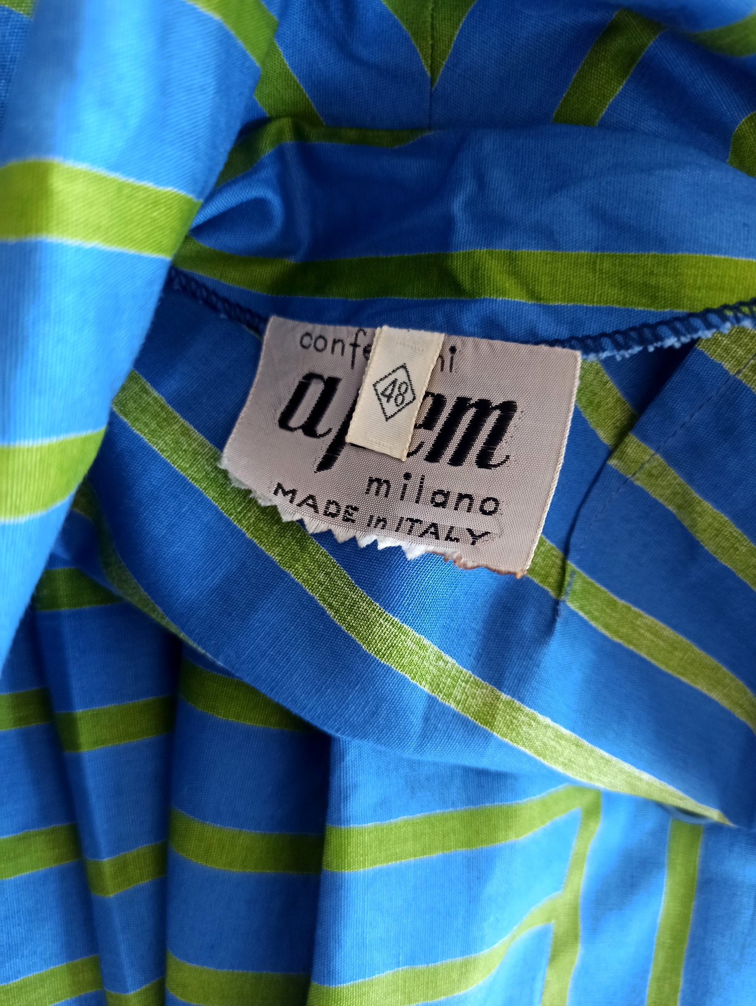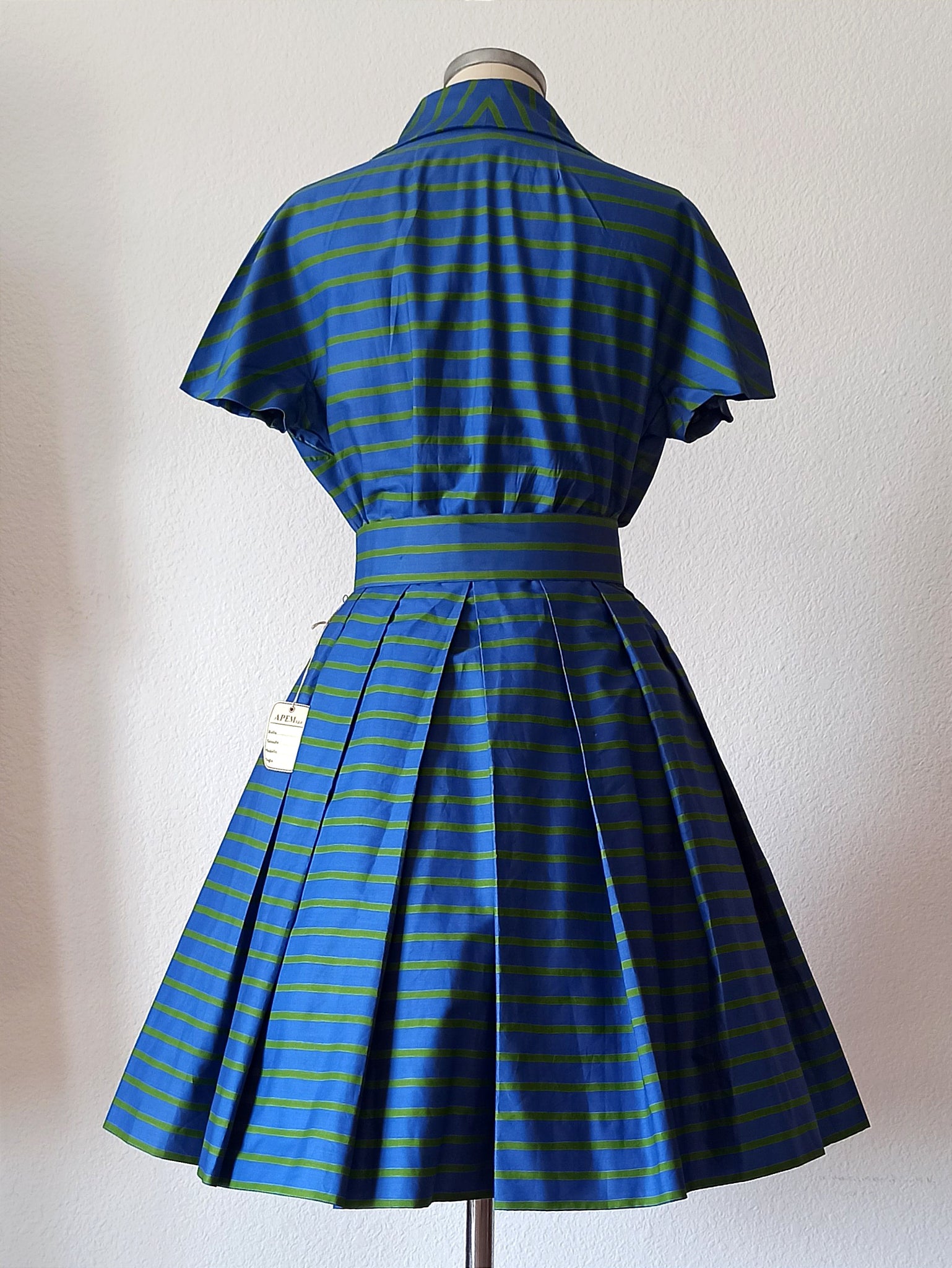 This is a super gorgeous dress from the very late 1950s by APEM, Milano (Italy). In deadstock condition with original tags. The fabric is top quality cotton in blue and green. She has a super chic collar and neckline and a matching wide belt. She closes with front buttons. Rounded shoulders. Tag reads size 48.