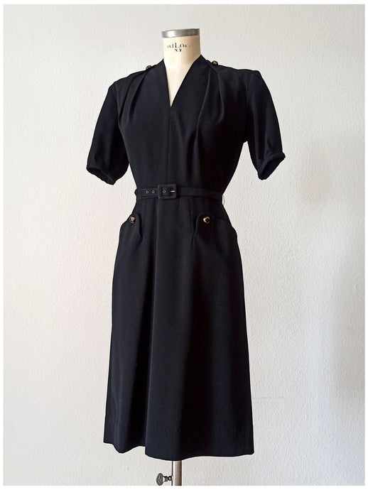 1940s - Superb Belted Peplum Black Crepe Dress - W31 (80cm)