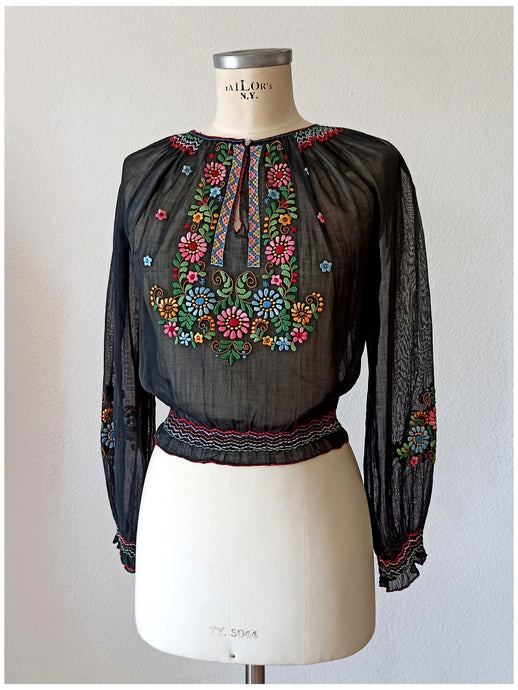 1940s 1950s - ARTEX - Black Hungarian Embroidery Blouse - W29 (74cm)