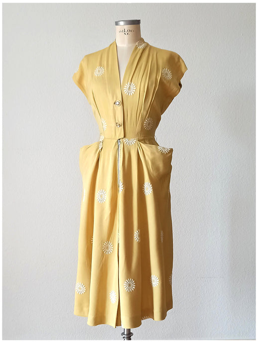 1940s - Gorgeous French Corn Embroidery Linen Dress - W28 (70cm)