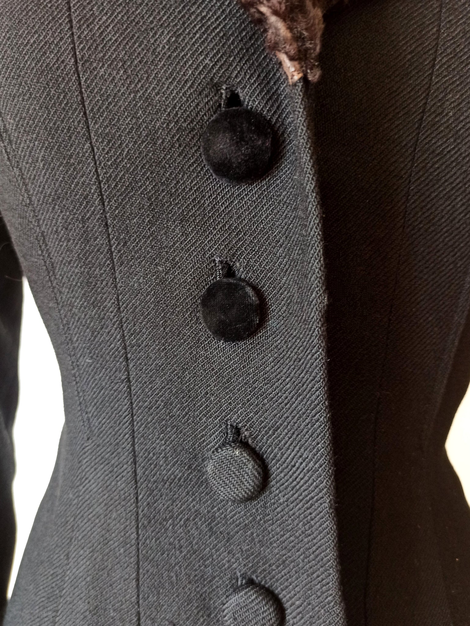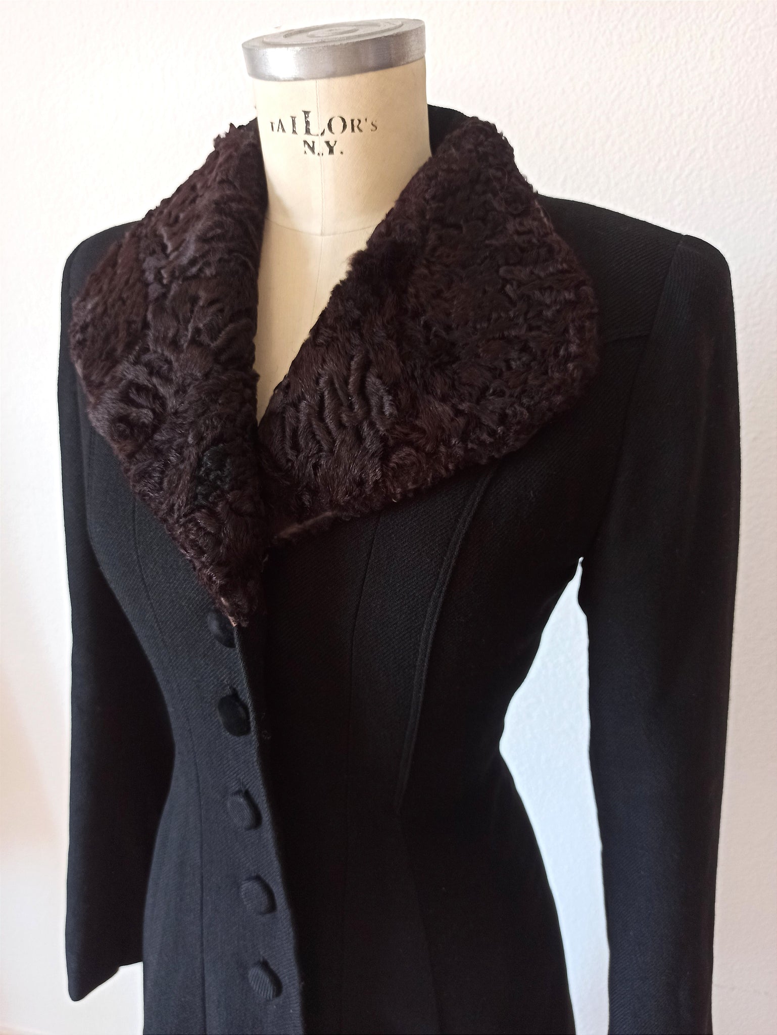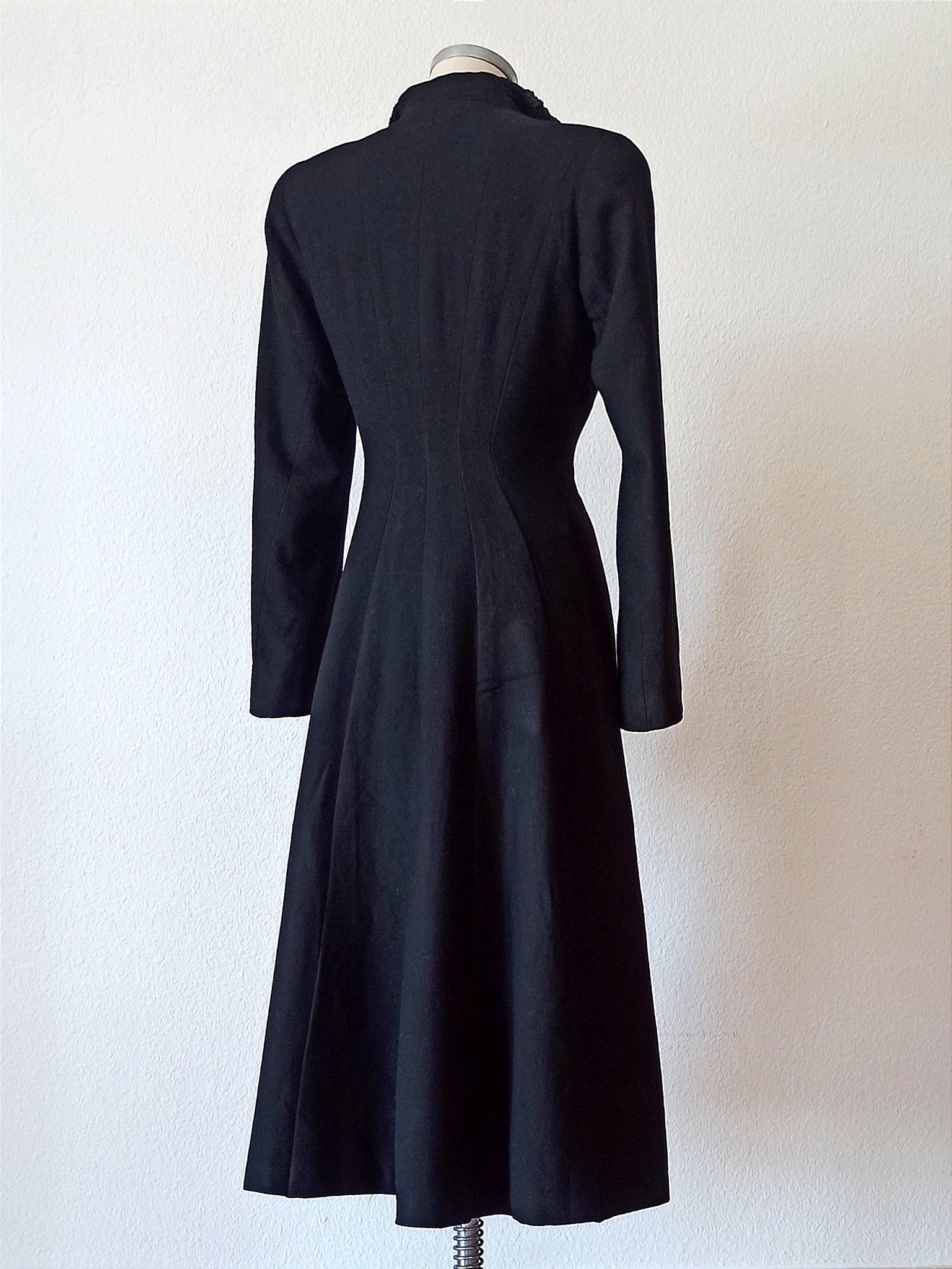 This is a truly superb long coat from the 1940s. The fabric is black wool with a faux fur collar. Exquisite and super elegant long cut with vertical seams all around the coat, the back seams are specially beautiful. She closes with front buttons. Padded shoulders. Satin lining.