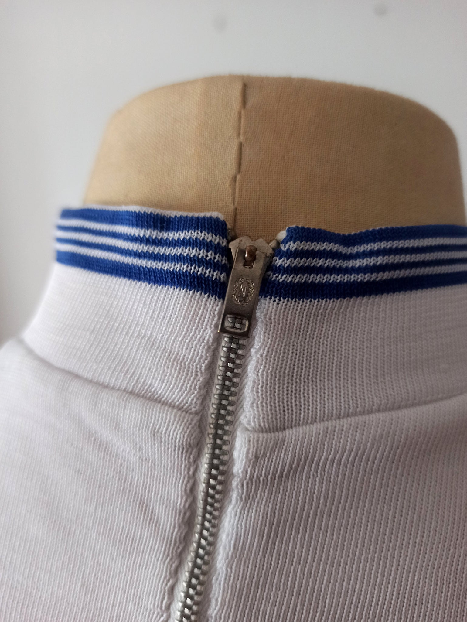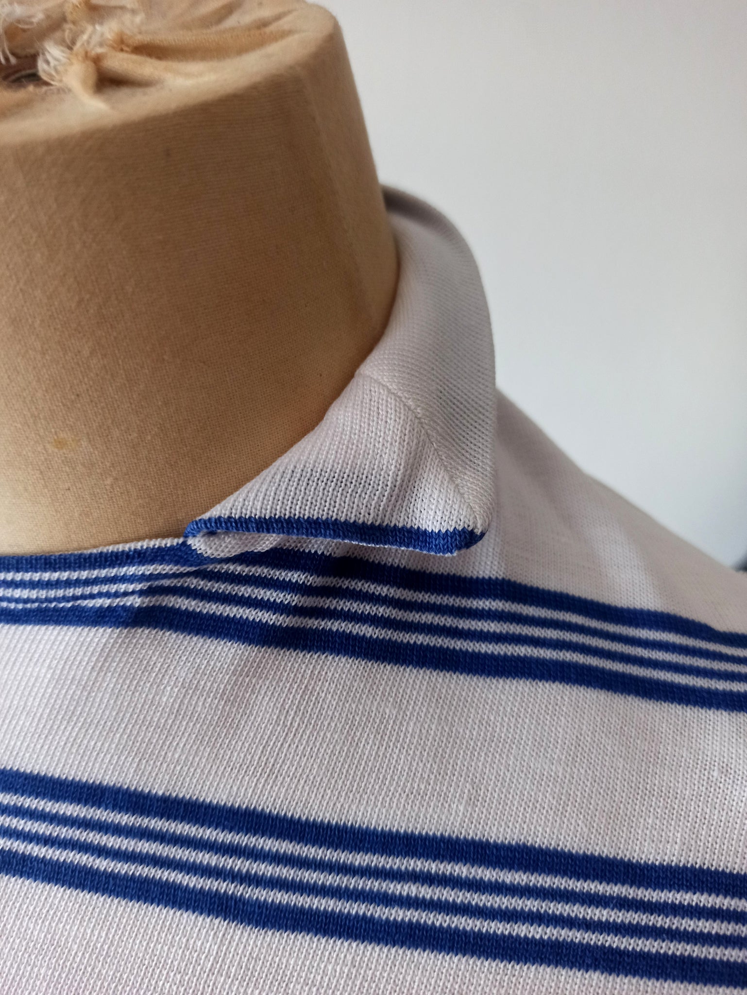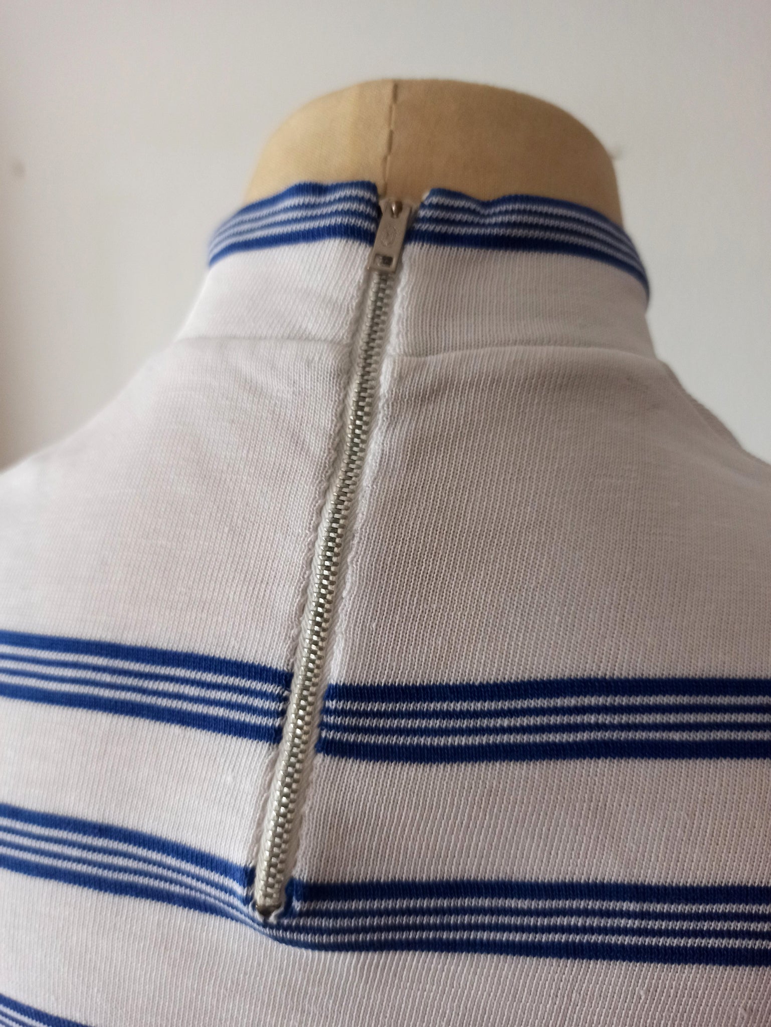 This is a fabulous top from the very late 1940s or very early 1950s in deadstock condition still with the original production tag. Cotton in white with blue stripes. Amazing collar with a metal zipper on the back. Superb cut with a very wide waistband. The fabric is a bit stretchable.