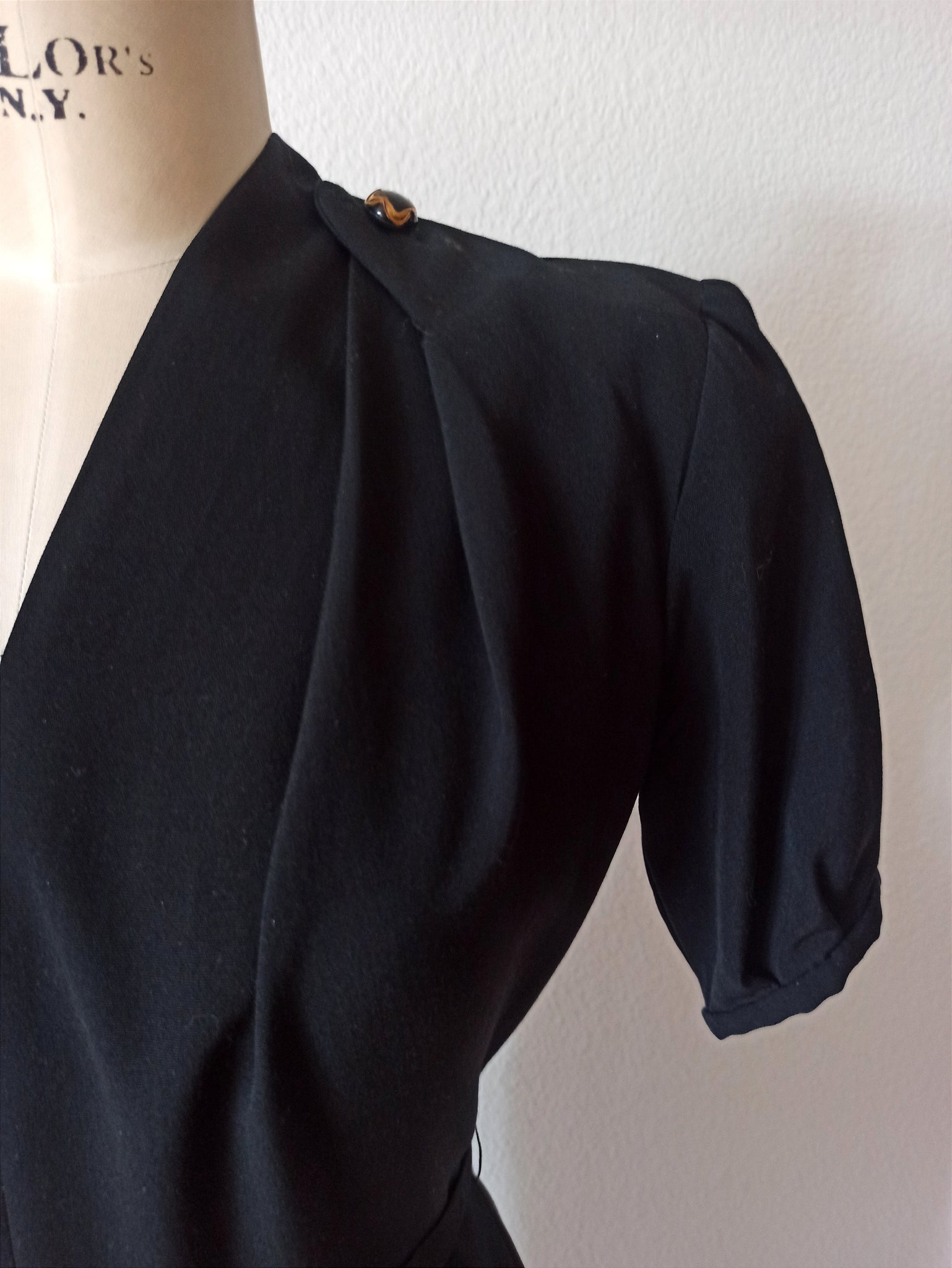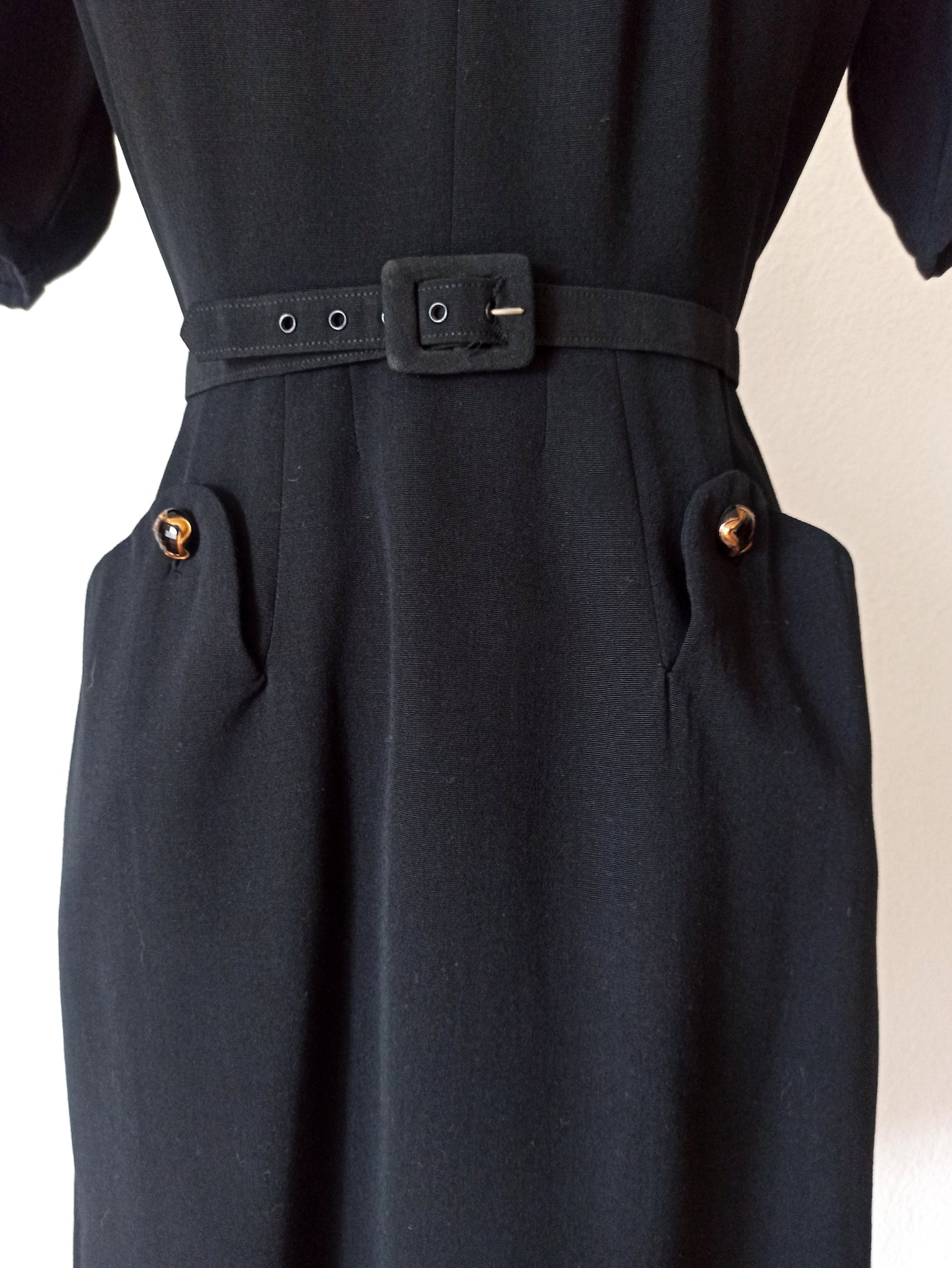 This is a superb dress from the 1940s. The fabric is black wool blend, probably mixed with cotton. She has an amazing shoulders and front design with two decorative buttons close to the neckline. Padded shoulders. Same buttons decorate these two fabulous pockets. Matching belt! Exquisite tailoring! She closes with a back metal ECLAIR zipper.