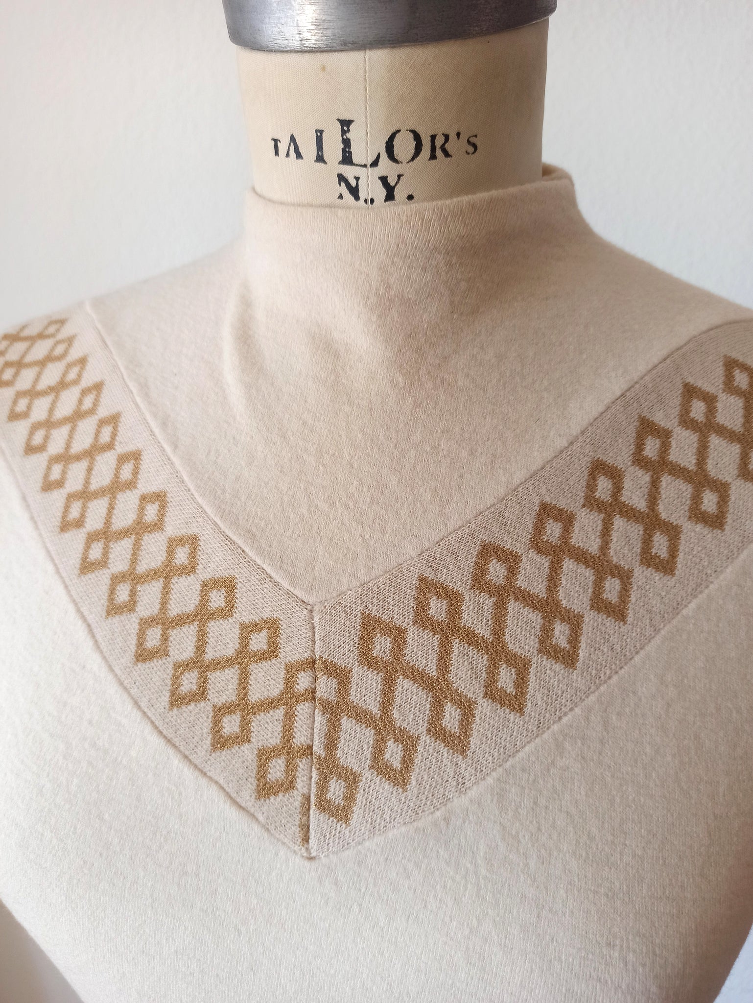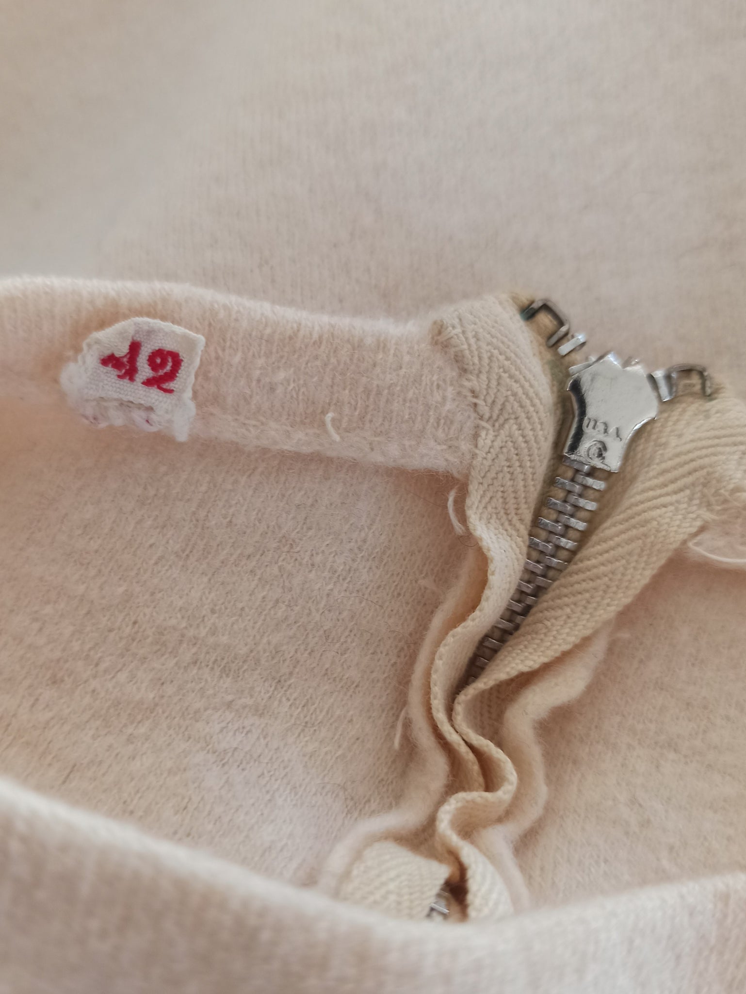 This is a gorgeous top from the 1950s. The fabric is wool in a light buttercream colour with a lurex trim. Cropped cut with vertical seams. She closes with a back zipper. Tag reads size 42. Please carefully read the measurements and bear in mind that fabric is a bit stretchable.