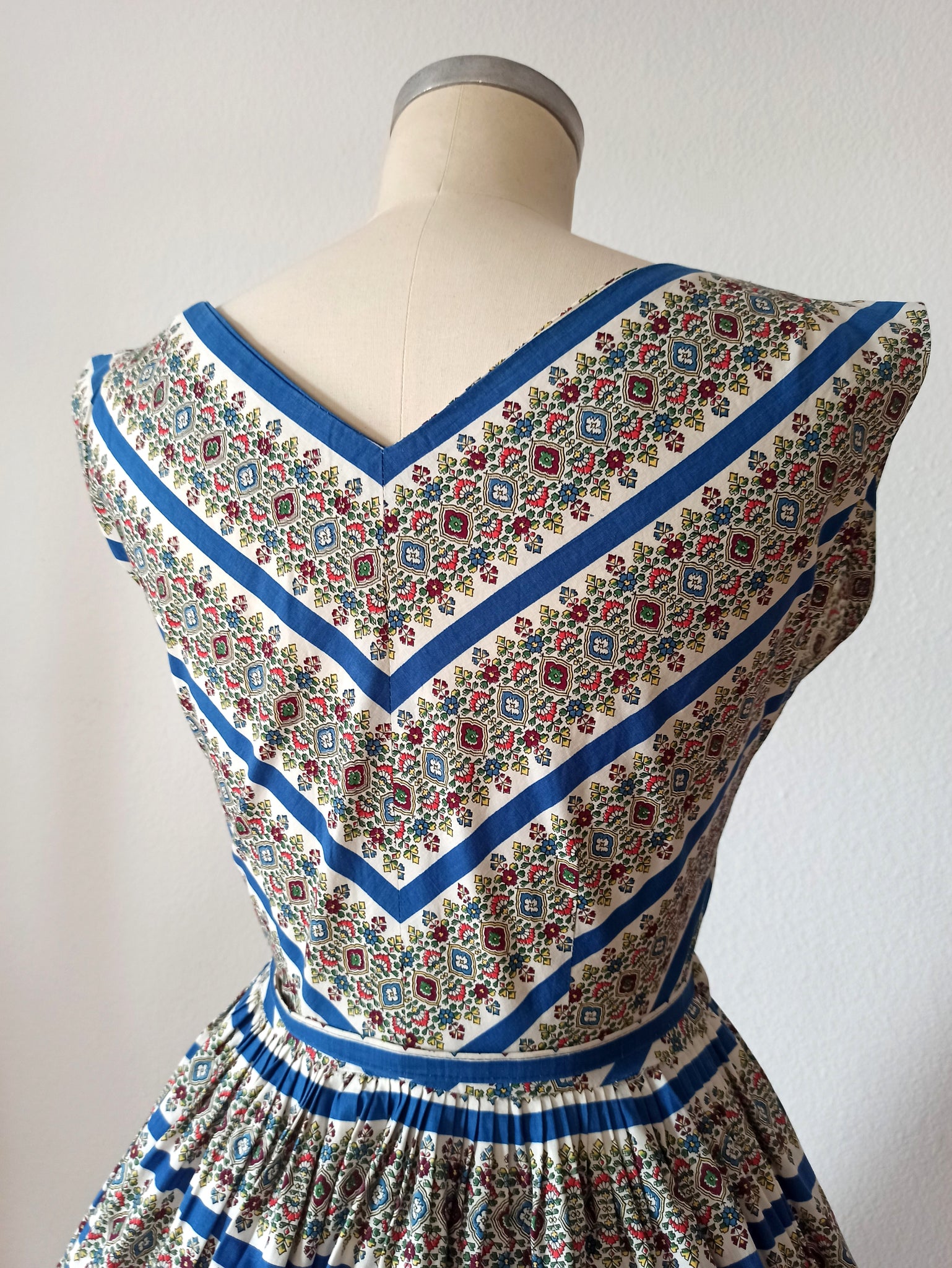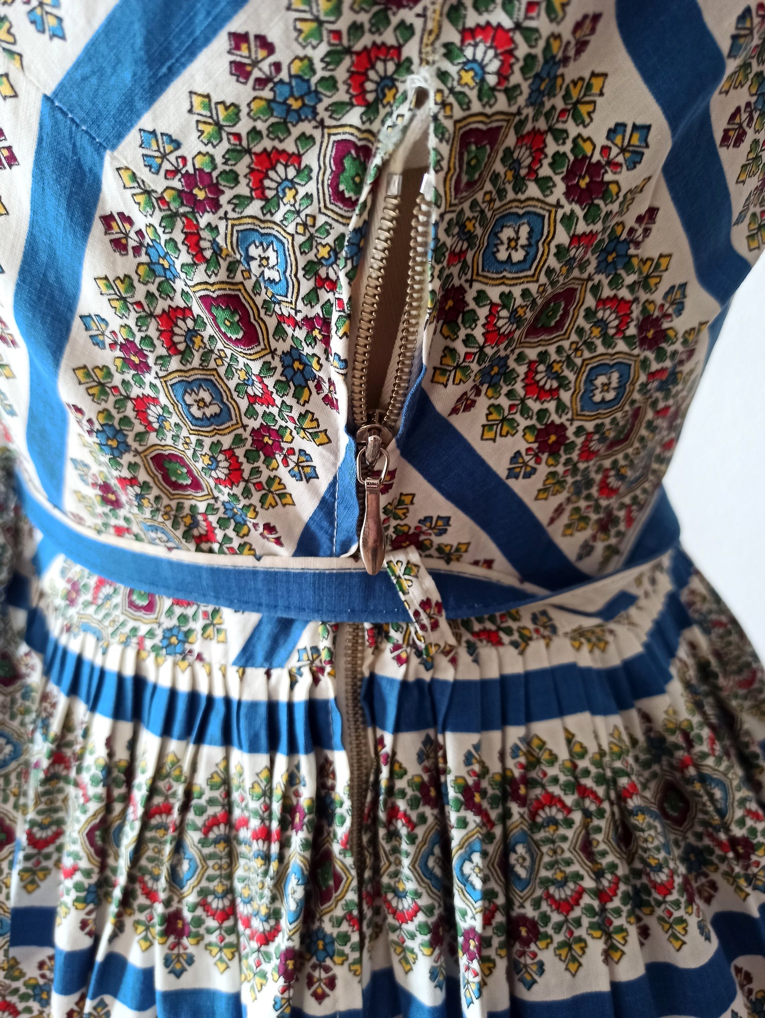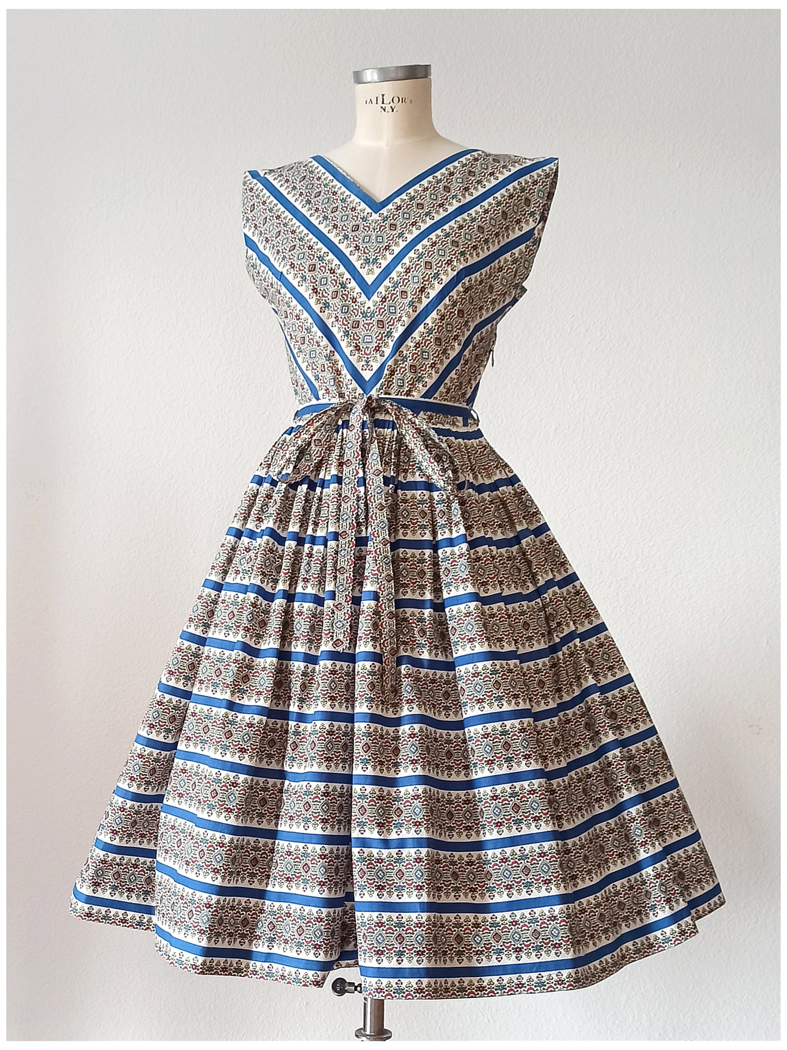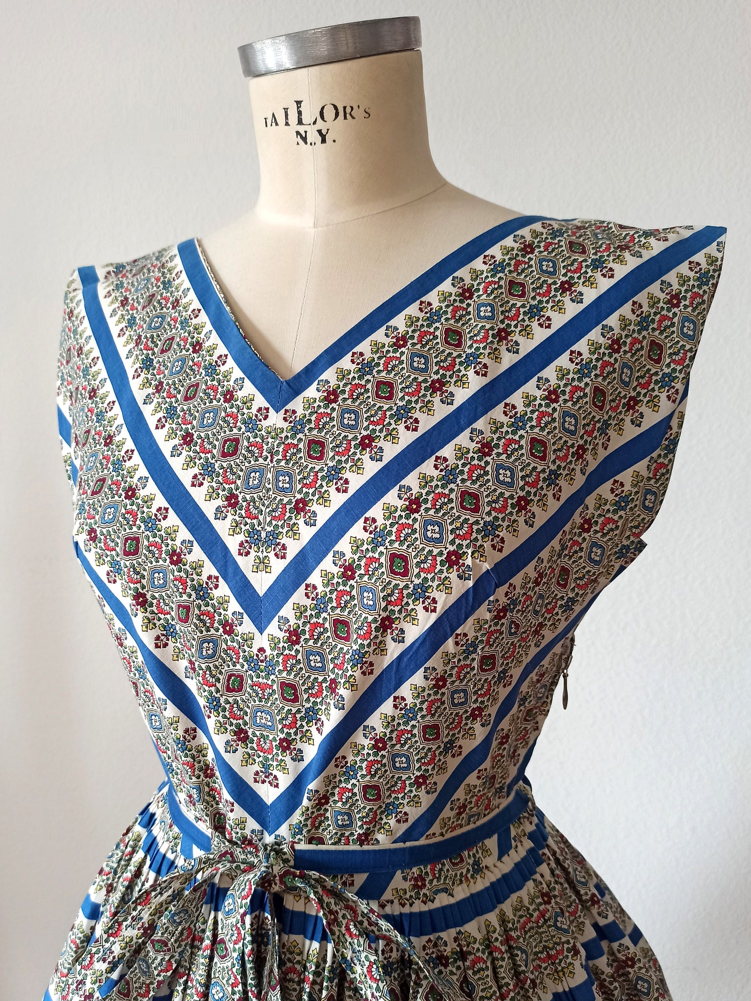 This is an spectacular dress from the late 1940s or super early 1950s. The fabric is top quality cotton with a precious and colorful floral print. Exquisite V neckline with the pattern of the print following the same shape. She has an exquisite skirt and closes with a side metal zipper and a matching belt. Tag reads size 40.