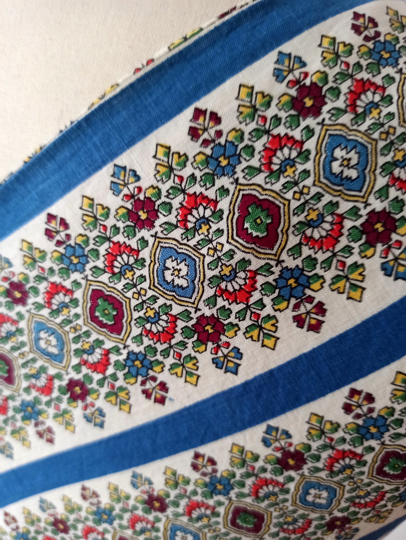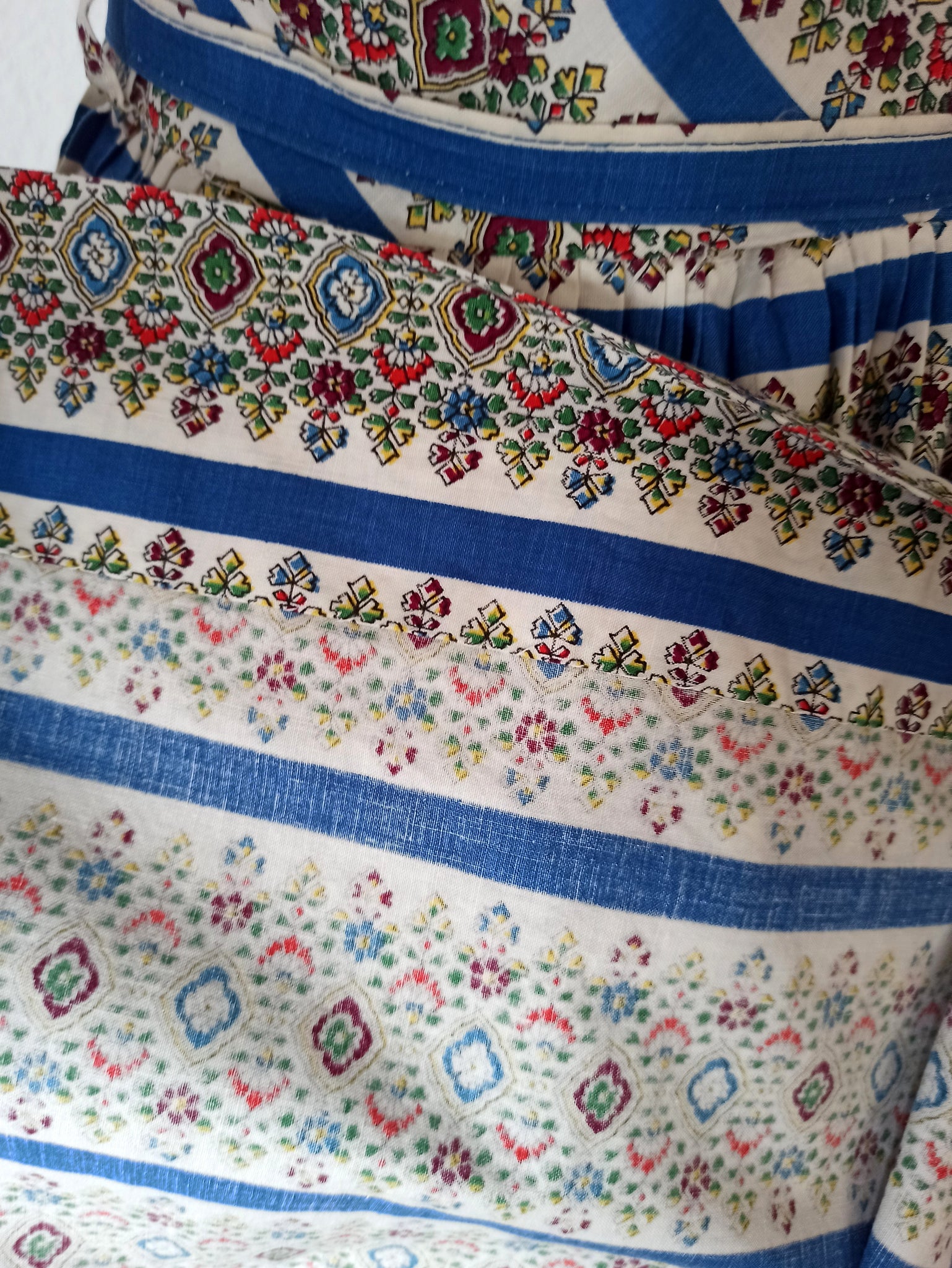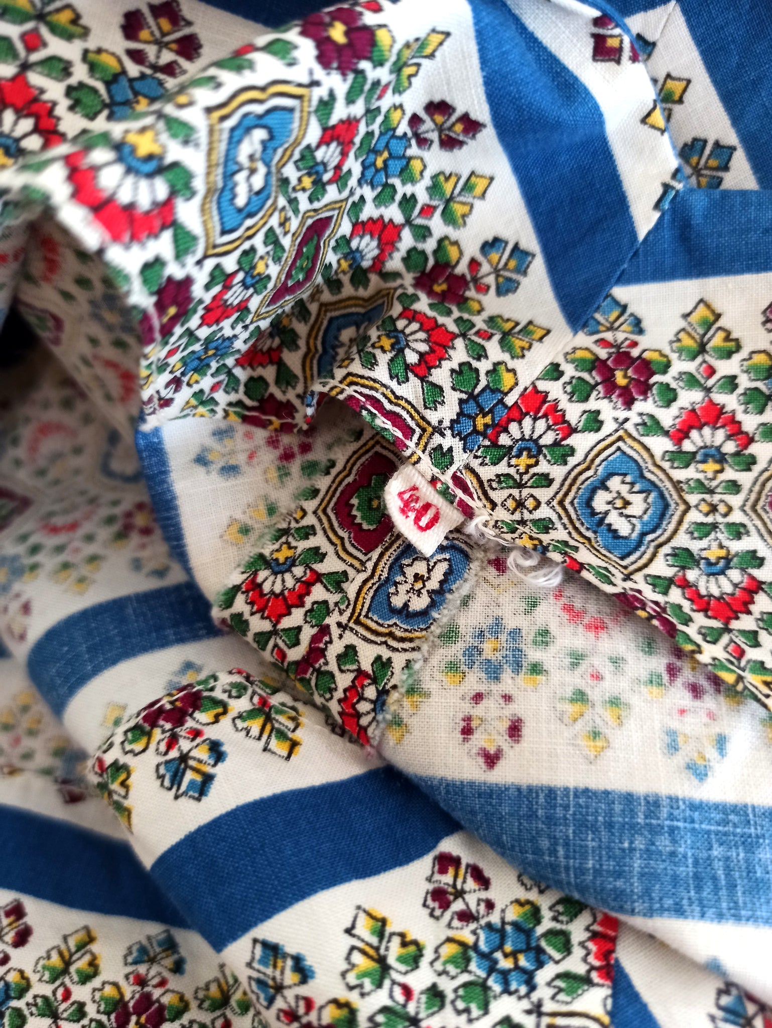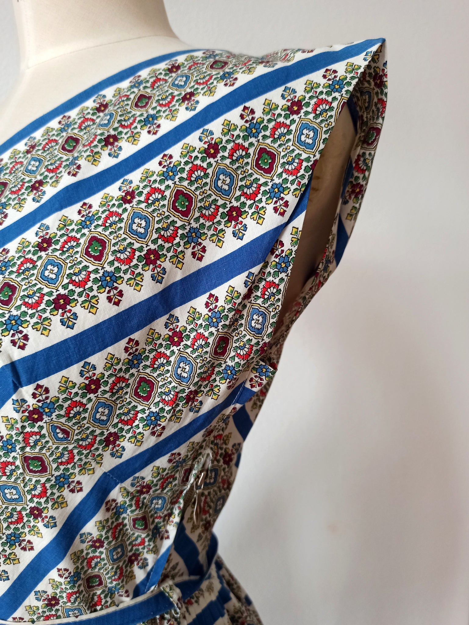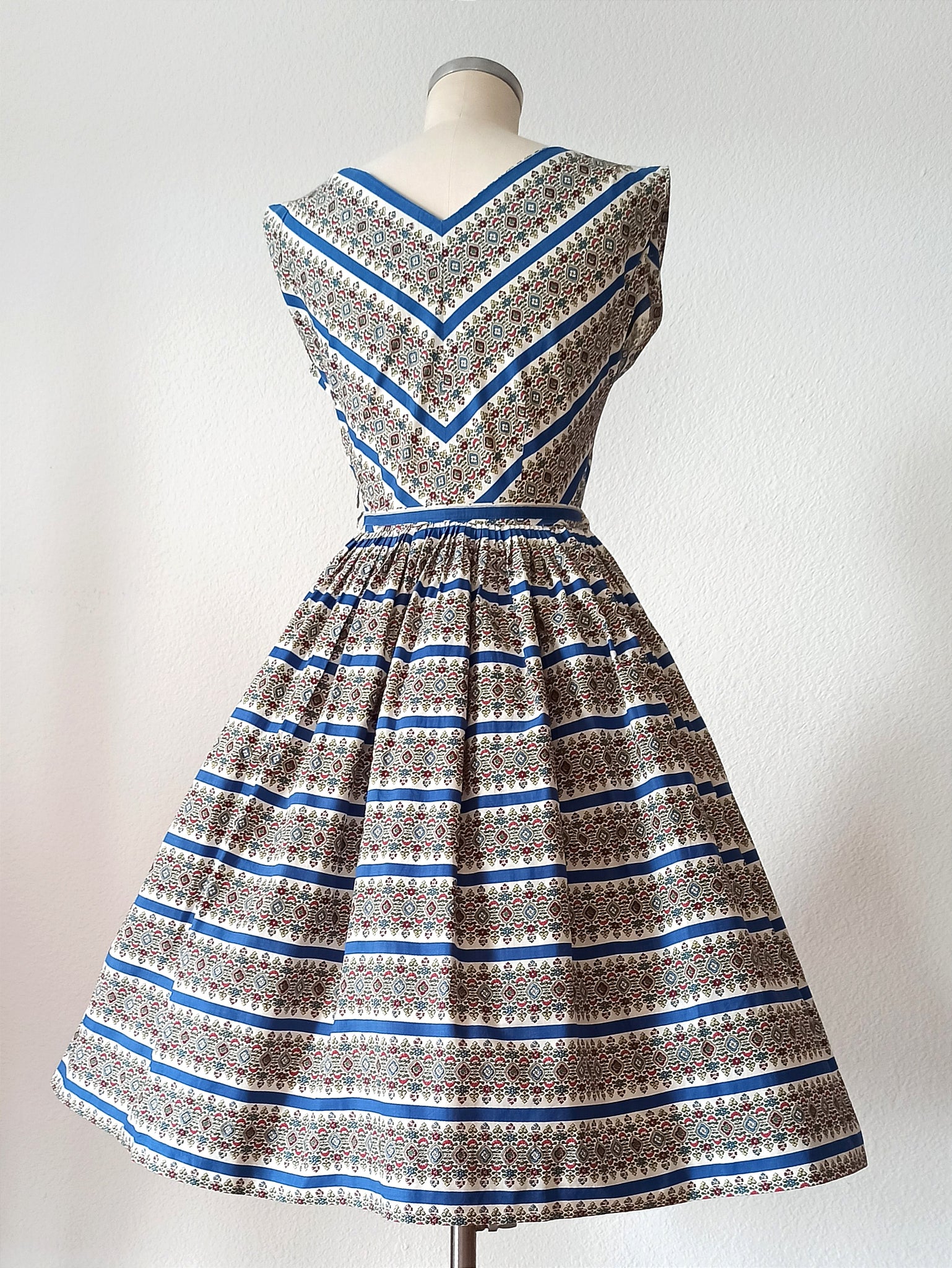 This is an spectacular dress from the late 1940s or super early 1950s. The fabric is top quality cotton with a precious and colorful floral print. Exquisite V neckline with the pattern of the print following the same shape. She has an exquisite skirt and closes with a side metal zipper and a matching belt. Tag reads size 40.