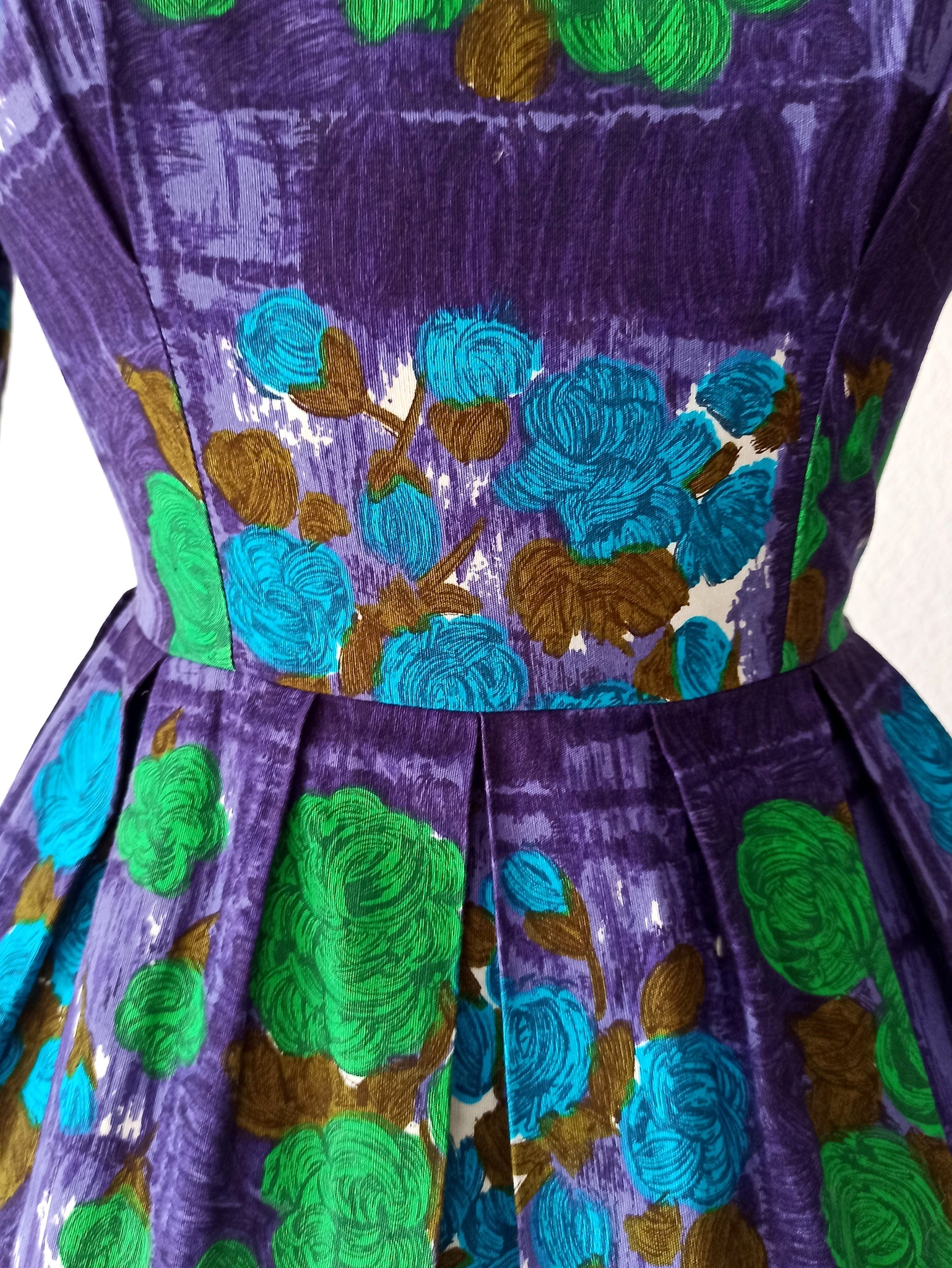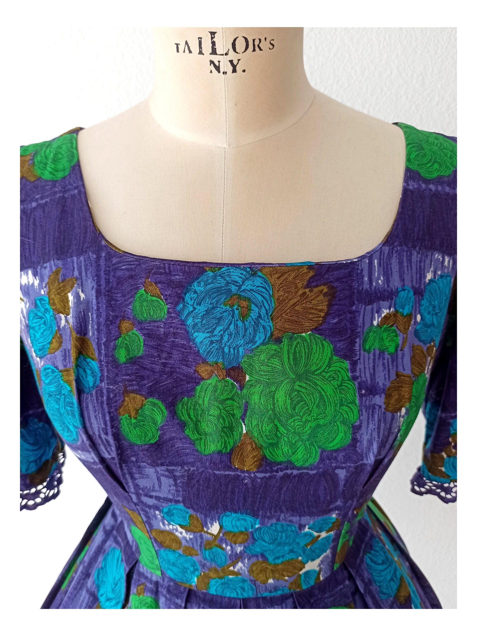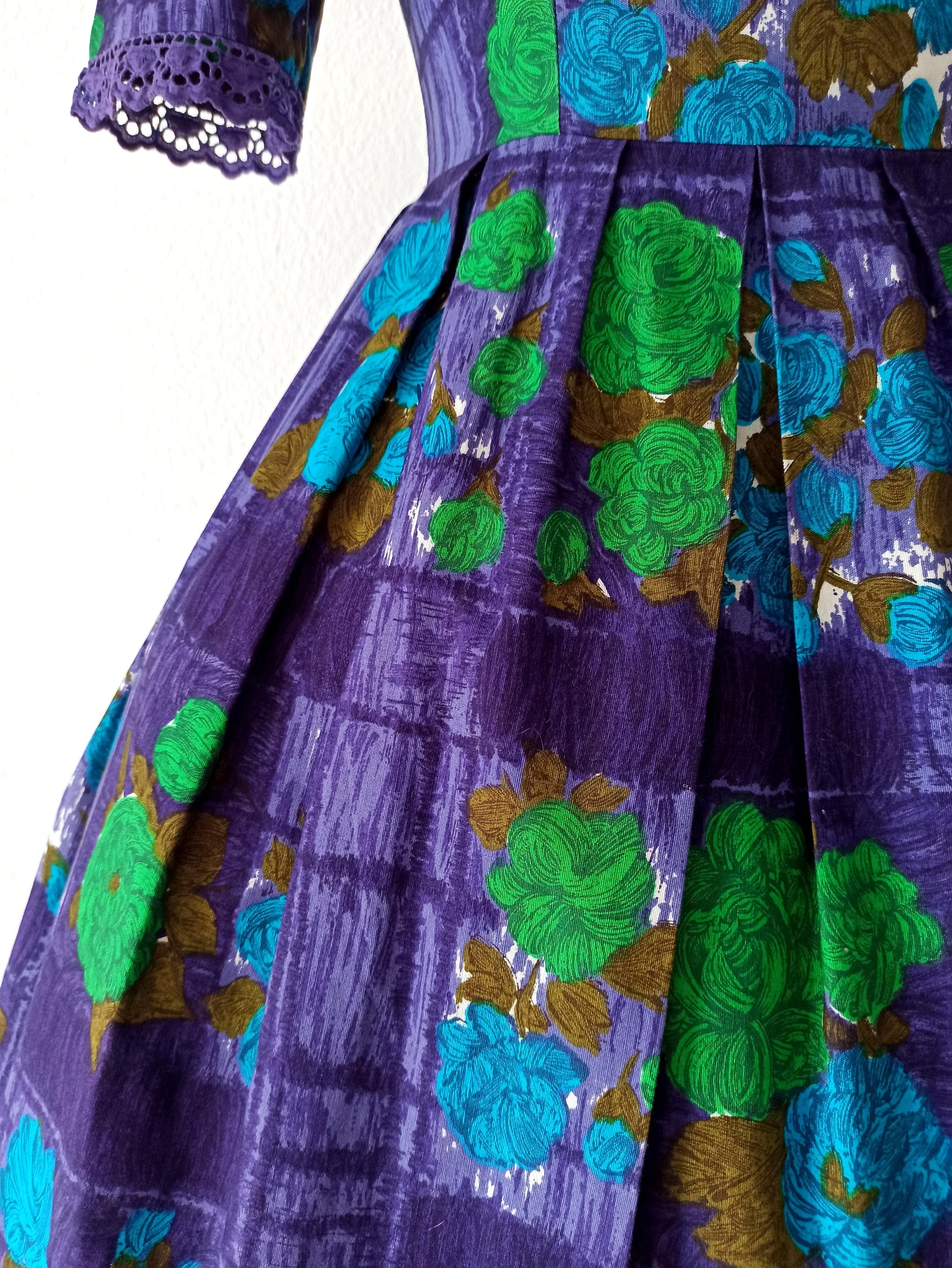 This is a fabulous dress from the late 1950s or very early 1960s. The fabric is a top quality cotton with a stunning roseprint over a purple background. Intense colors. She has a beautiful neckline and a very nice cotton lace detail on the sleeves. Beautiful cut with an elegant skirt. She closes with a back metal zipper.