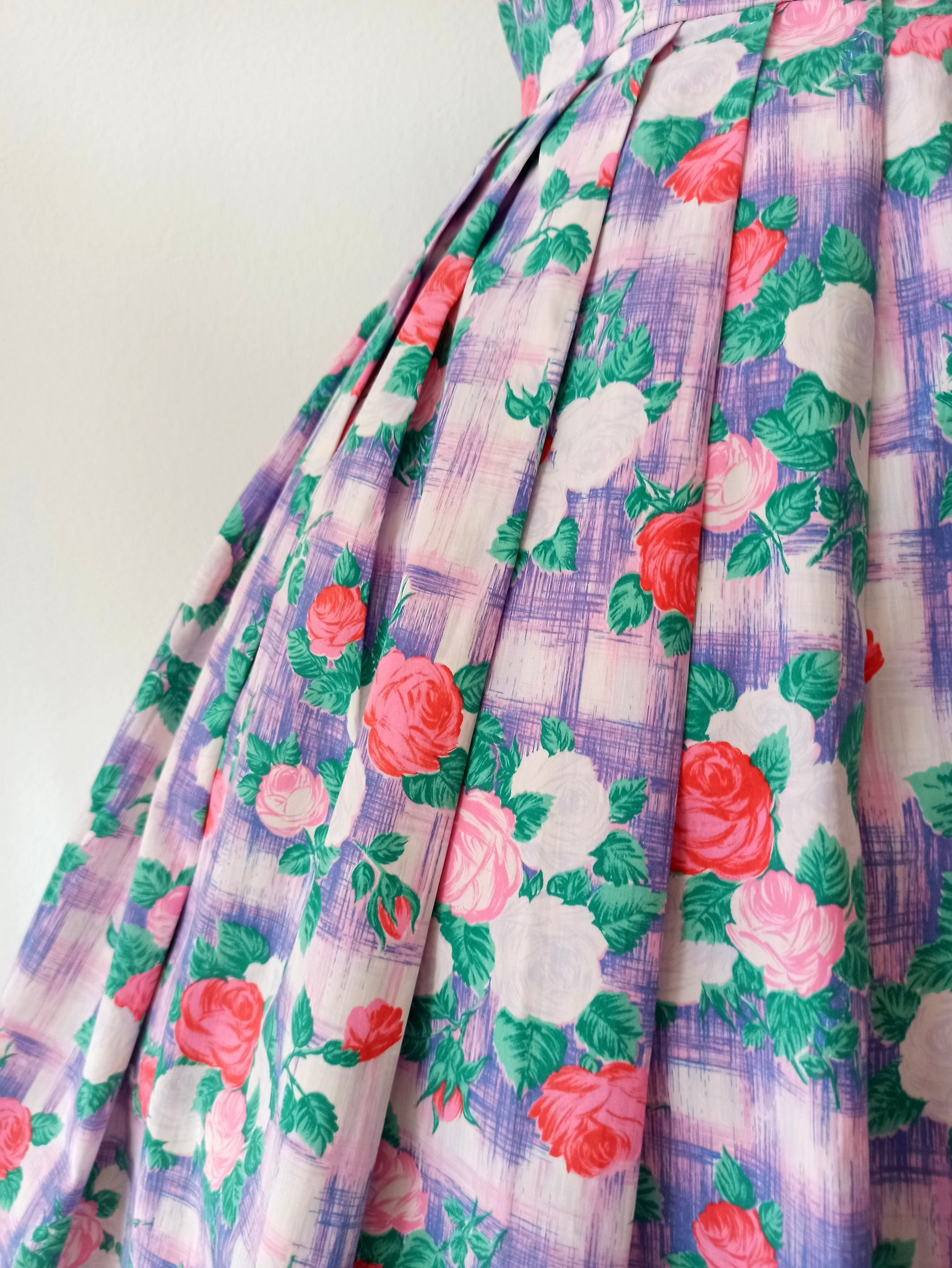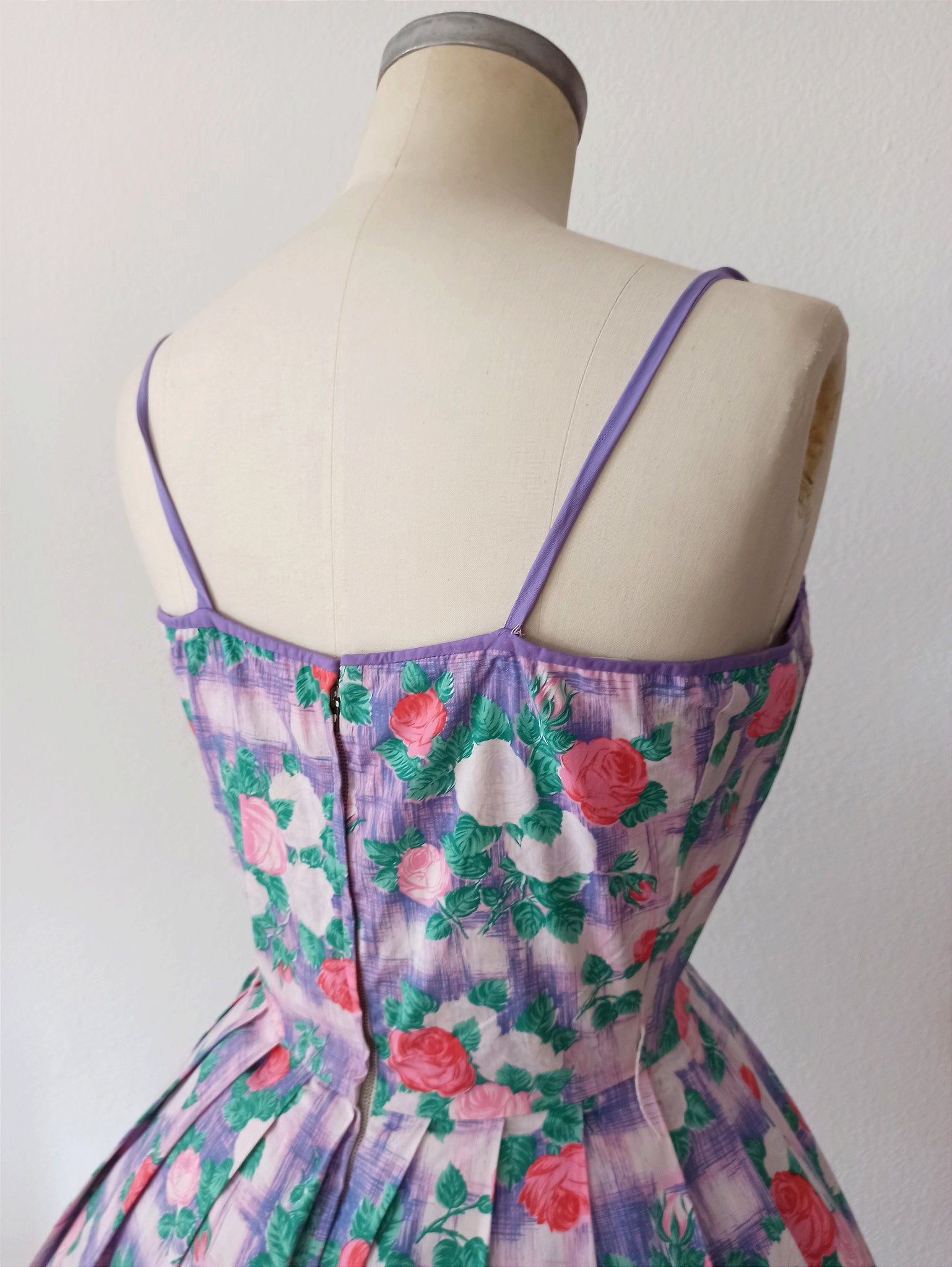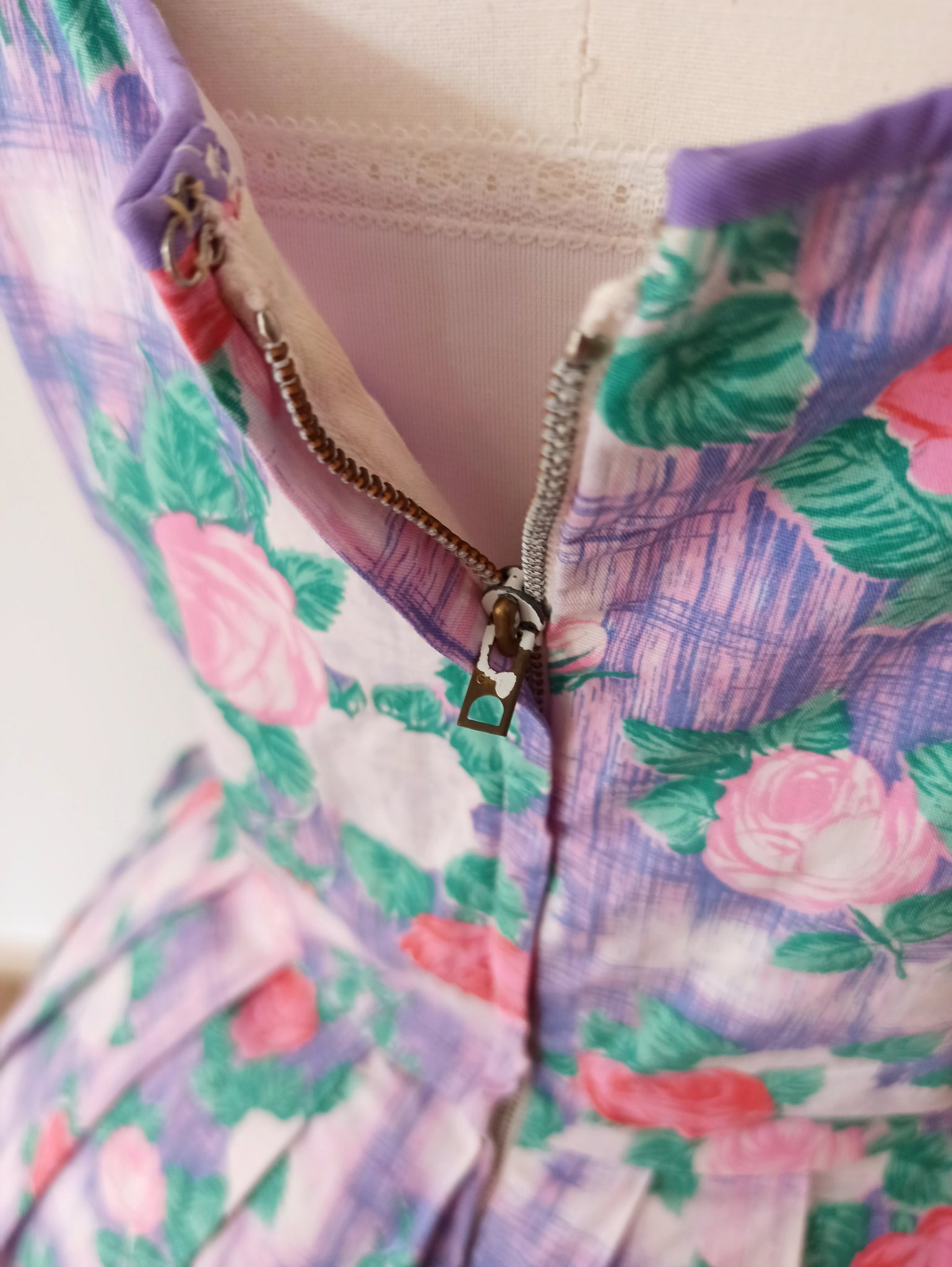 This is an exquisite and precious French dress from the 1950s. The fabric is a top quality cotton with a beautiful roseprint with pink and white roses. Spaghetti straps and a delicious pleated bust. Massive skirt. The dress is fully lined, bodice with smoked cotton and the skirt has a textured nylon underskirt. She closes with a back metal zipper. The zipper is a CHIC one, French made.