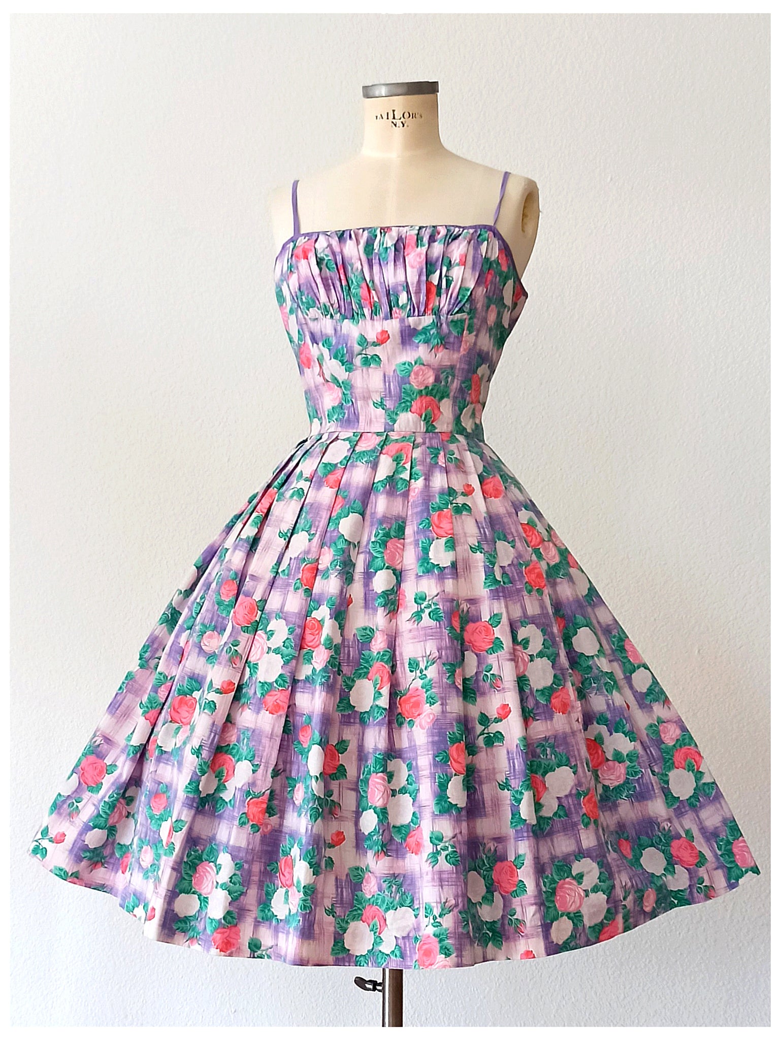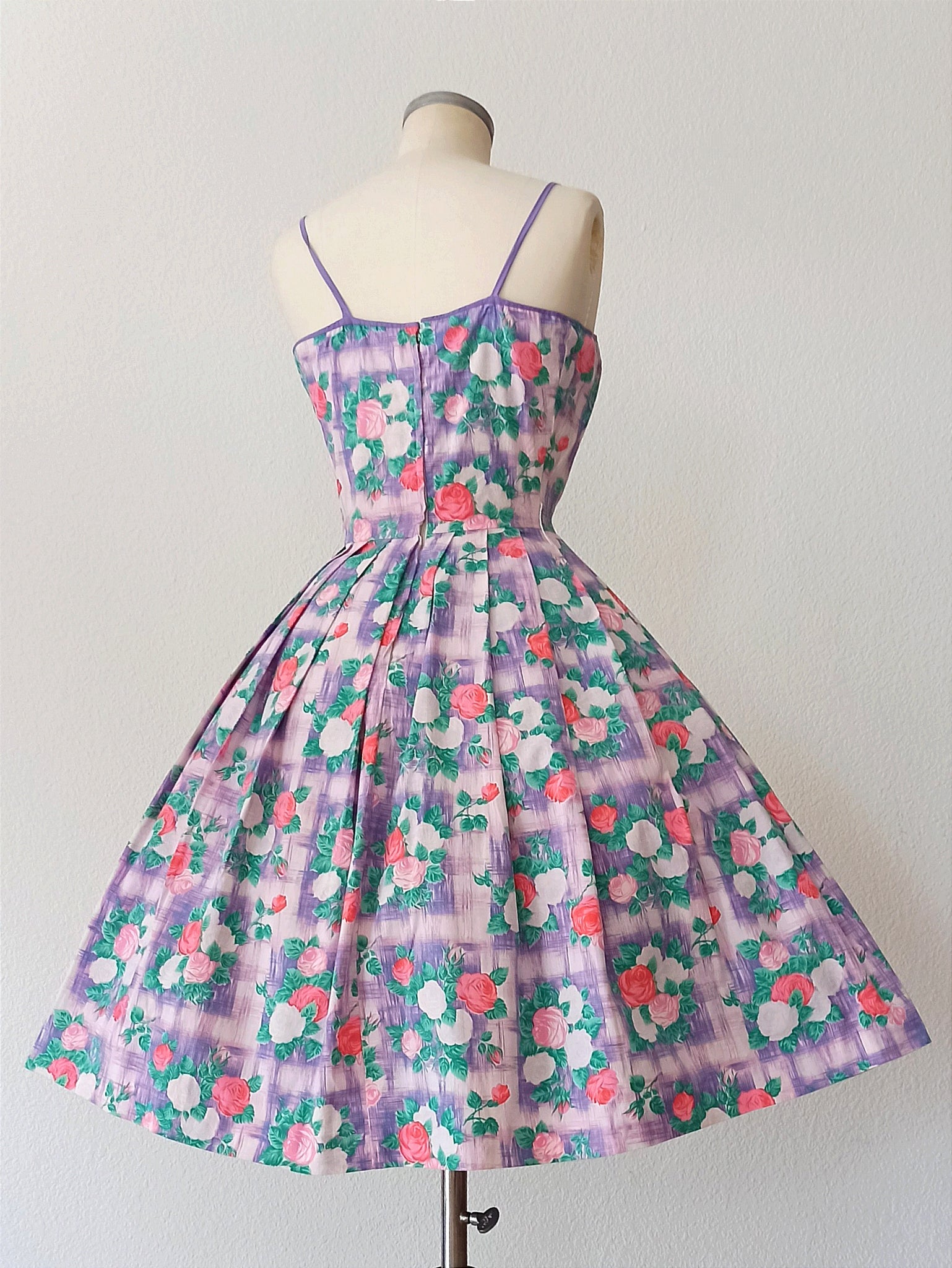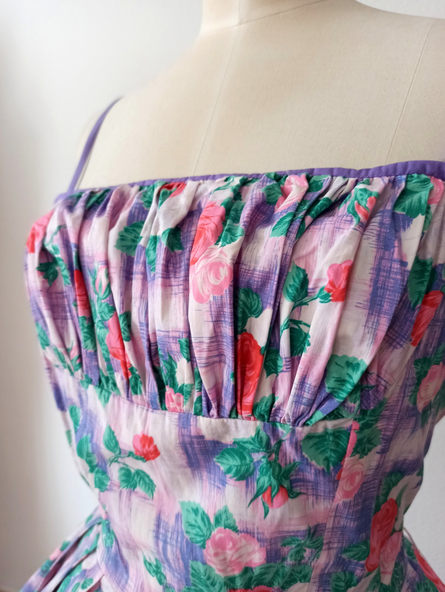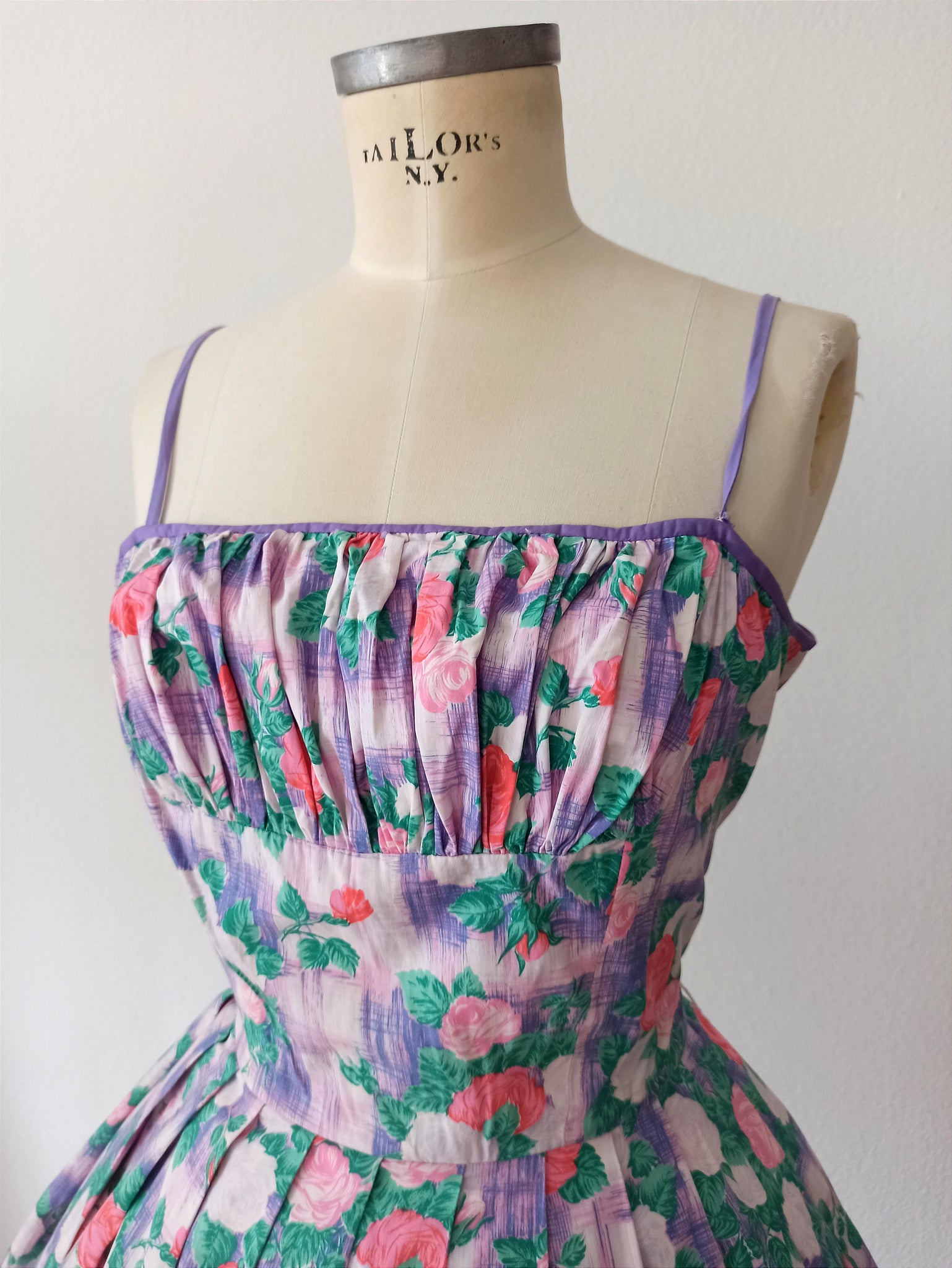 This is an exquisite and precious French dress from the 1950s. The fabric is a top quality cotton with a beautiful roseprint with pink and white roses. Spaghetti straps and a delicious pleated bust. Massive skirt. The dress is fully lined, bodice with smoked cotton and the skirt has a textured nylon underskirt. She closes with a back metal zipper. The zipper is a CHIC one, French made.
