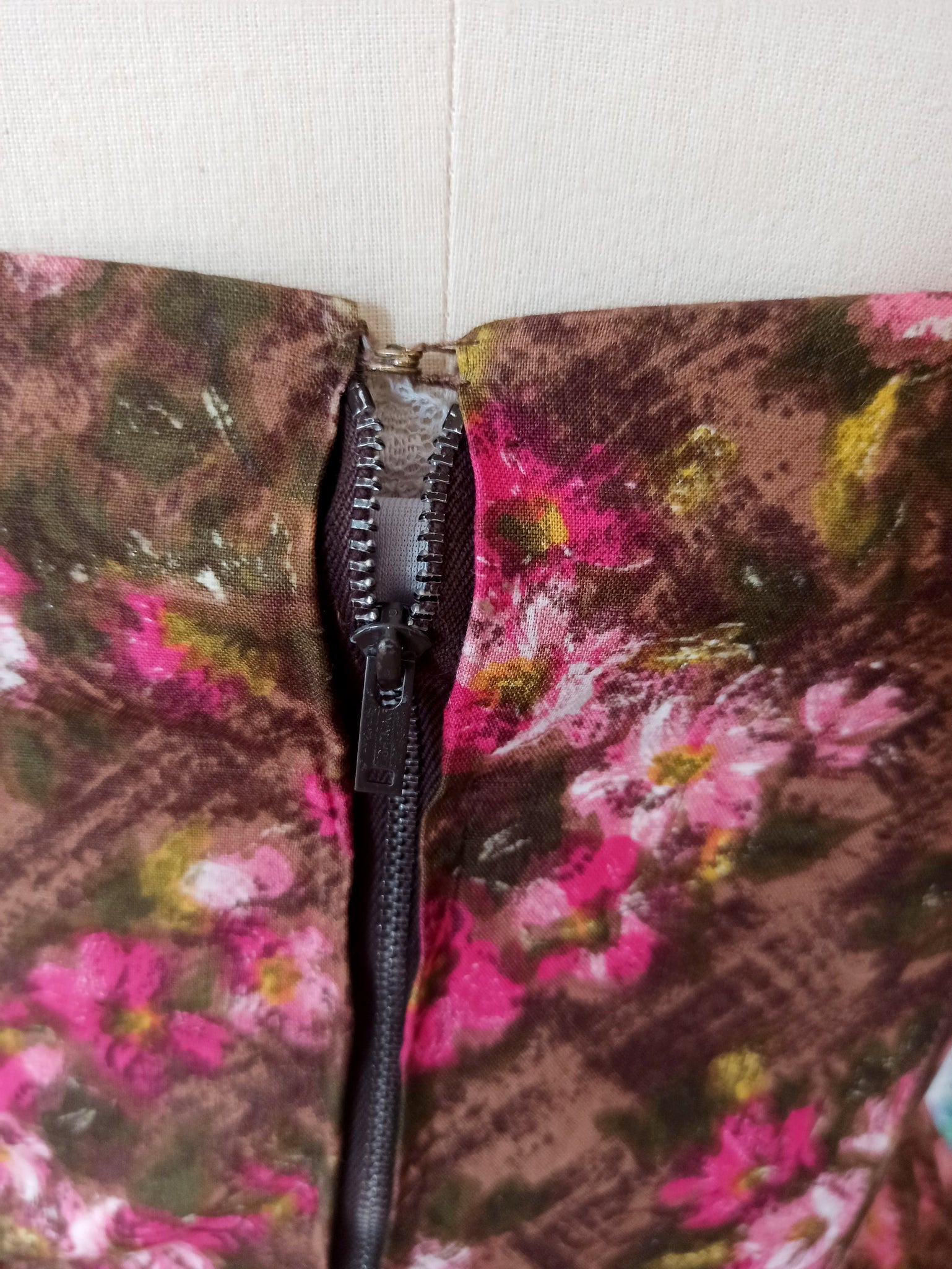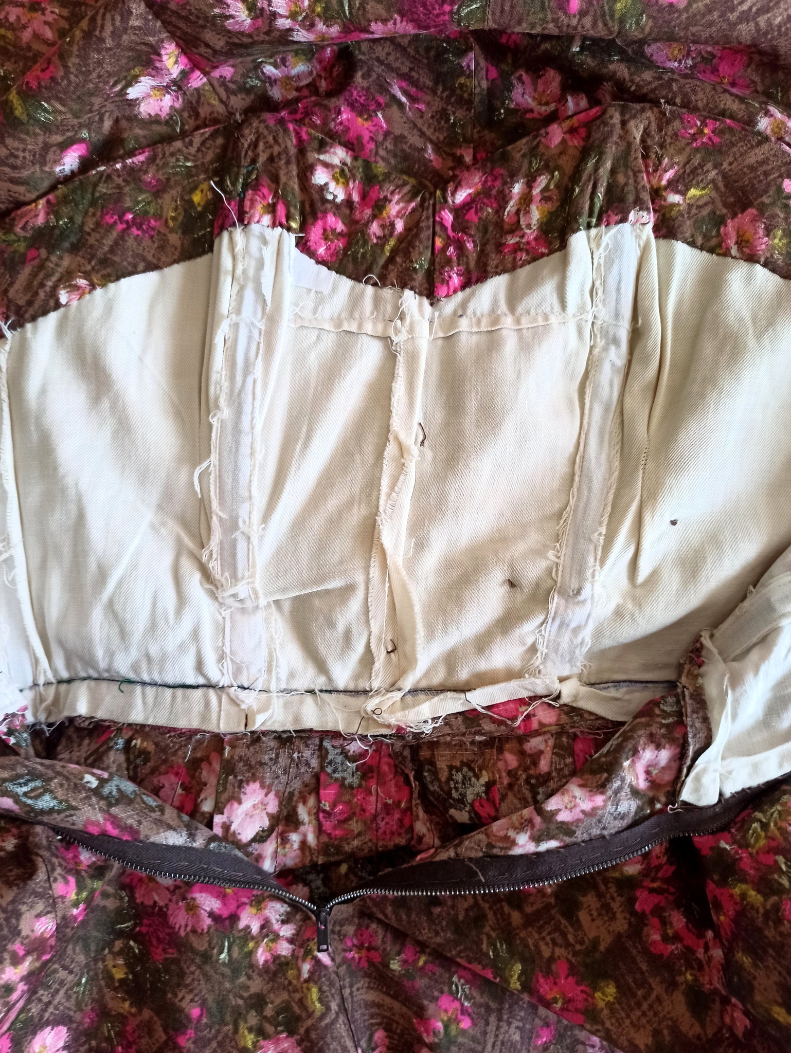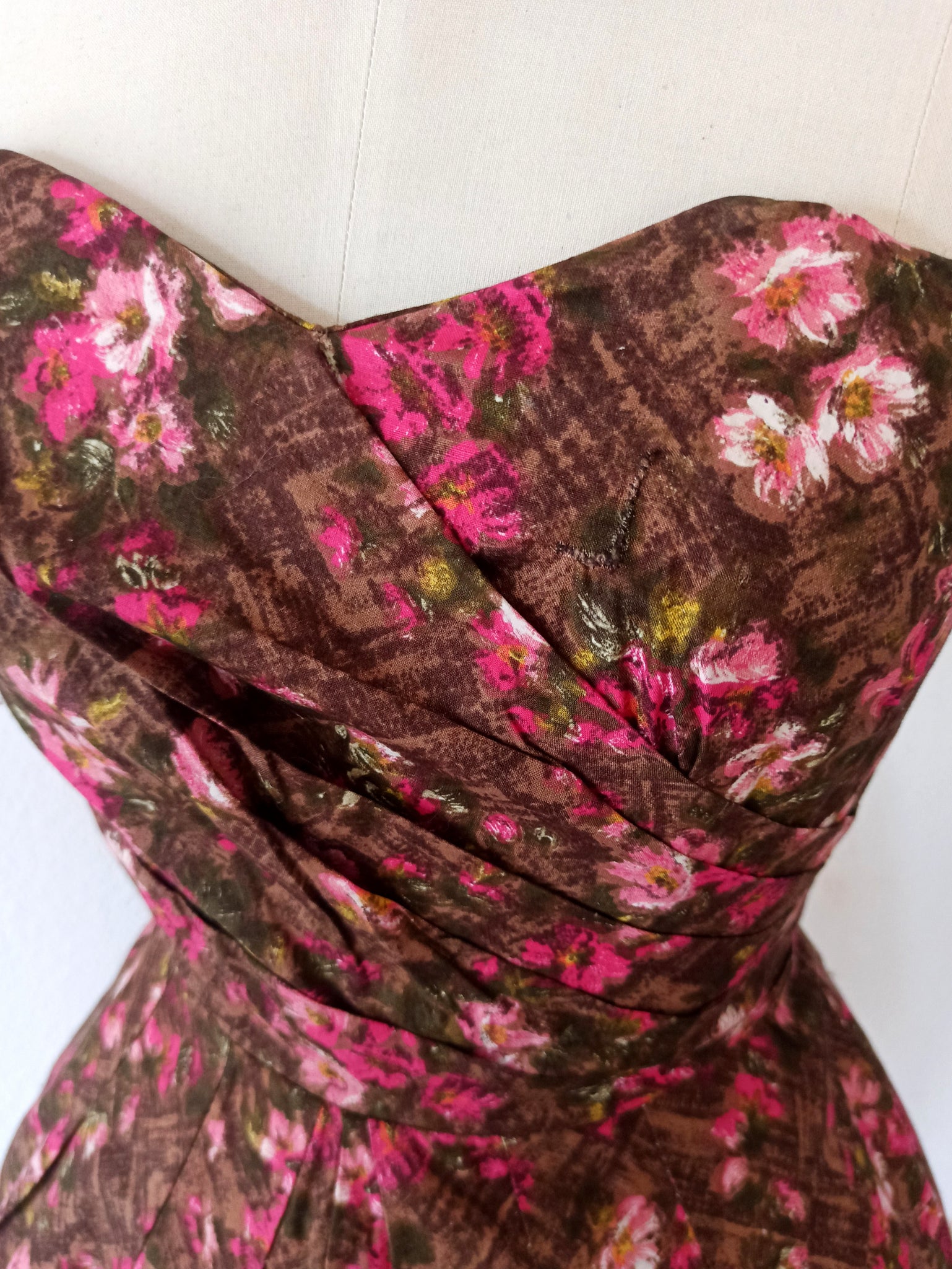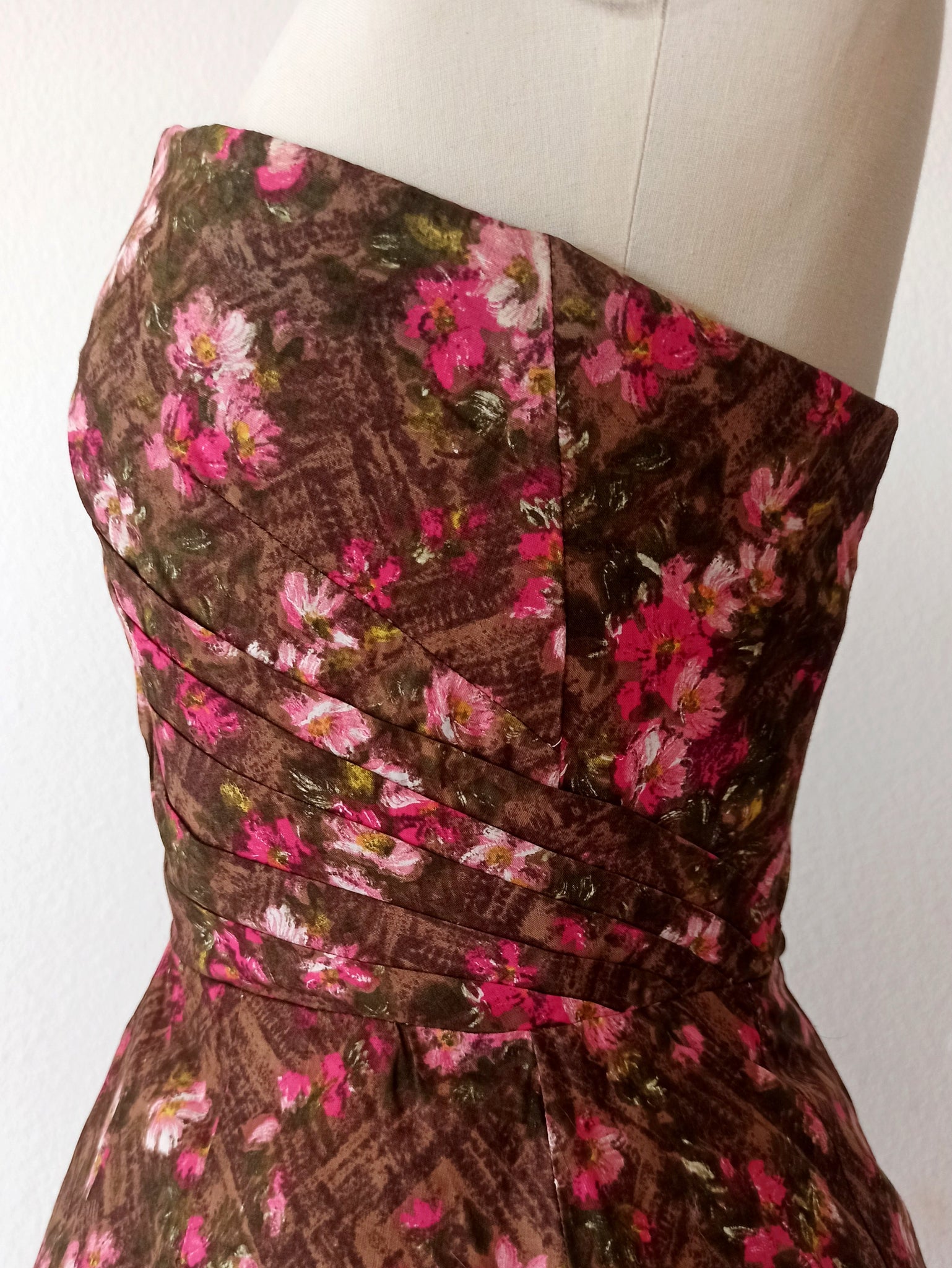 This is a stunning dress from the 1950s. The fabric is a top quality cotton with a precious floral print over a brown background. She has an exquisitely made bust and boned bodice. She closes with a back metal zipper and a hook.