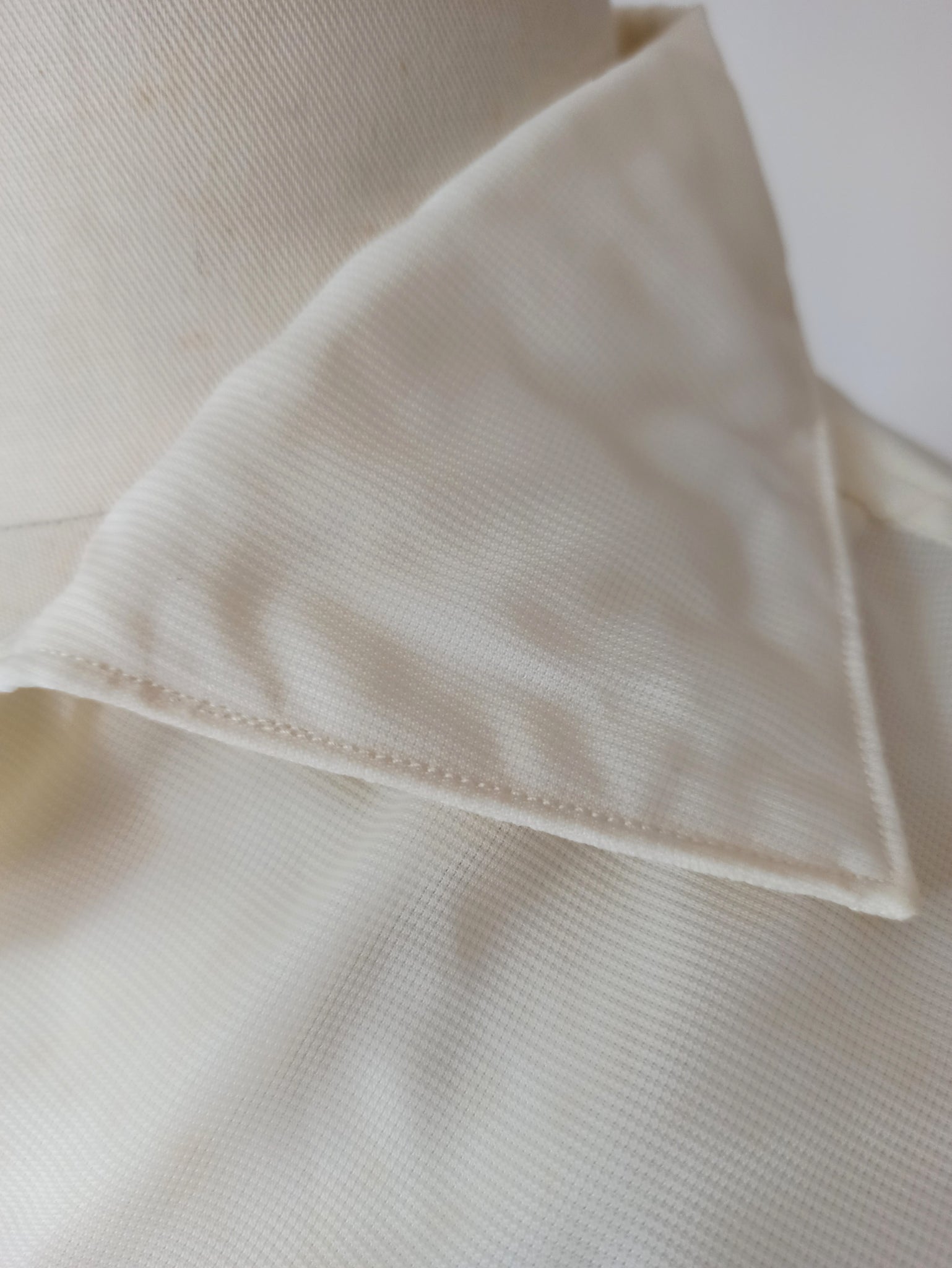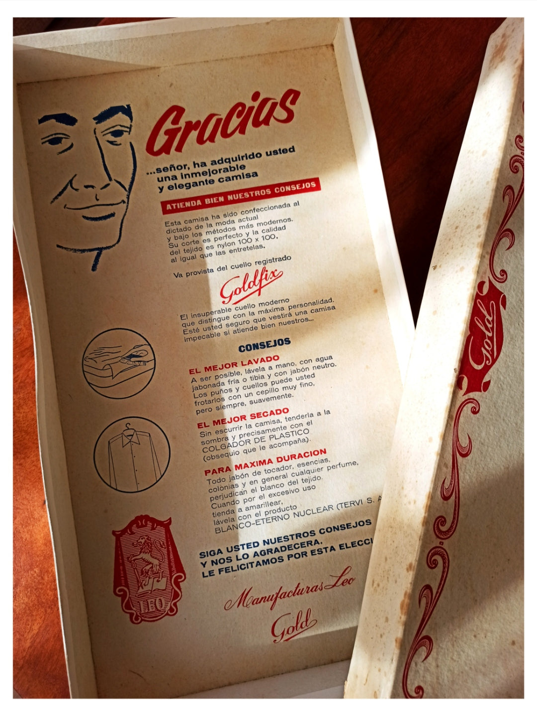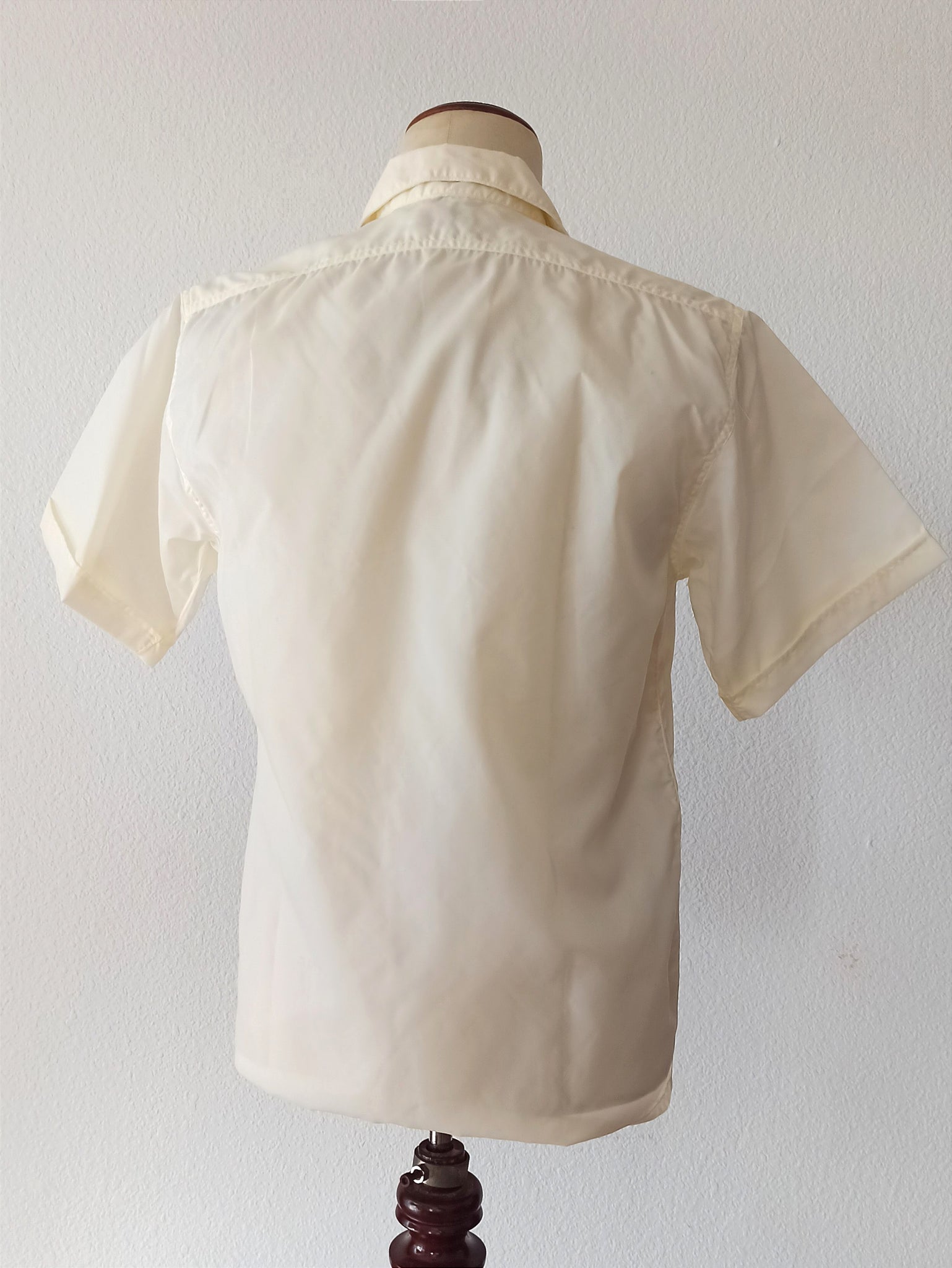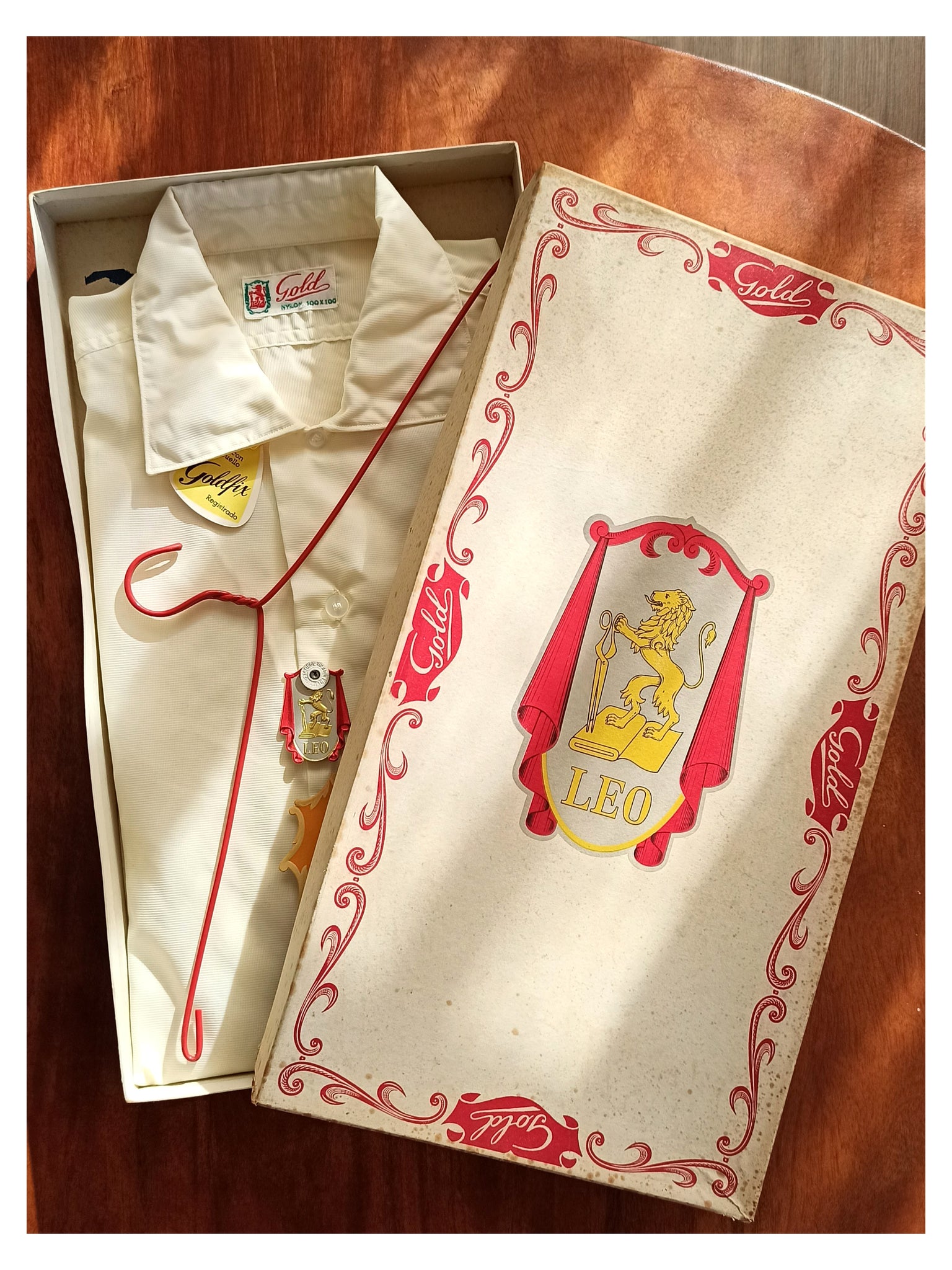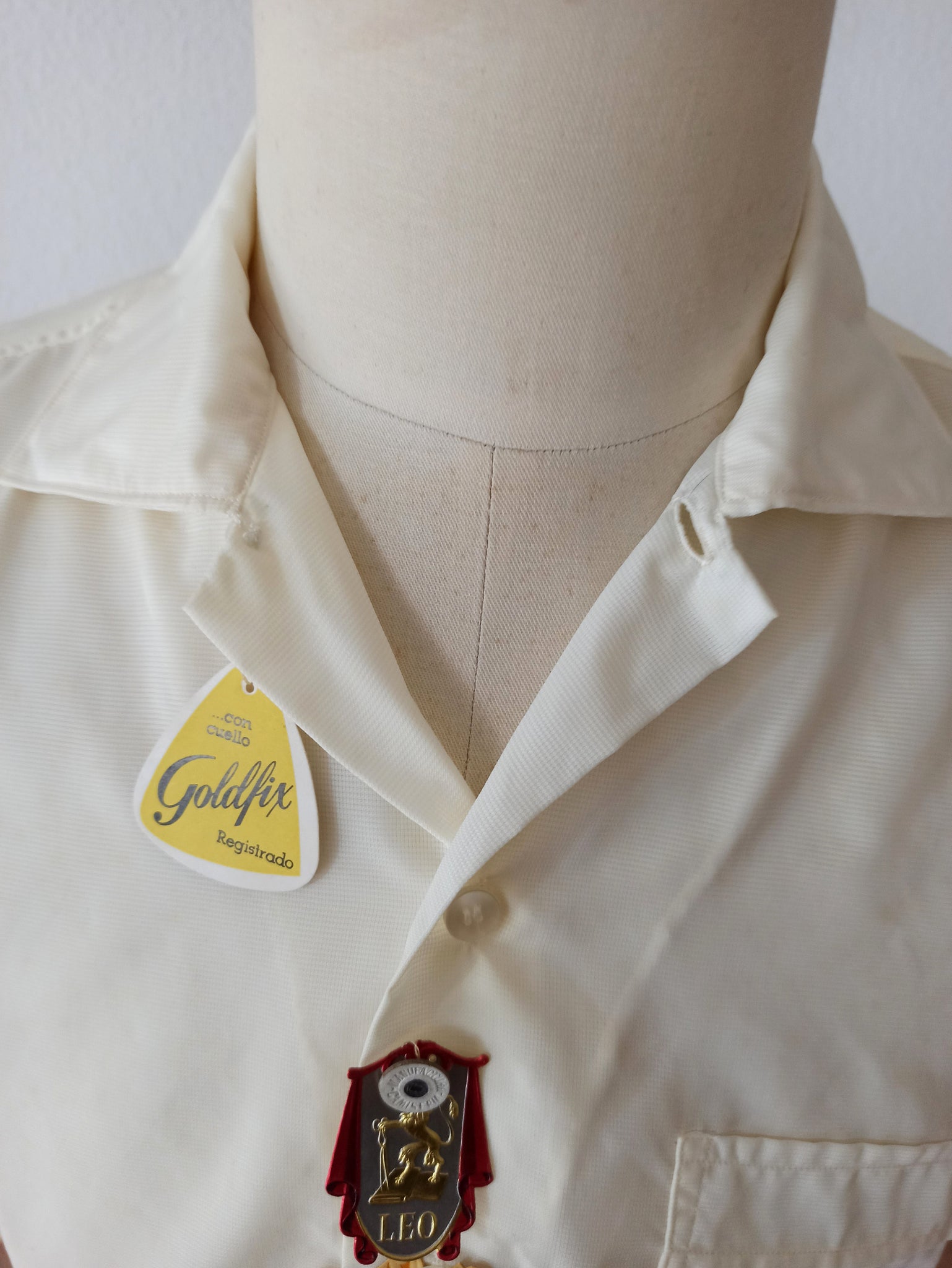 This is an amazing item from the 1950s by Leo, Spain. Only the box is already a collector's piece, including that adorable hanger. The quality of the shirt is just exquisite. These tags are so beautiful, including the Goldfix Collar one. 100% Nylon in white with a subtle texture. Short sleeve. Fits like a medium/large, please check the measurements. Box and hanger are included.