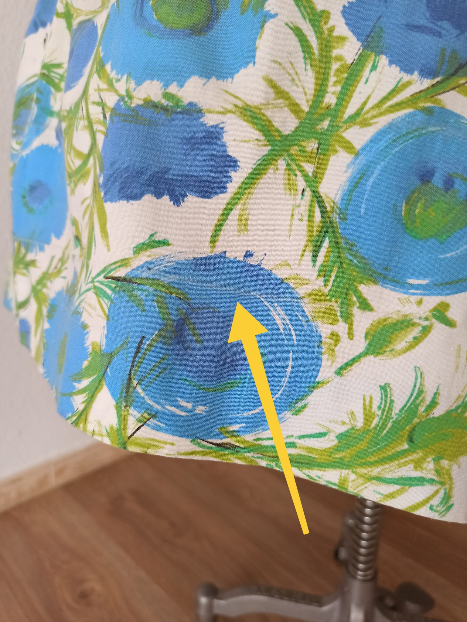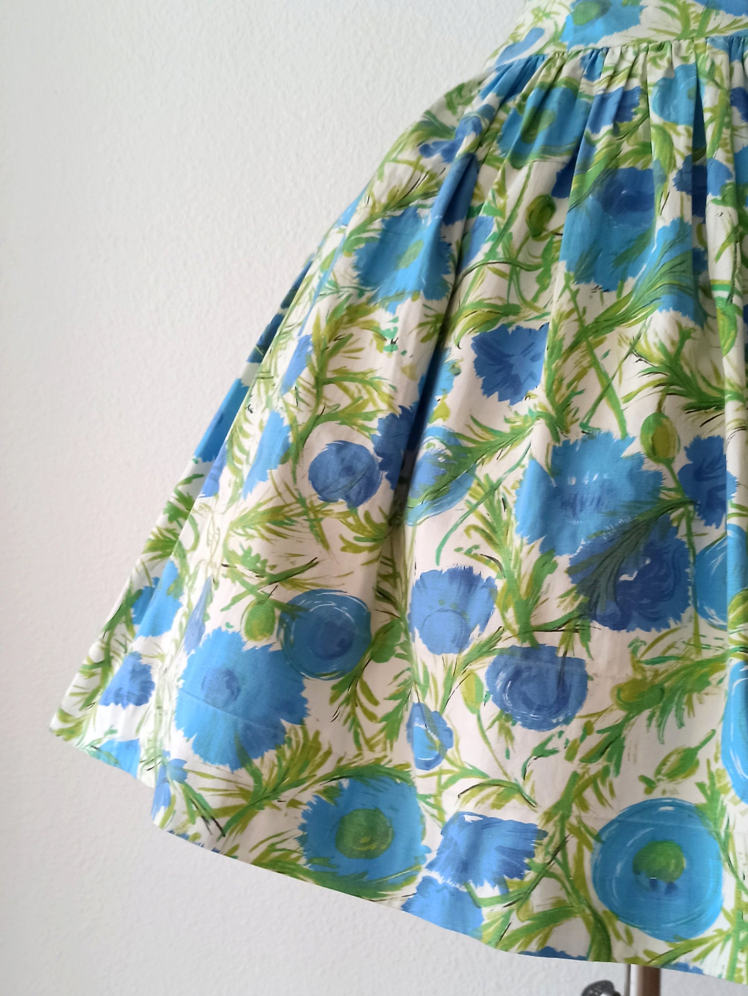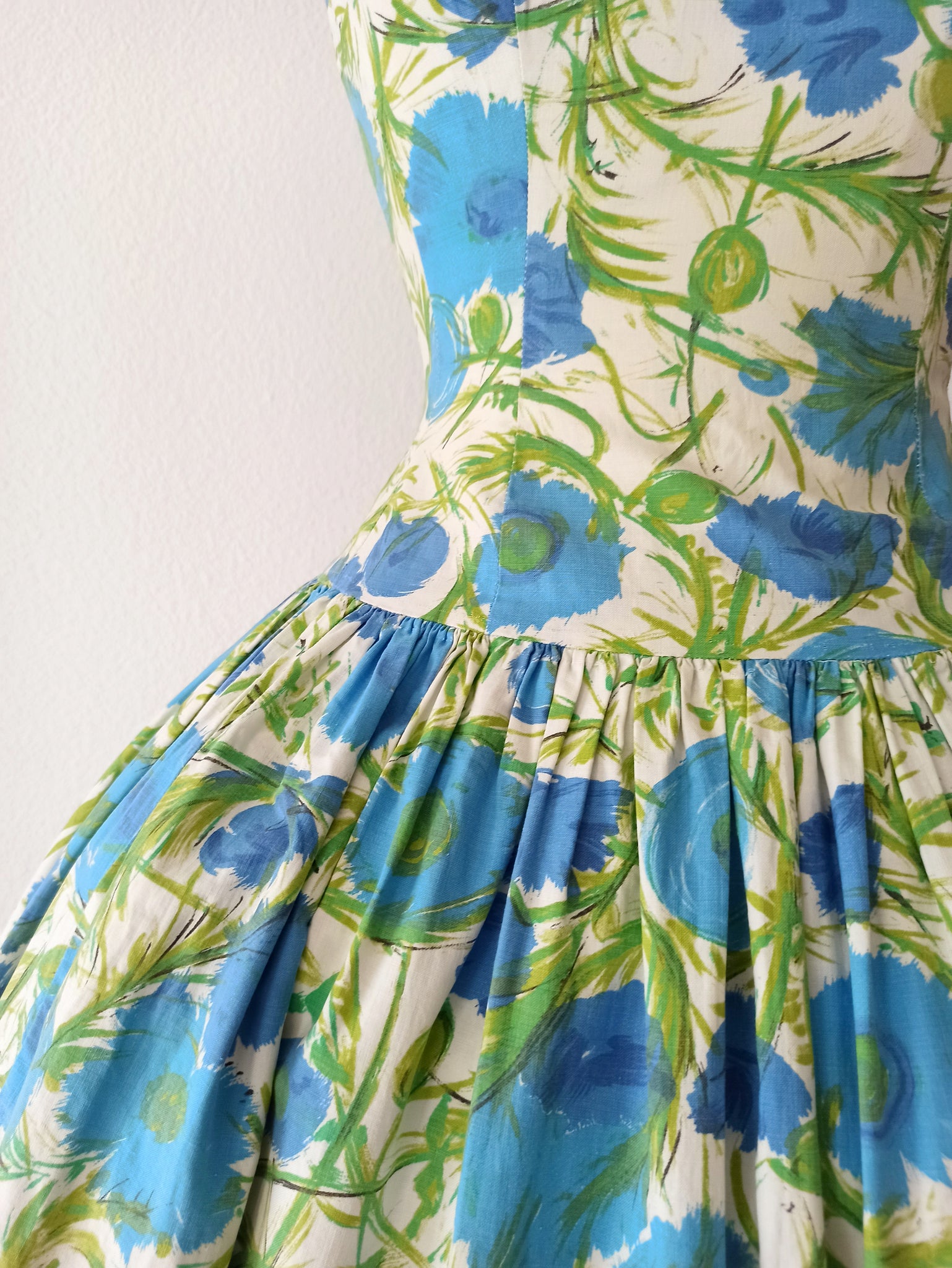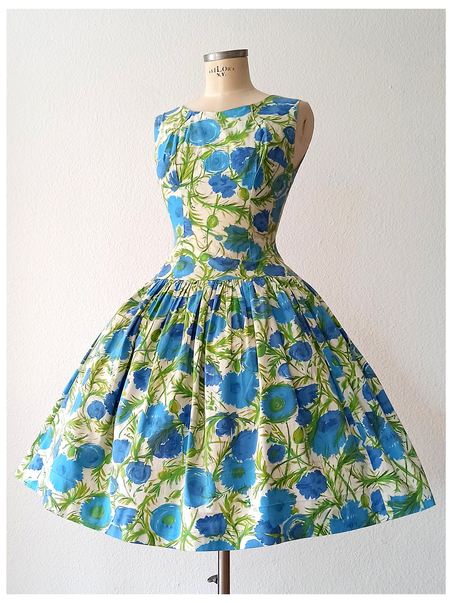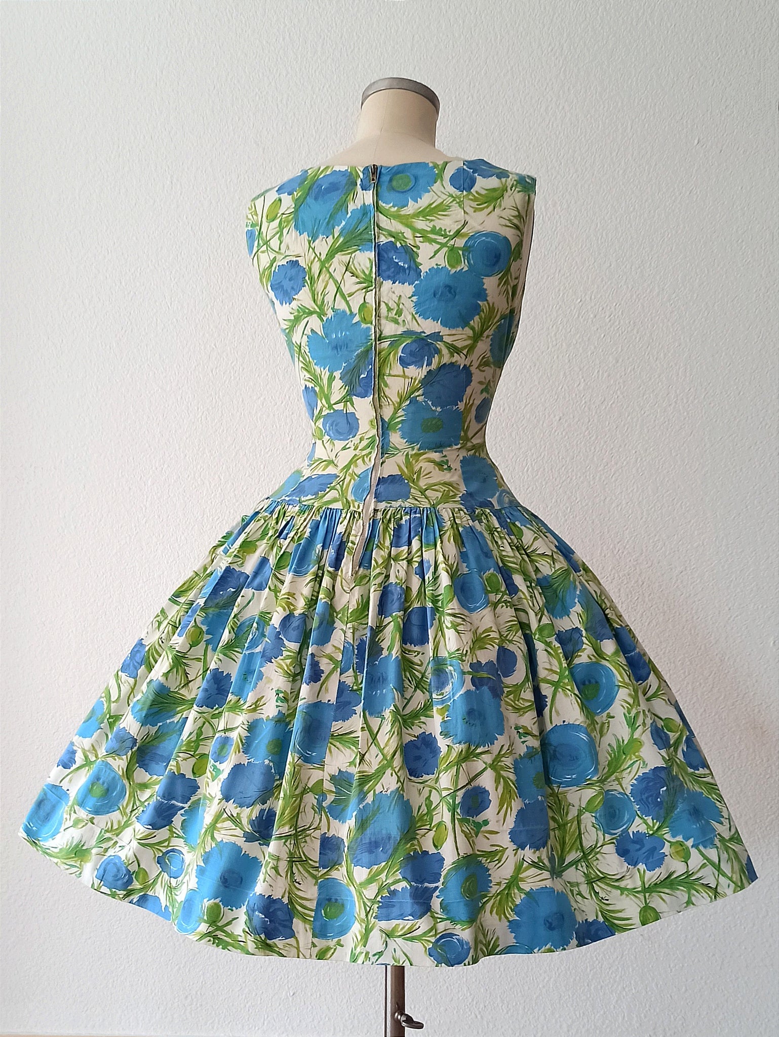 This is a fabulous dress from the 1950s. The fabric is cotton with an amazing abstract floral print in blue and green over a white background. She has an exquisite shape with a precious dropped skirt. She closes with a back metal zipper.
