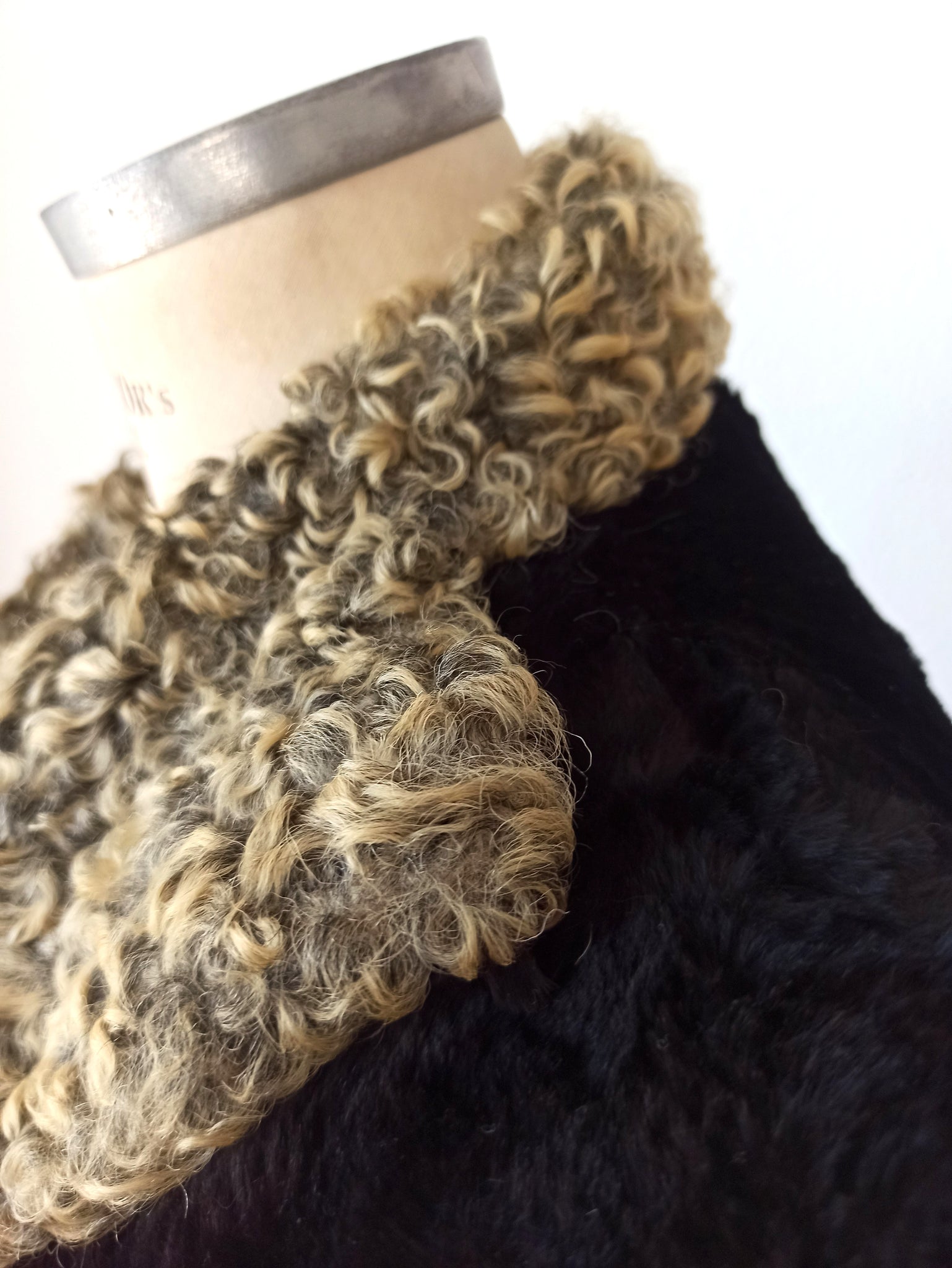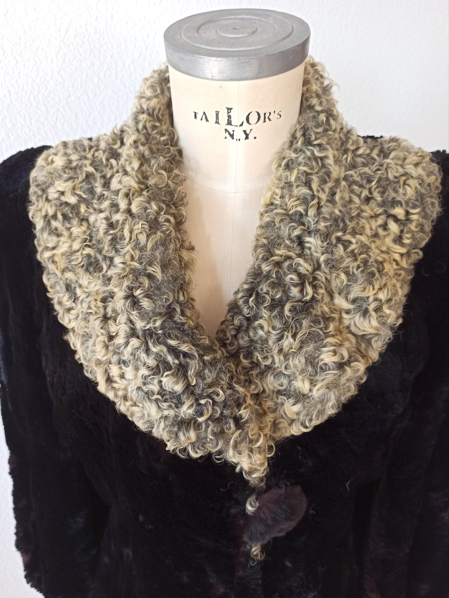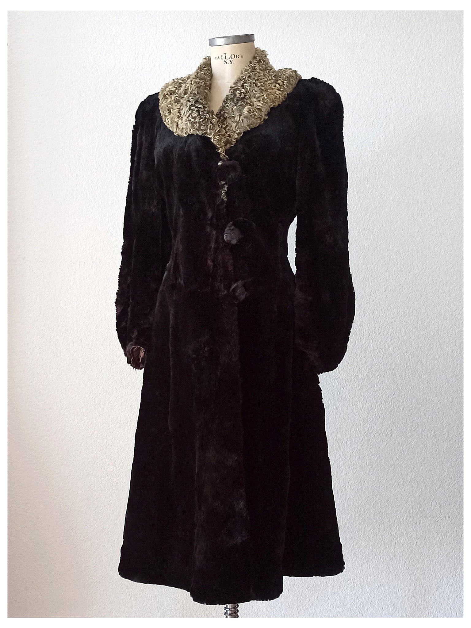 This is a true fabulous long coat from the late 1930s or very early 1940s by Thiemann, Germany. Top quality makers. Black fur with false astrakhan collar. Balloon sleeves. Diagonal cut closing with three buttons. Padded shoulders. Rayon silk lining.