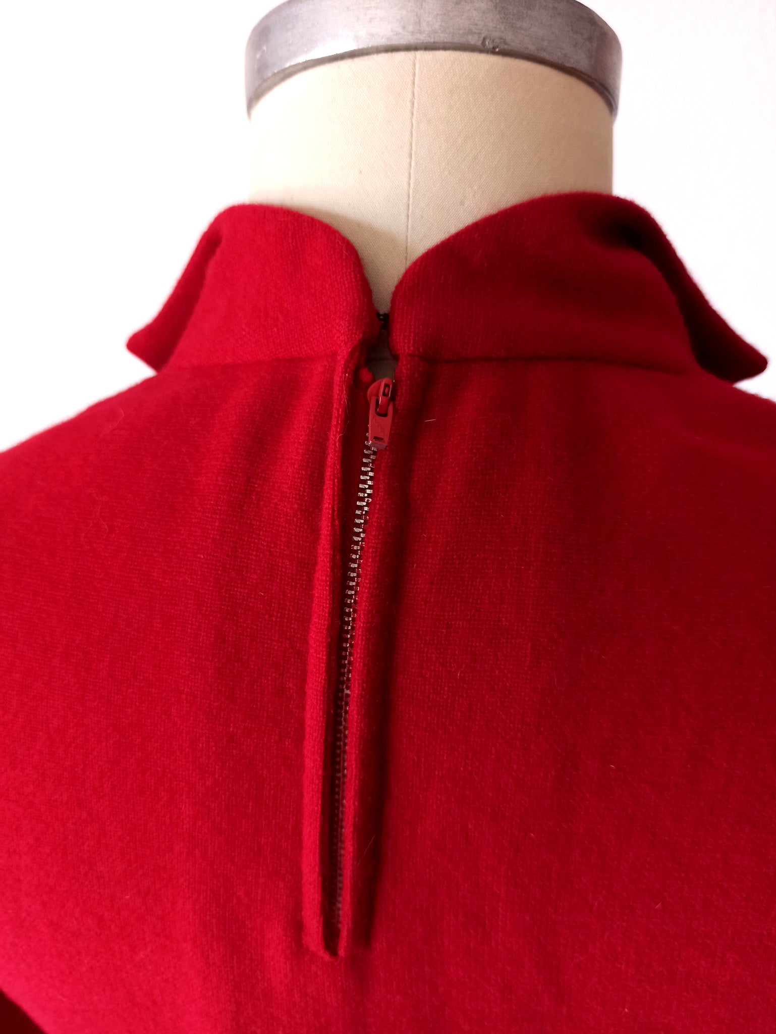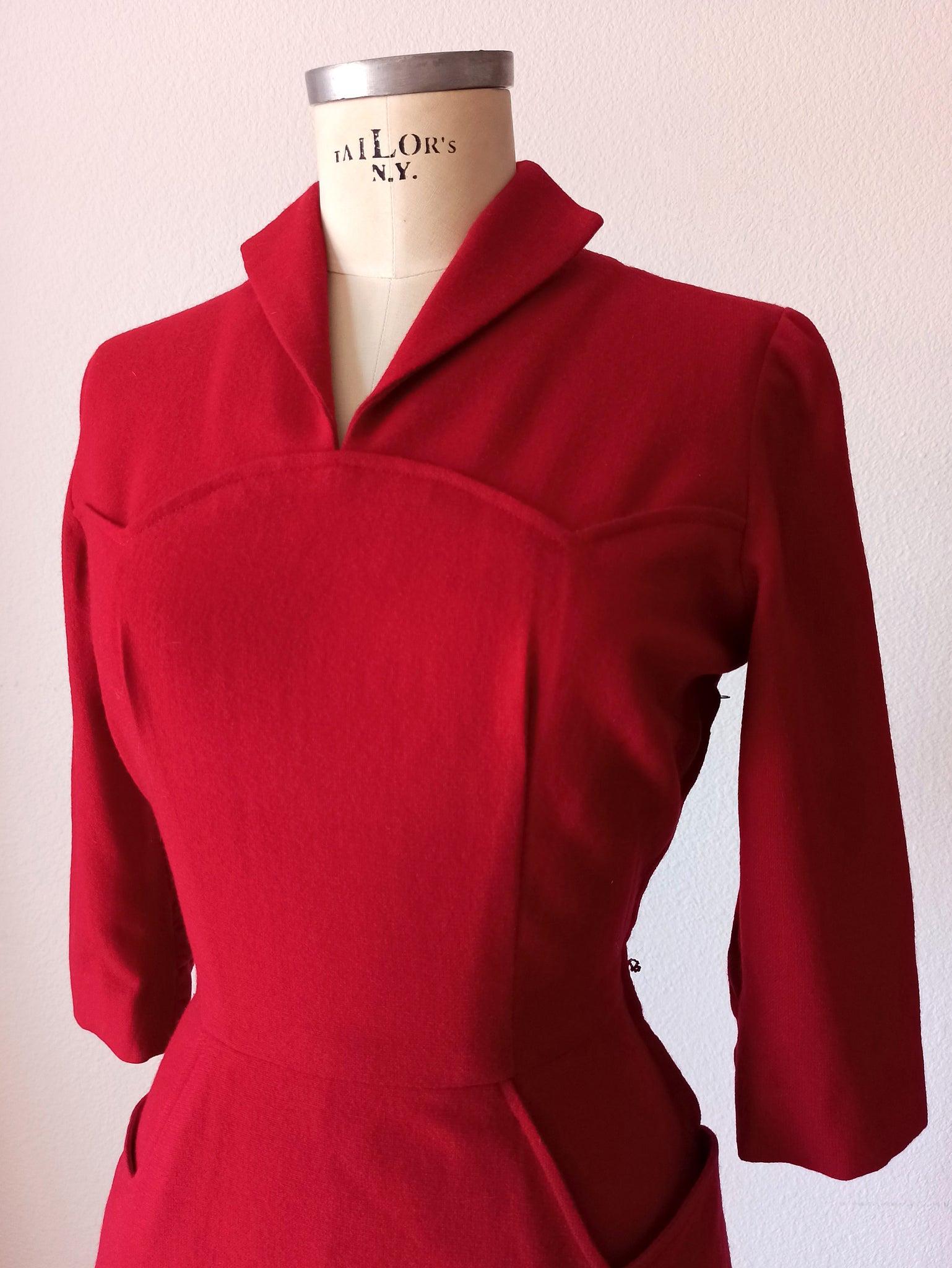 This is a stunning dress from the late 1940s or very early 1950s. The fabric is soft wool in a solid red color. She has an amazing collar and front bodice design. Two fabulous pockets! Exquisitely tailored, she has an precious shape. She closes with a metal zippers. The skirt has a satin lining. This dress has no label but it is not homemade and is a quality garment.