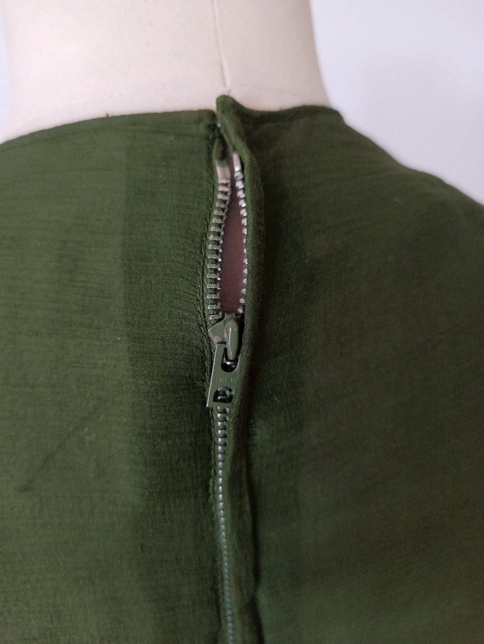 This is an exquisite French dress from the very late 1950s or very early 1960s. The fabric is a top quality chiffon silk in a precious moss green color. She has a super chic rounded collar and a crossed waist design. Beautiful and light gathered skirt. She closes with a back metal ECLAIR zipper.