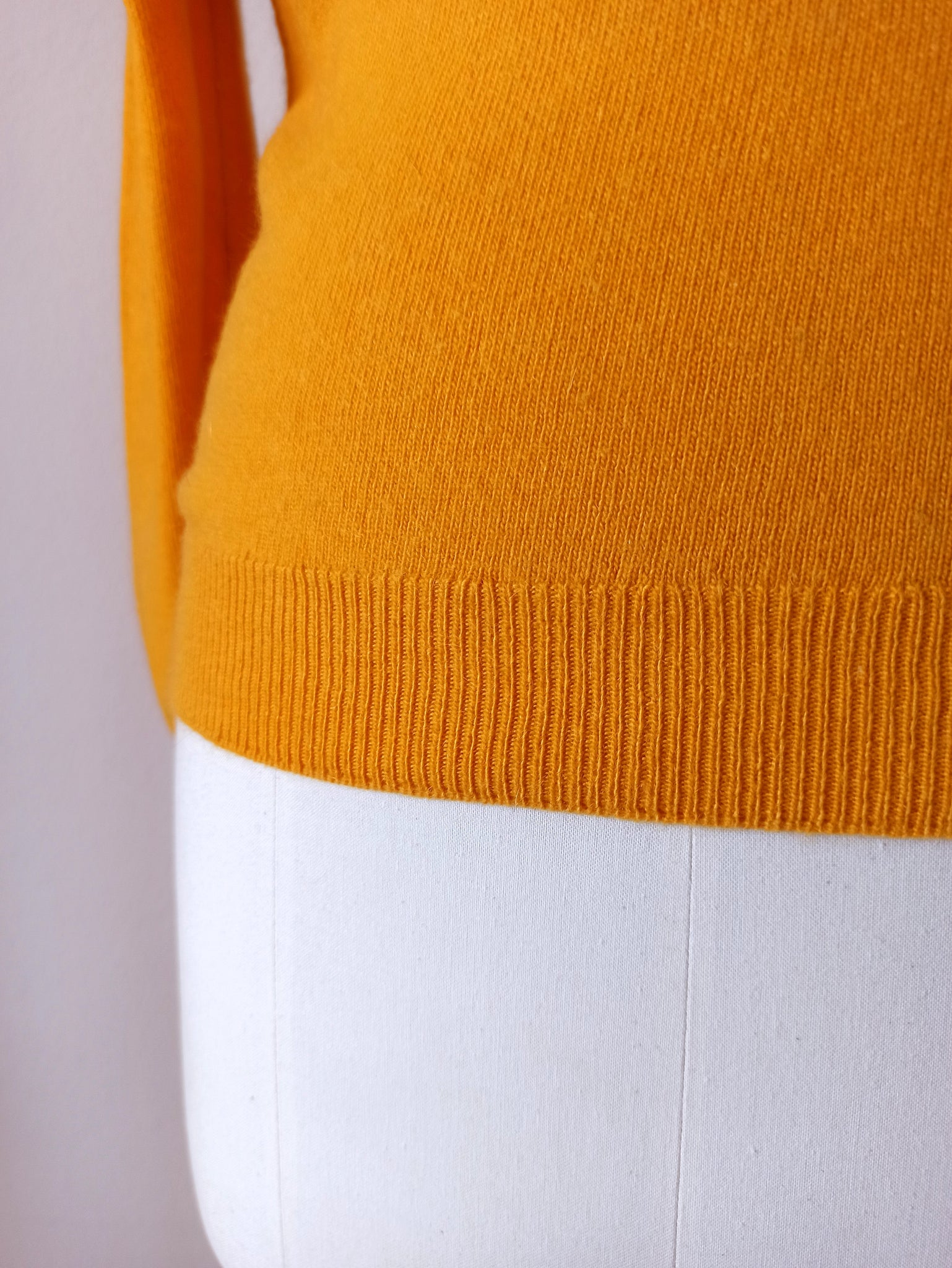 This is a precious turtleneck sweater from the late 1950s or very early 1960s by Pringle of Scotland. 100% pure cashmere in a beautiful and bright amber yellow color. Tag reads Size 36.