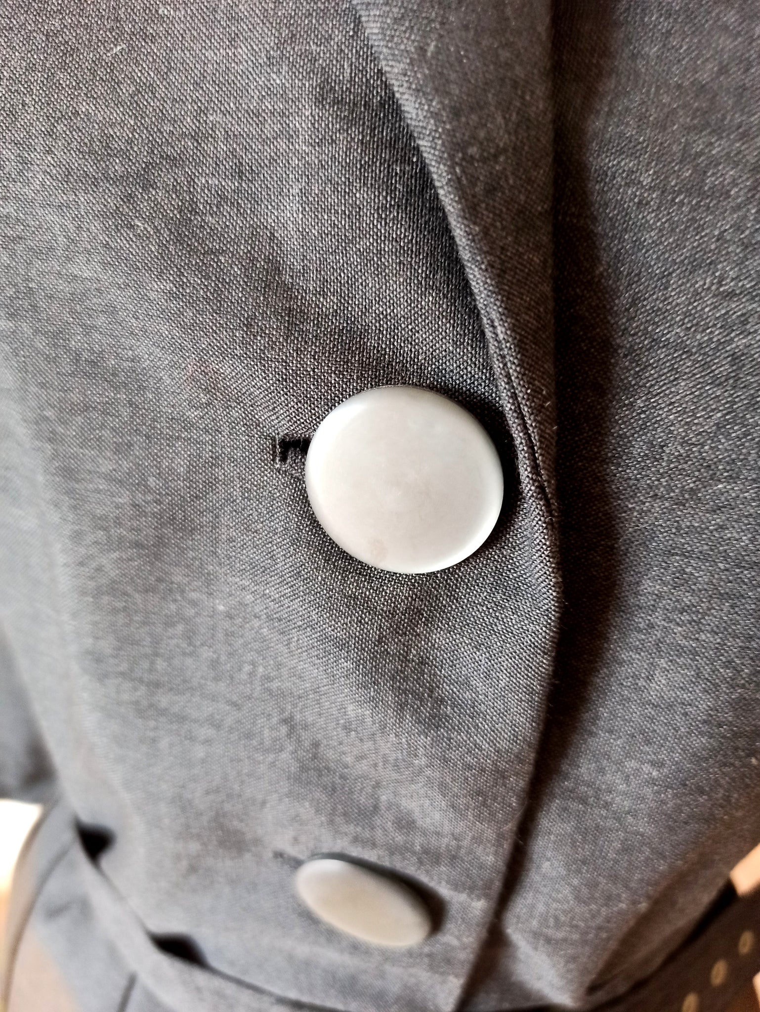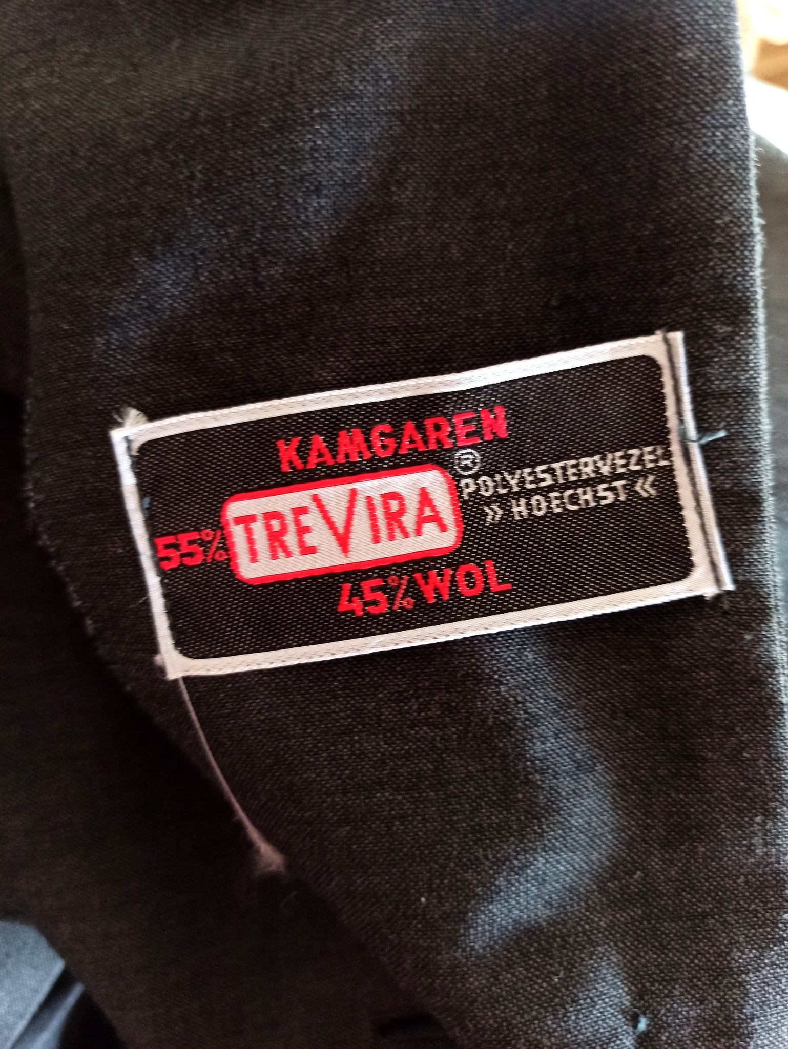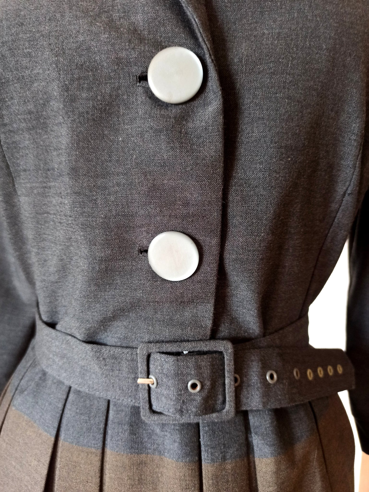 This is an exquisite dress from the very late 1950s or very early 1960s by Trevira, Germany - but this one was made for the Netherlands market. The fabric is blend wool (45%) with polyester (55%) in dark grey with a beautiful palette of autumnal colors on the skirt. Very elegant and very well tailored closing with big buttons and a matching belt. Astor buckle.