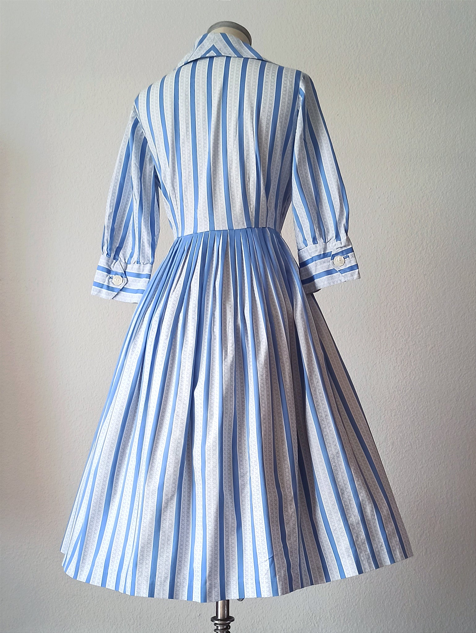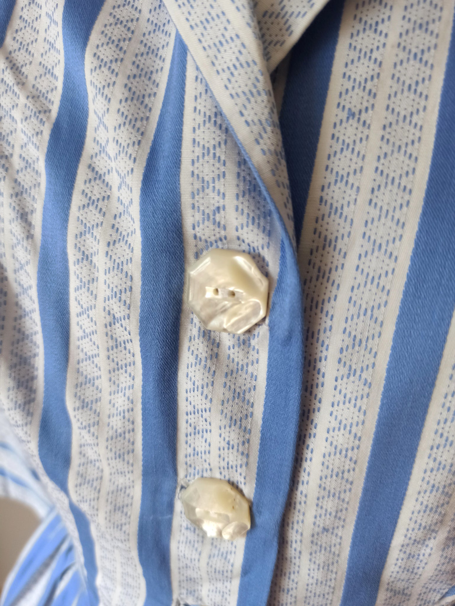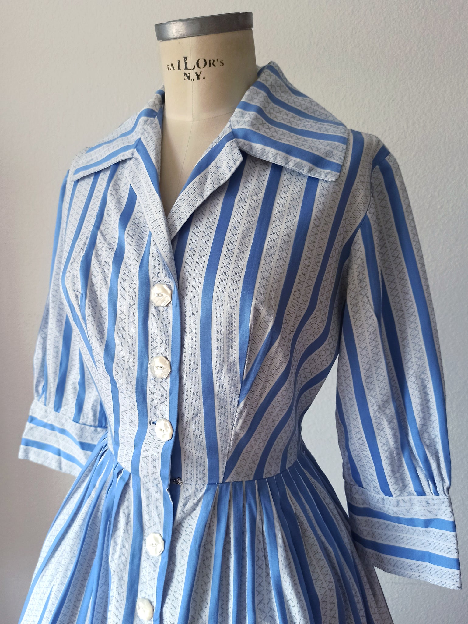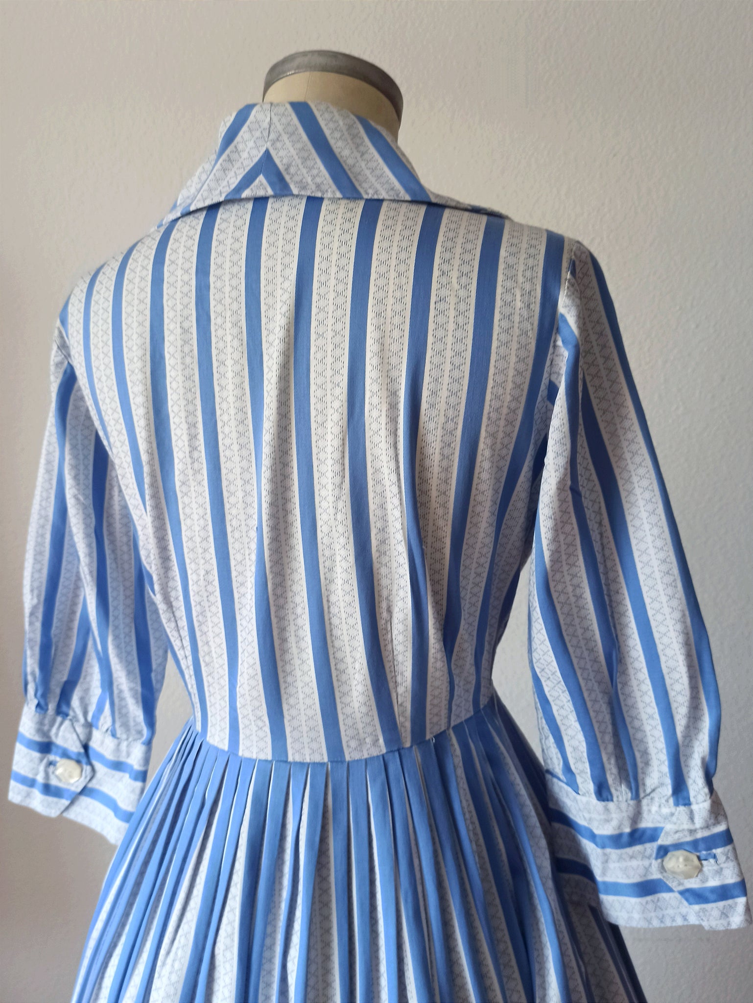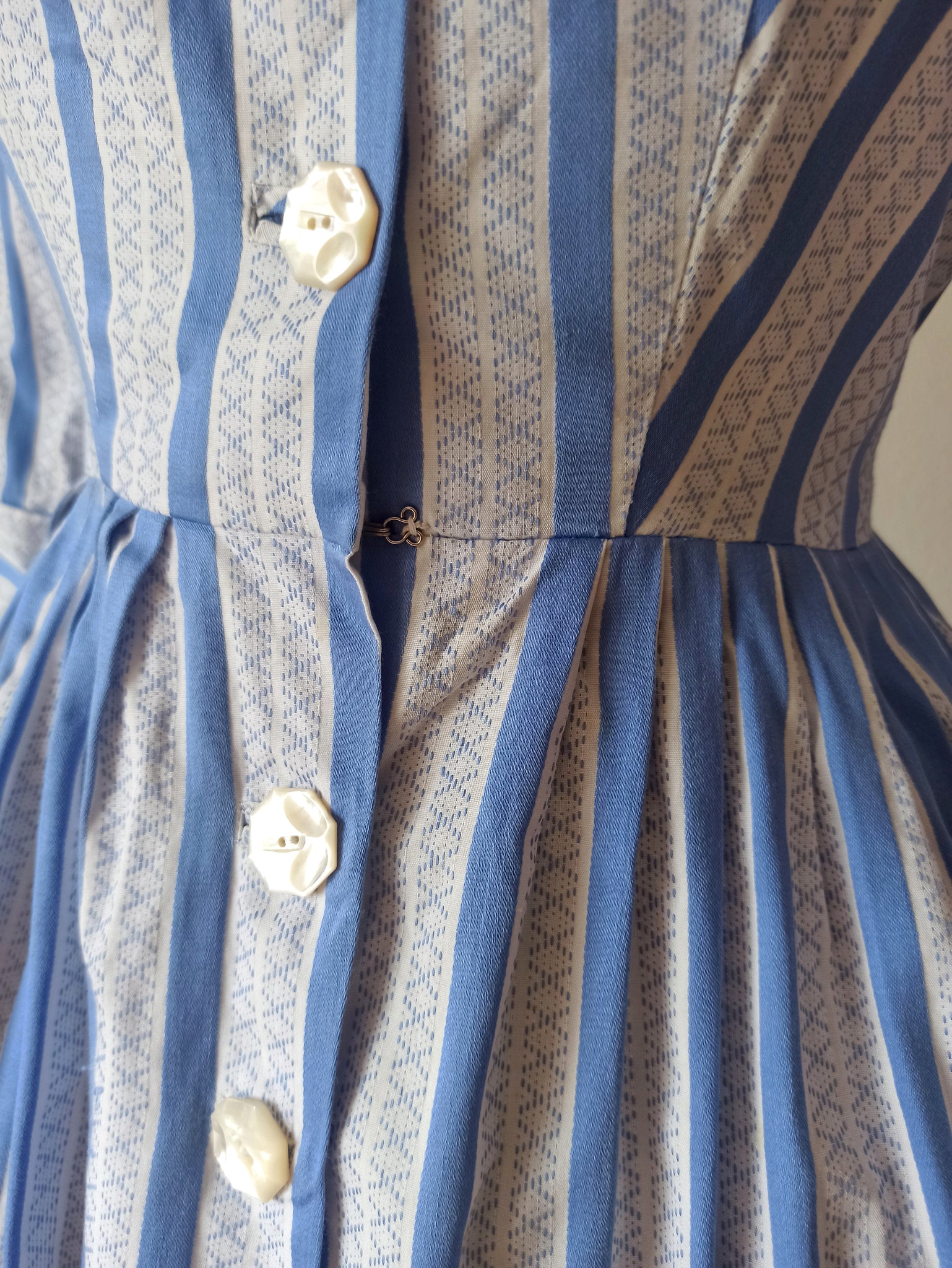 This is a super cute dress from the 1950s. The fabric is top quality cotton in white and blue. She has a fabulous collar and closes with a set of amazing carved mother of pearly buttons. Classic cut with 3/4 sleeves and a pleated skirt.