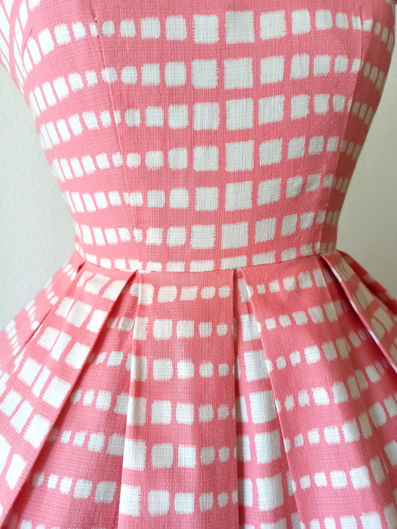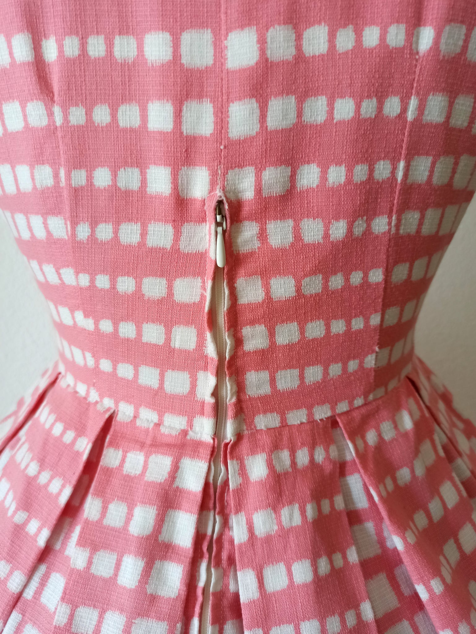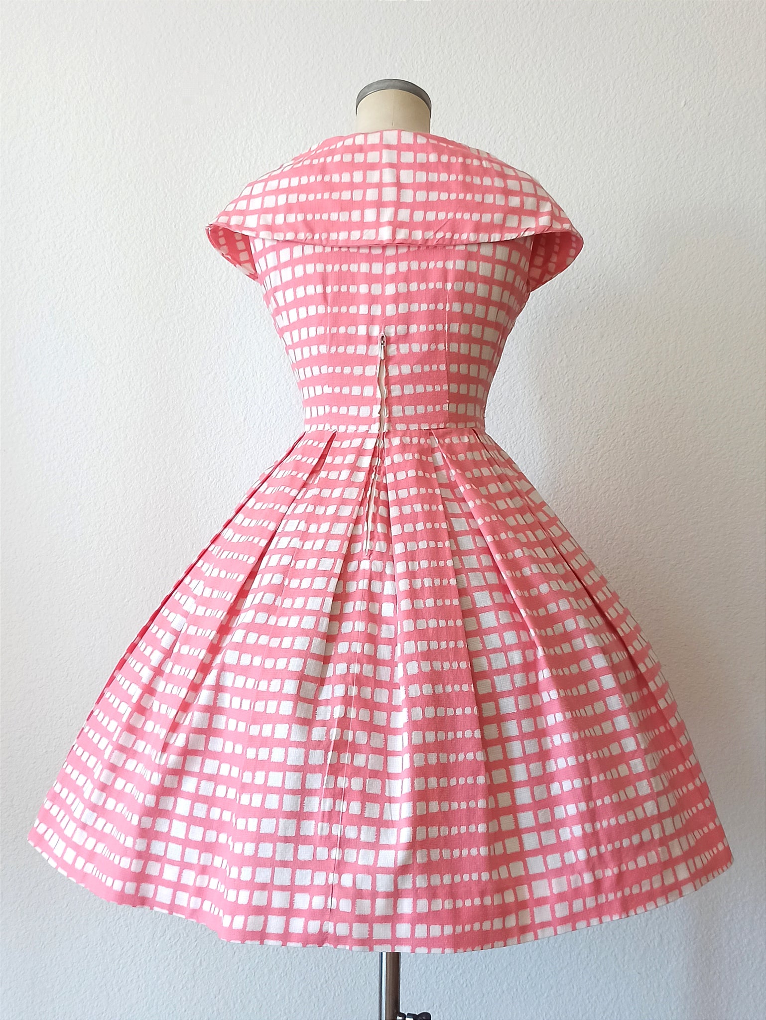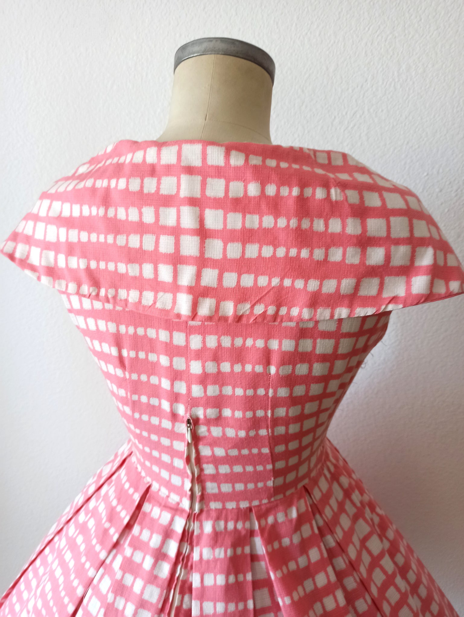 This is an adorable dress from the late 1950s. The fabric is soft barkcloth in pink and white. She has an exquisite and precious collar and a classic cut. She closes with a back zipper.