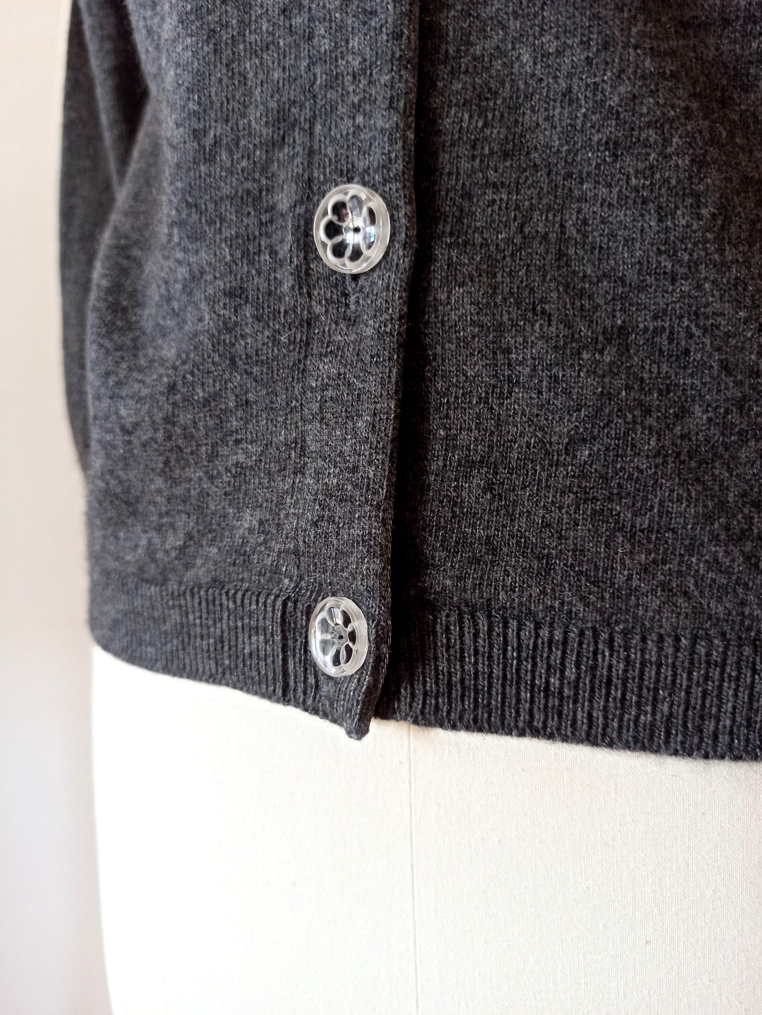 This is an exquisite cardigan from the 1950s by one of the best Scottish labels, Ballantyne. 100% pure cashmere in grey color. She has amazing lucite buttons!