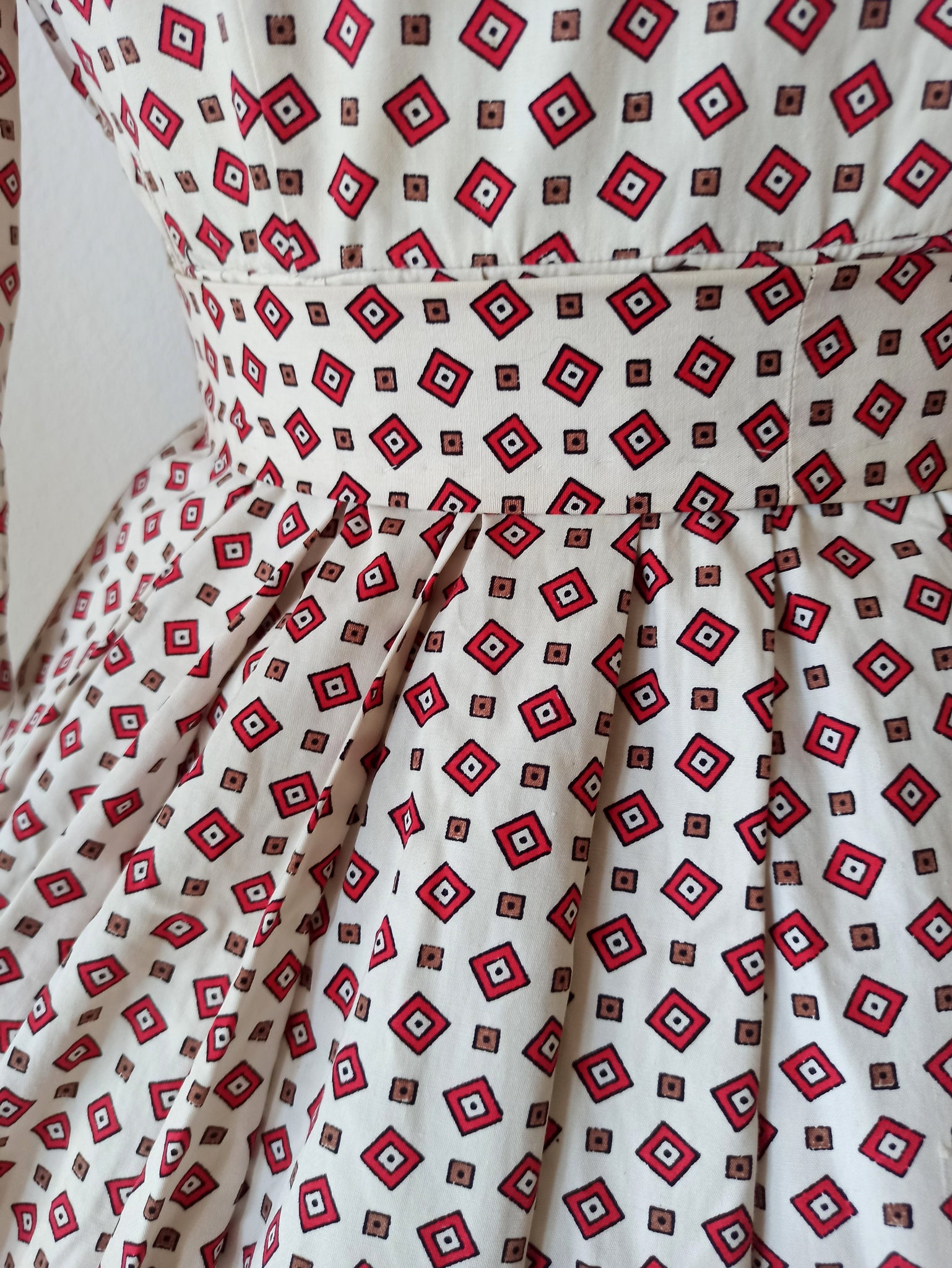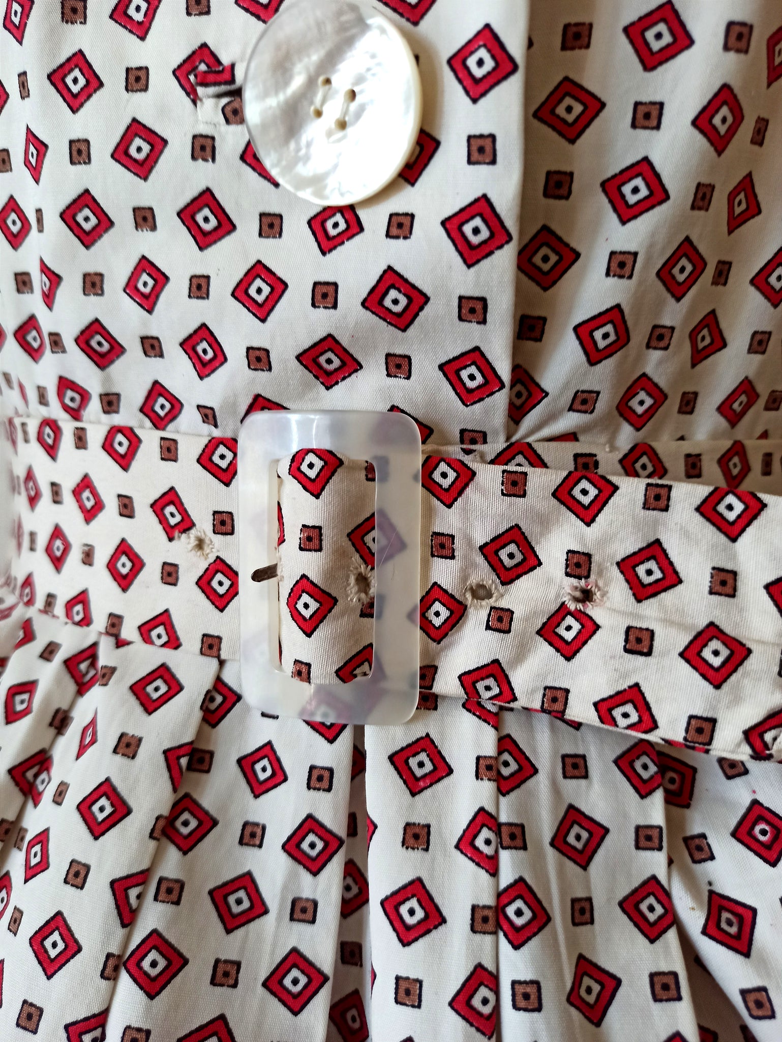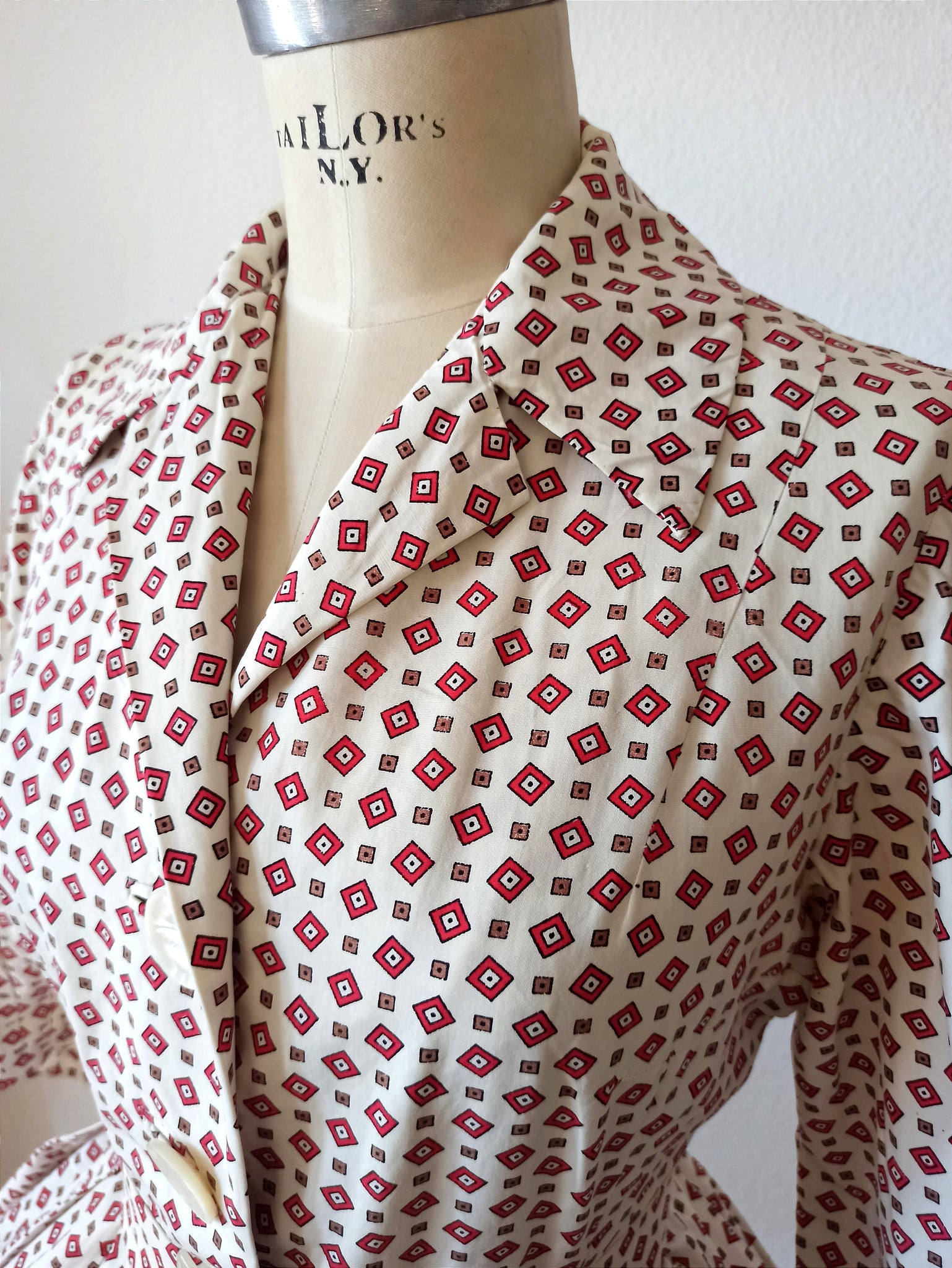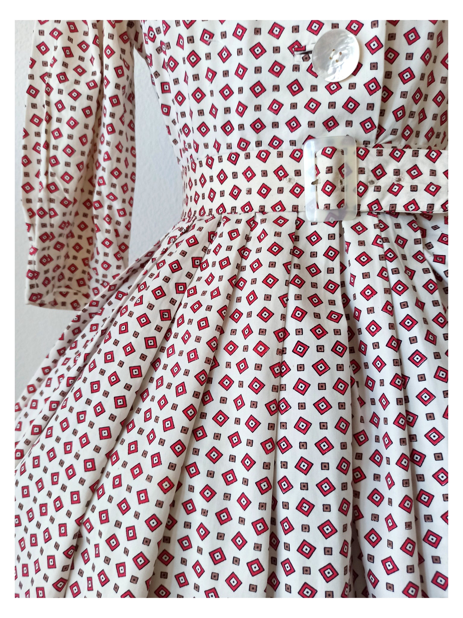 This is a gorgeous Italian dress from the 1950s. The fabric is cotton with a very cute geometric print. She has a precious shirt-collar design with big front buttons. The sleeves are so exquisite, check those five seams at the end of the sleeve! Matching belt with lucite buckle. She closes with side snap-buttons and one hook.