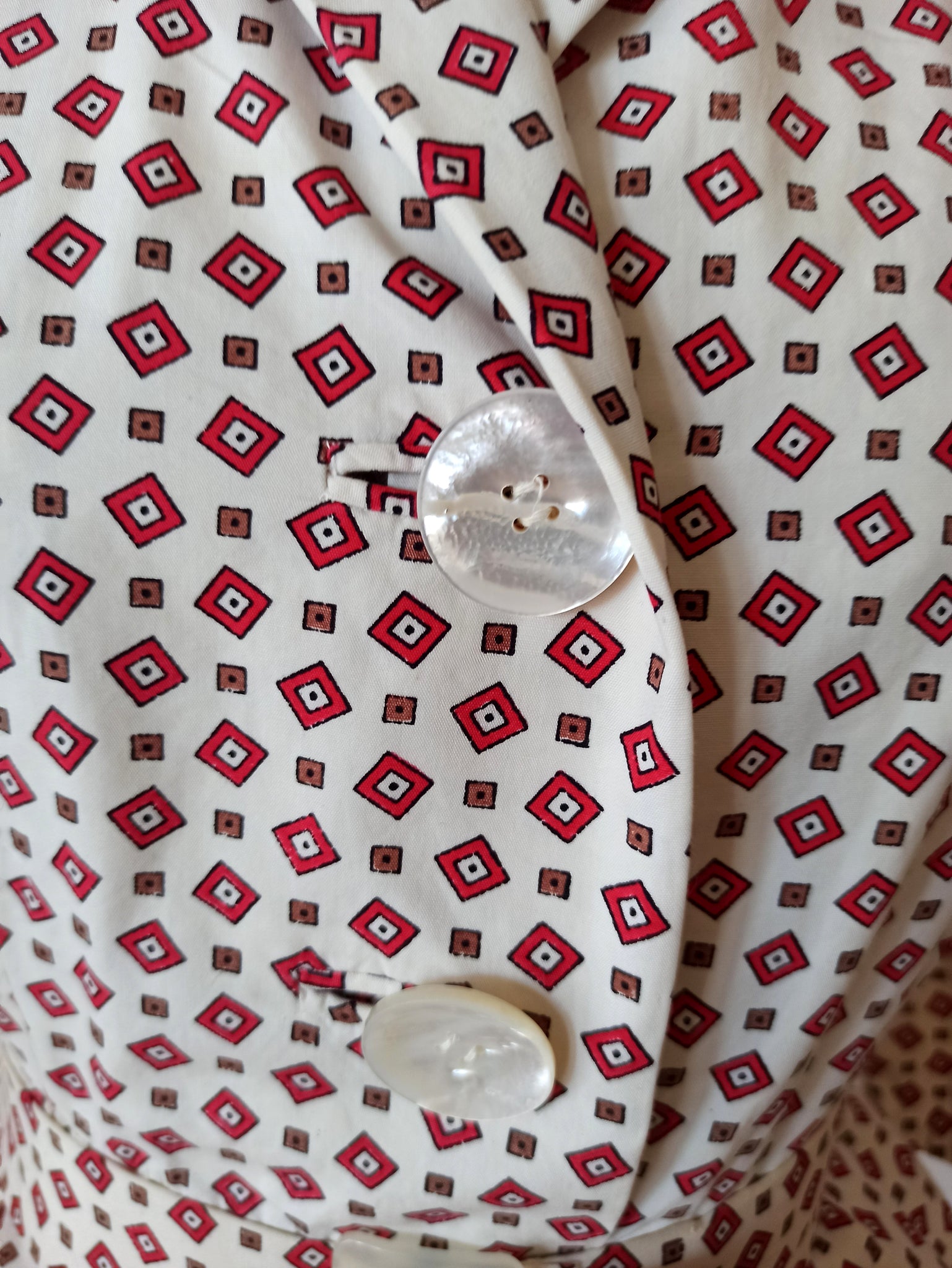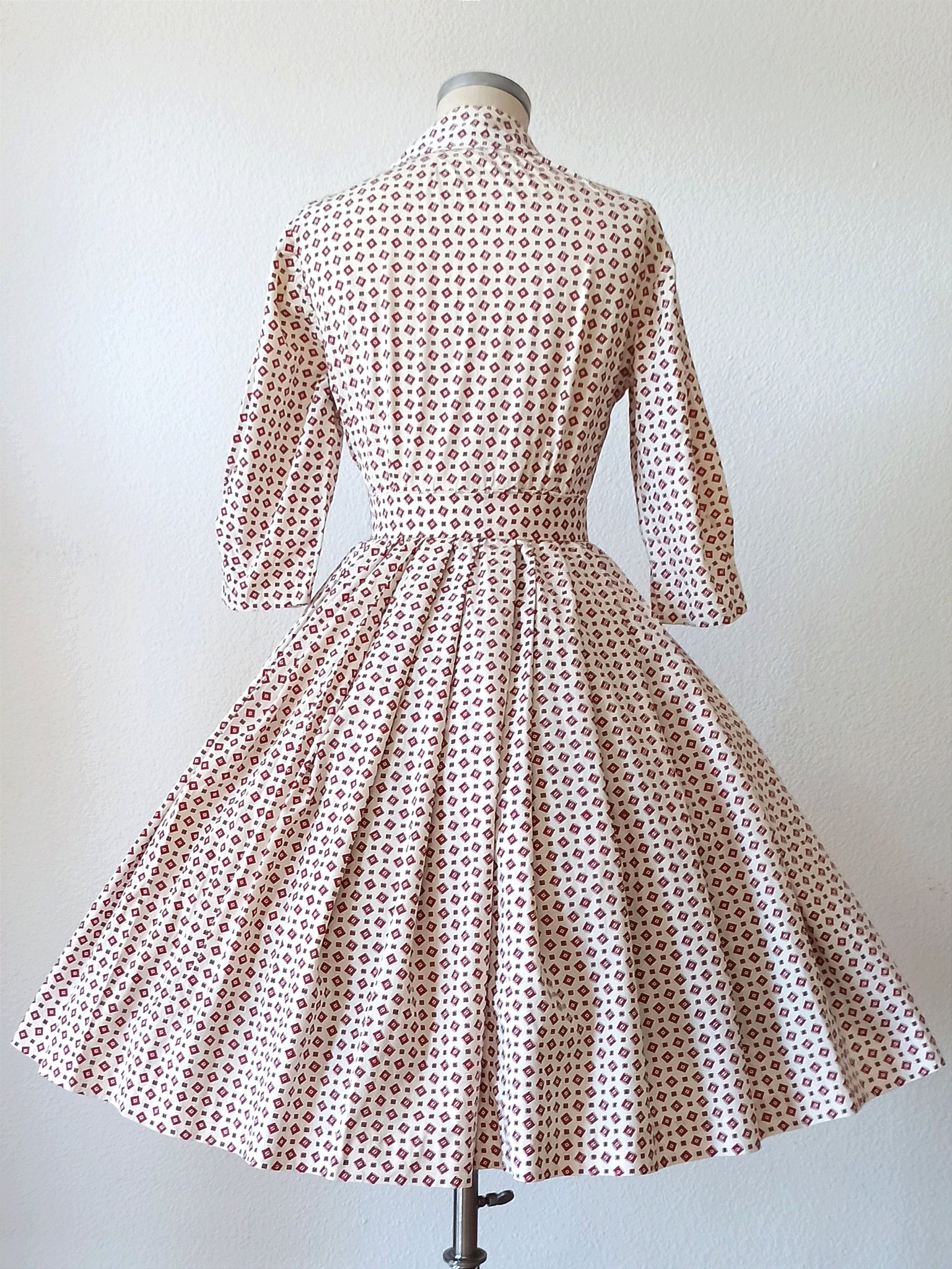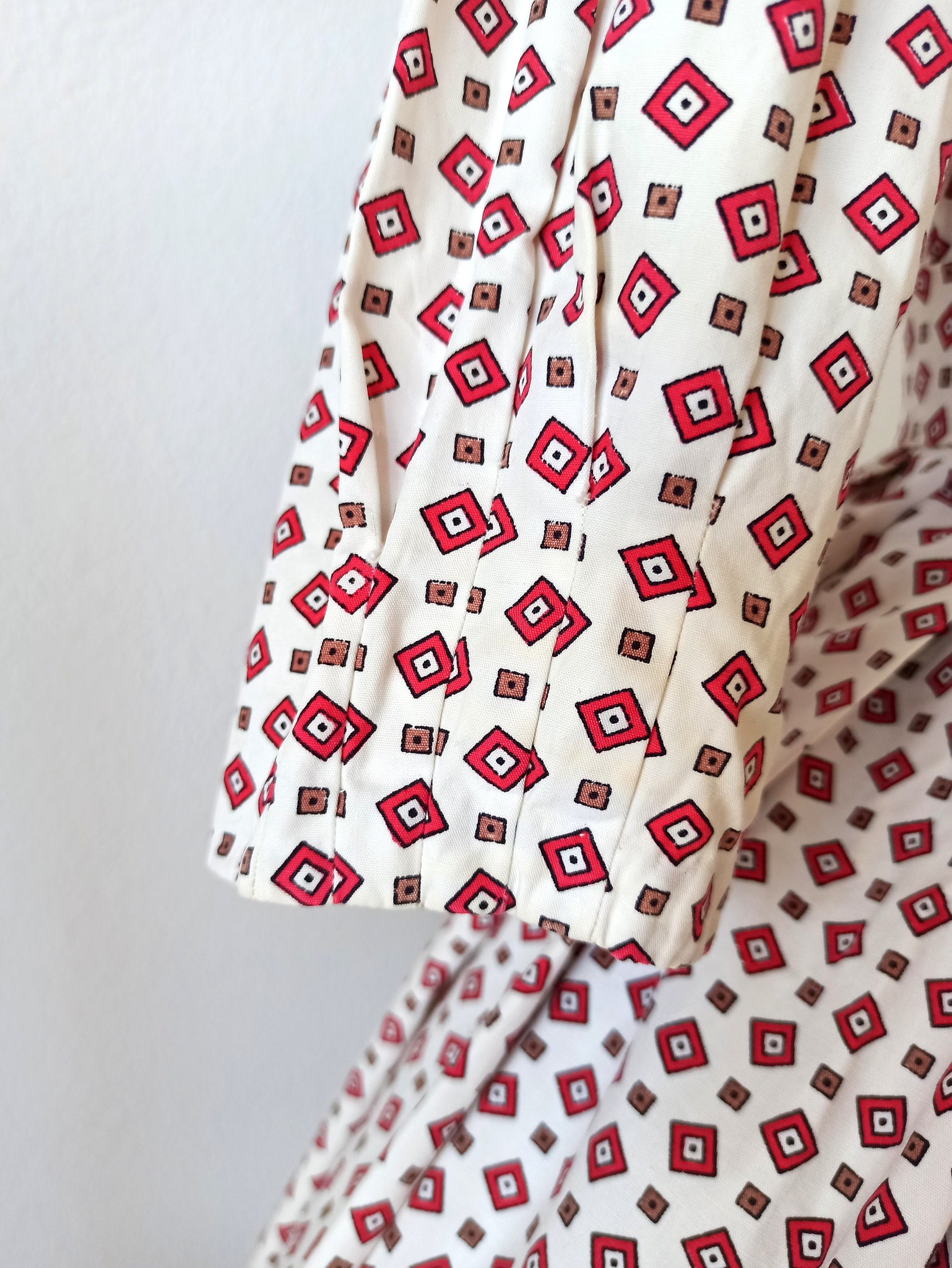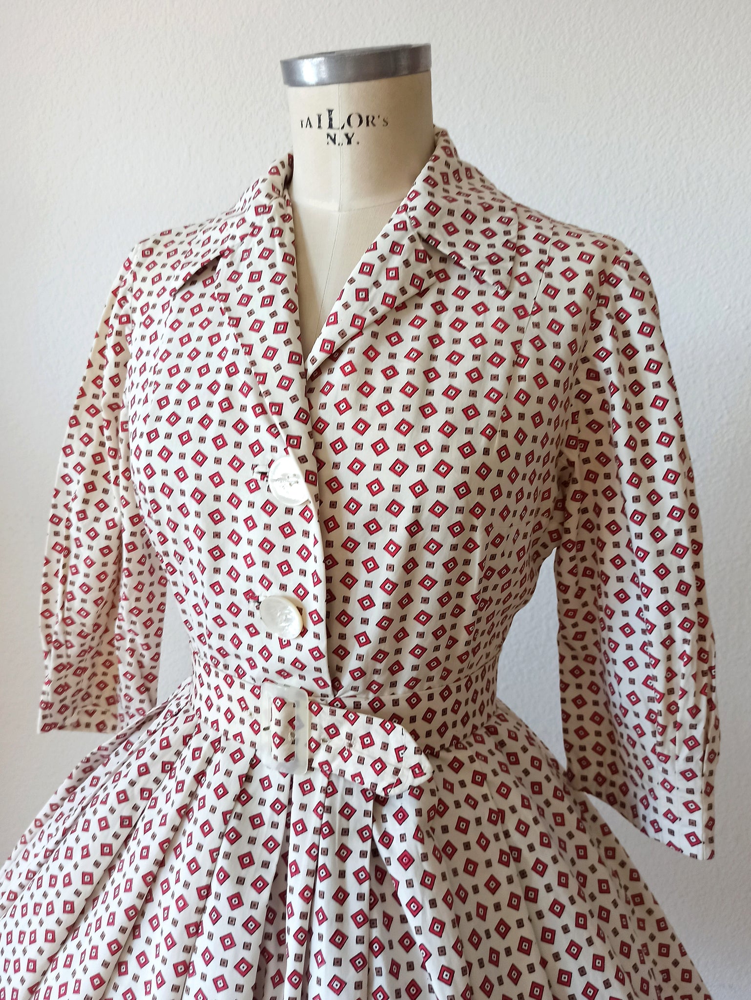 This is a gorgeous Italian dress from the 1950s. The fabric is cotton with a very cute geometric print. She has a precious shirt-collar design with big front buttons. The sleeves are so exquisite, check those five seams at the end of the sleeve! Matching belt with lucite buckle. She closes with side snap-buttons and one hook.