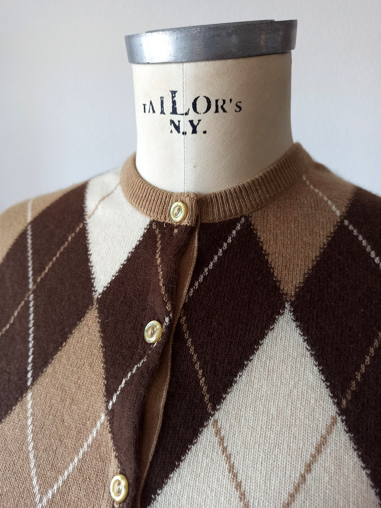 This is one of the 1950s iconic Intarsia designs from probably the best Scottish Cashmere label, Pringle of Scotland. 100% Pure cashmere with a precious argyle pattern. How it is usual with Pringle pieces, the whole cardigan is exquisitely made and the cashmere is amazingly soft. Its quality is so high that if you take care of this piece it will be with you in perfect condition for your whole life.