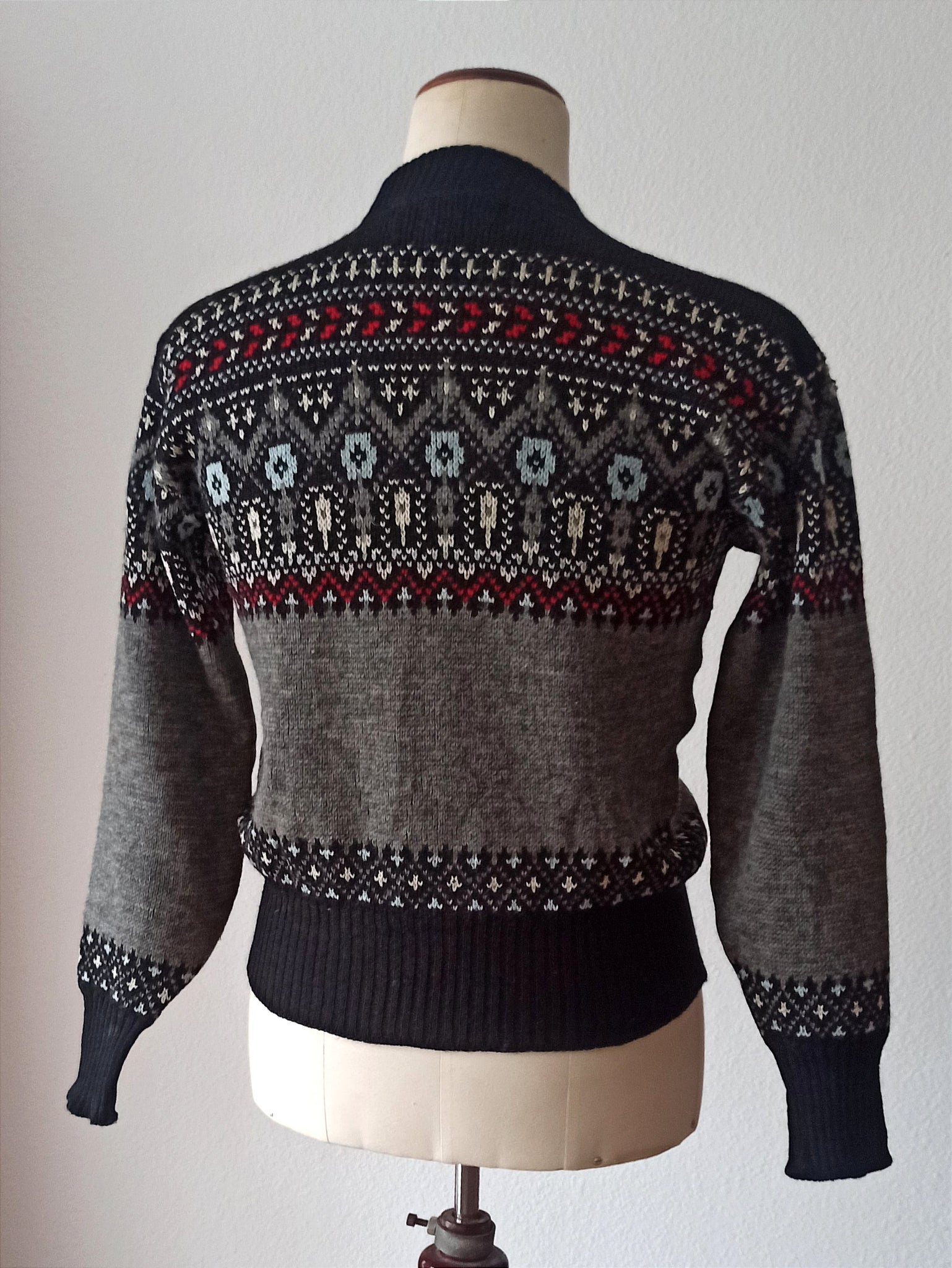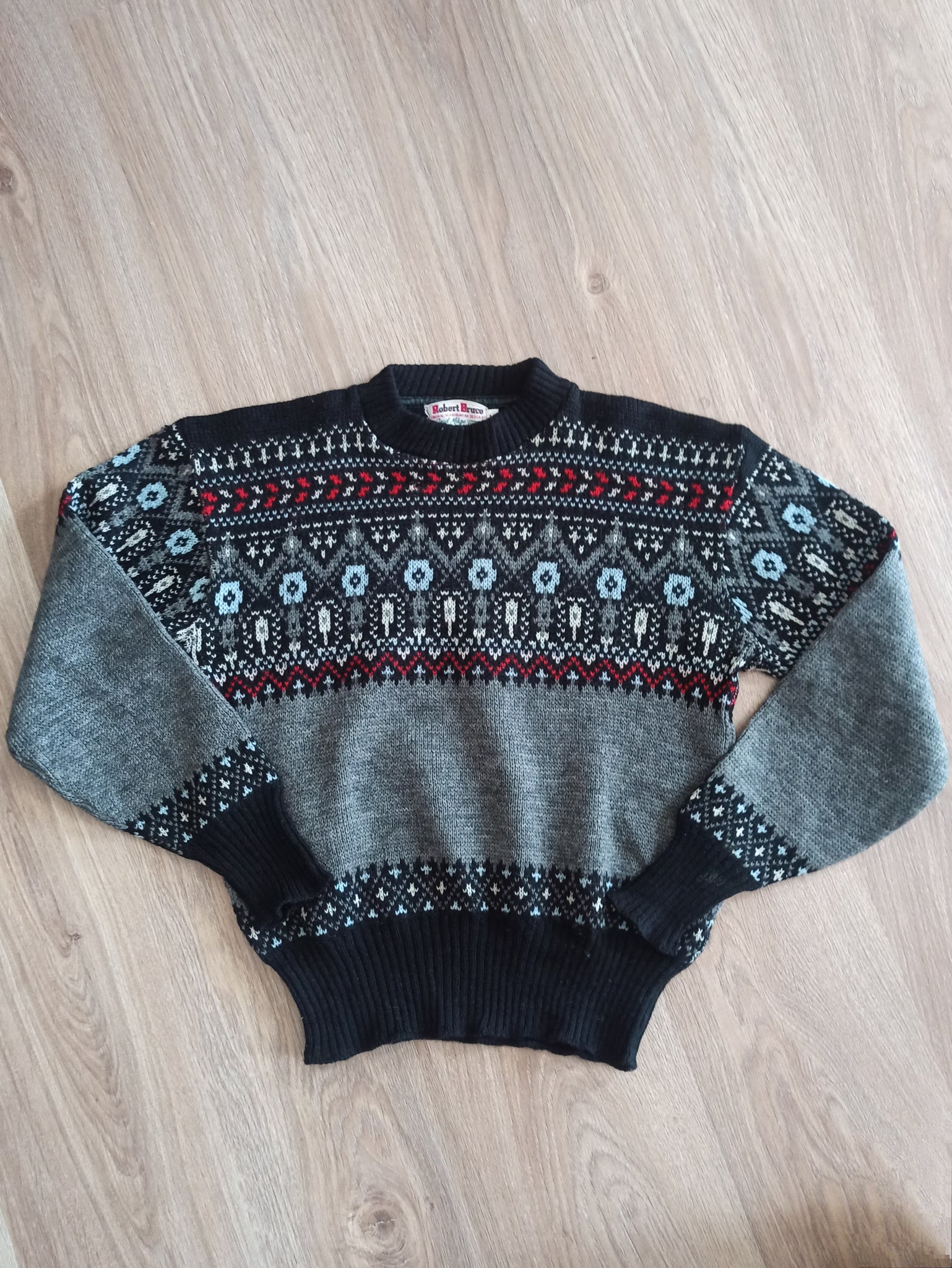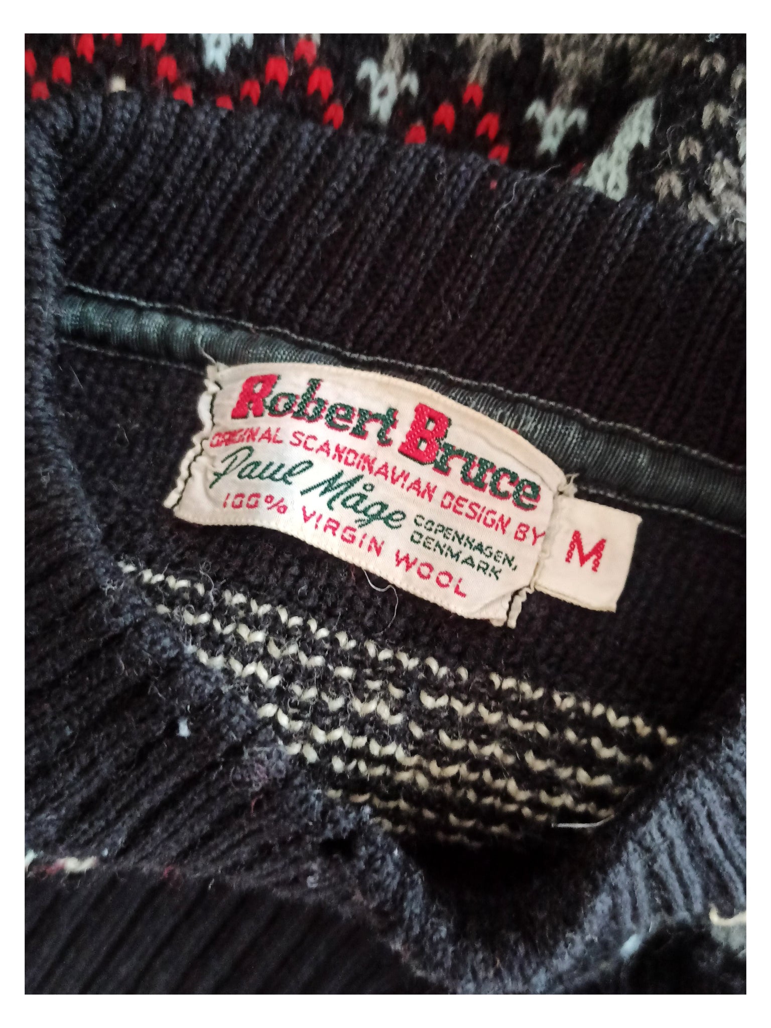 This is a fabulous men's sweater from the 1950s by Robert Bruce - Original Scandinavian Design by Paul Mage.  Wool knitted in black, dark grey, white, red and blue. Wide waistband and cuffs. Tag reads size Medium.