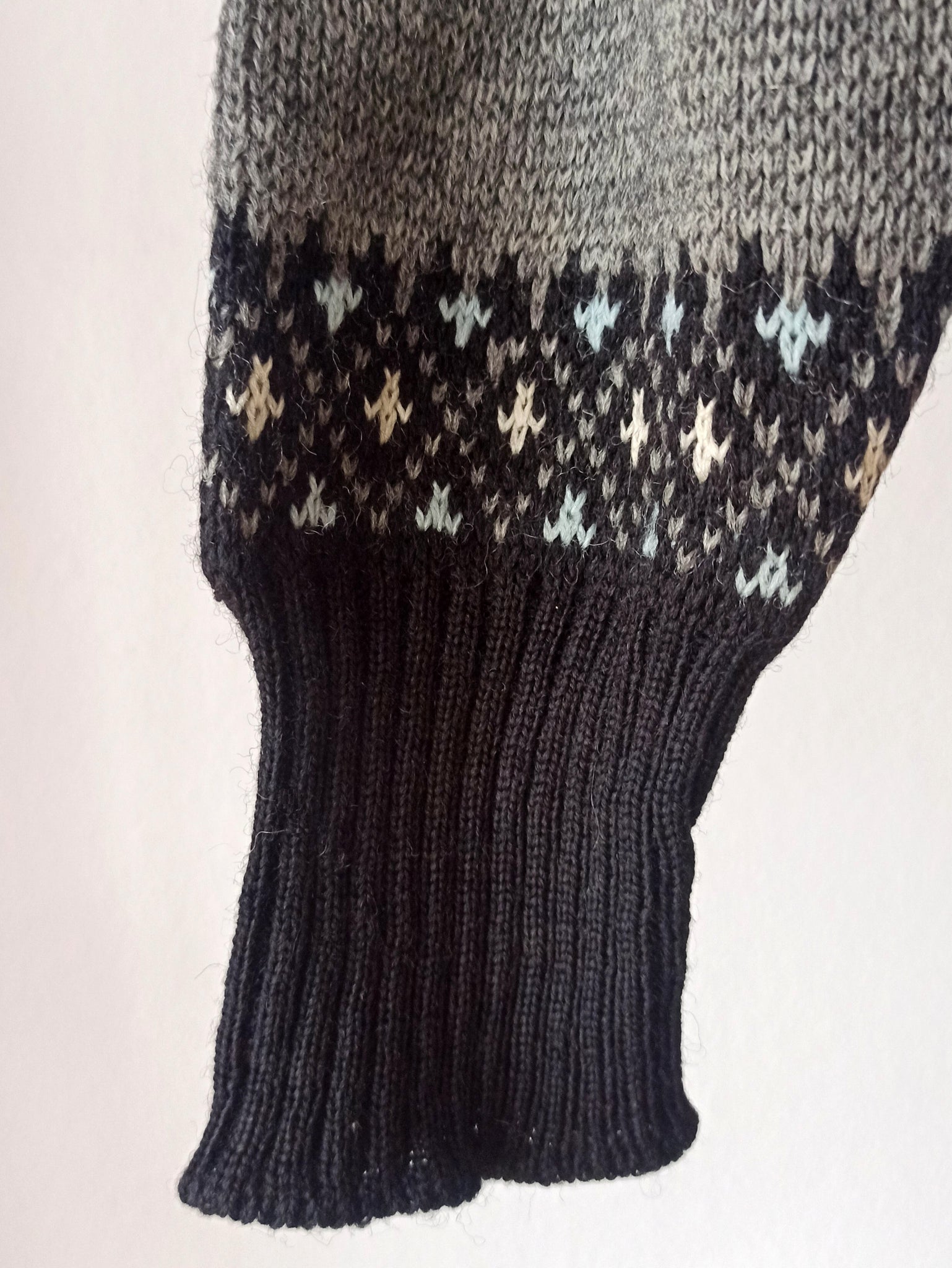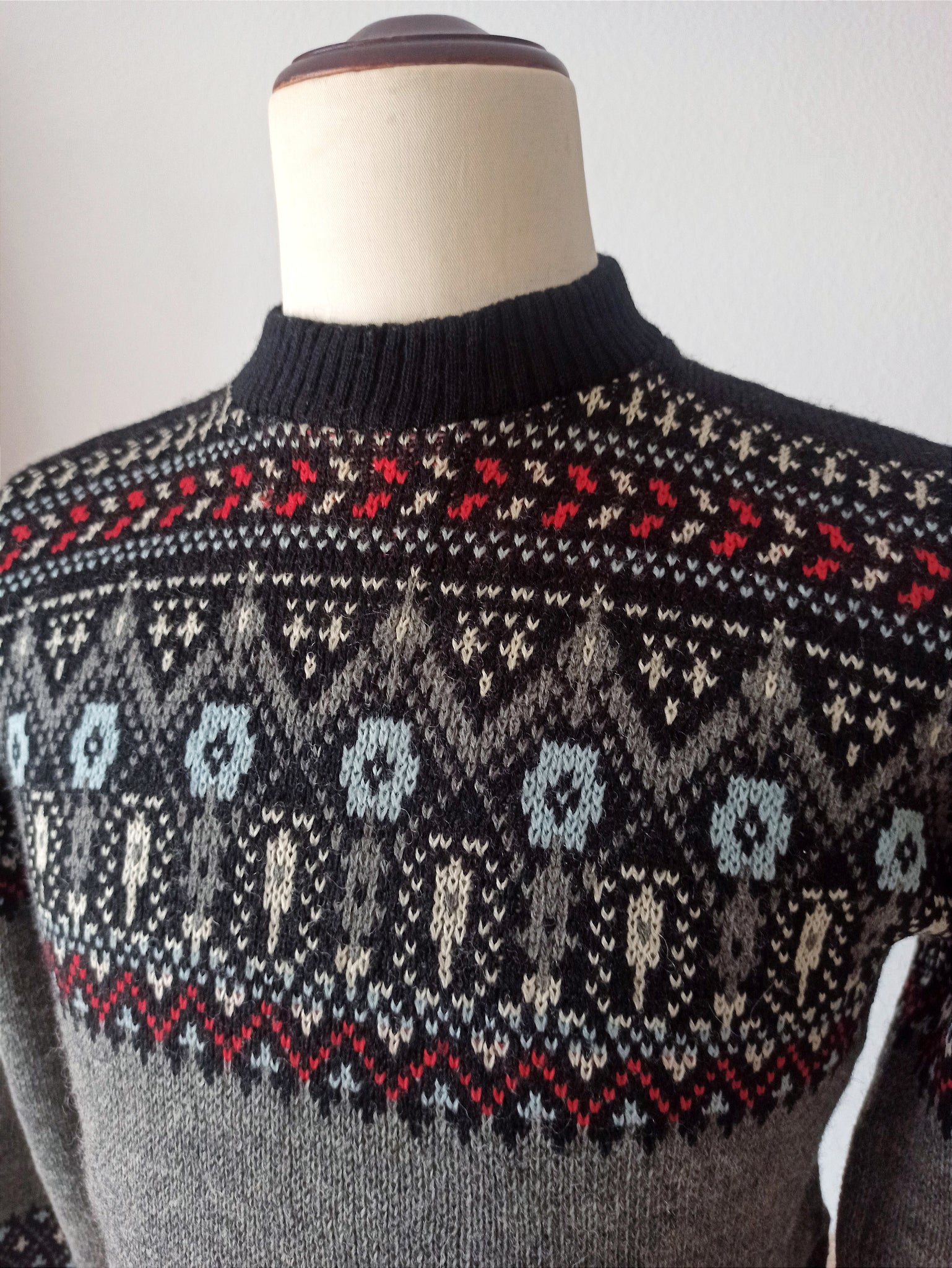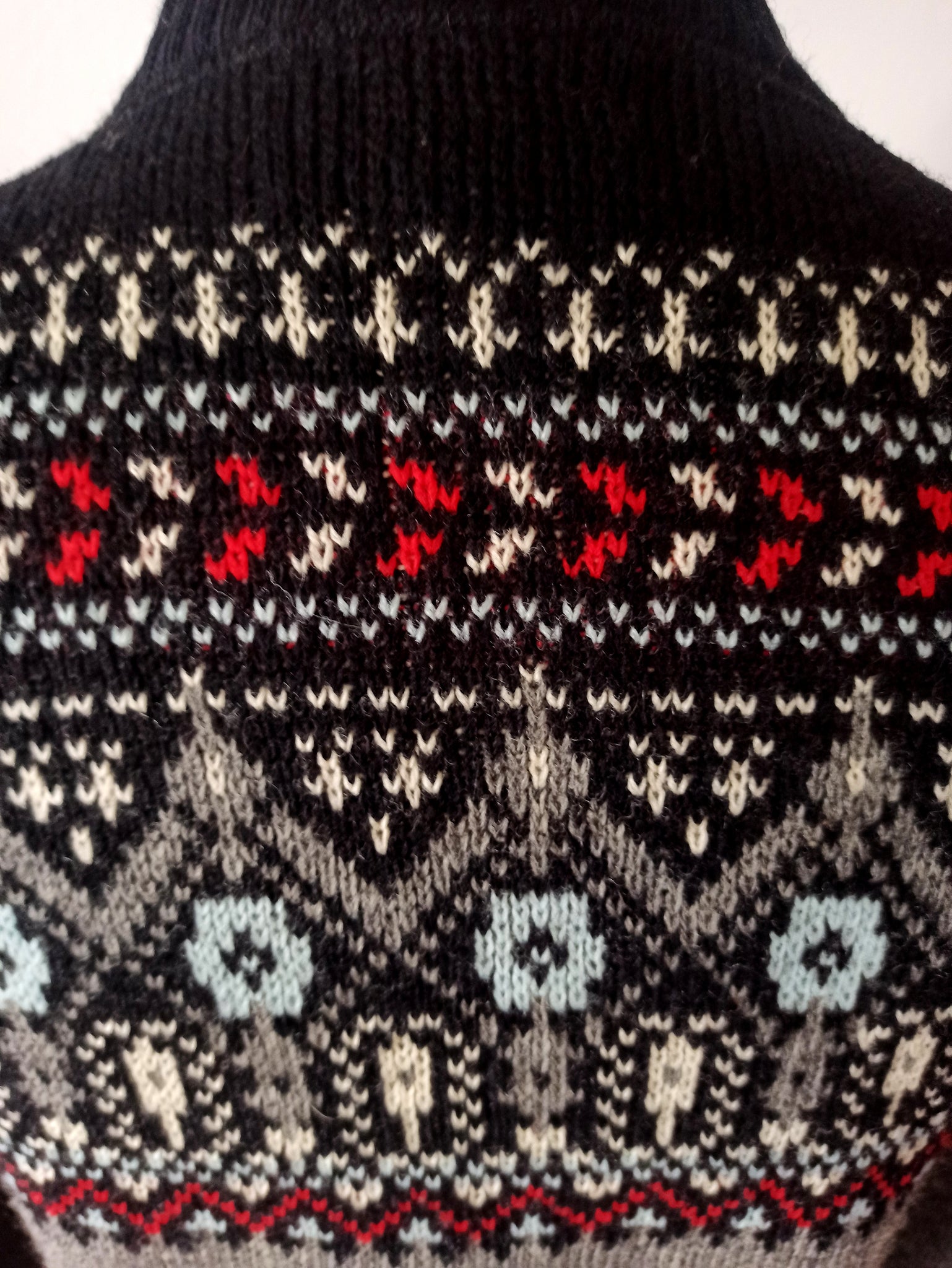 This is a fabulous men's sweater from the 1950s by Robert Bruce - Original Scandinavian Design by Paul Mage.  Wool knitted in black, dark grey, white, red and blue. Wide waistband and cuffs. Tag reads size Medium.
