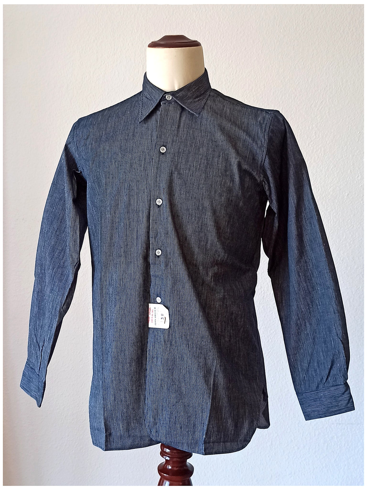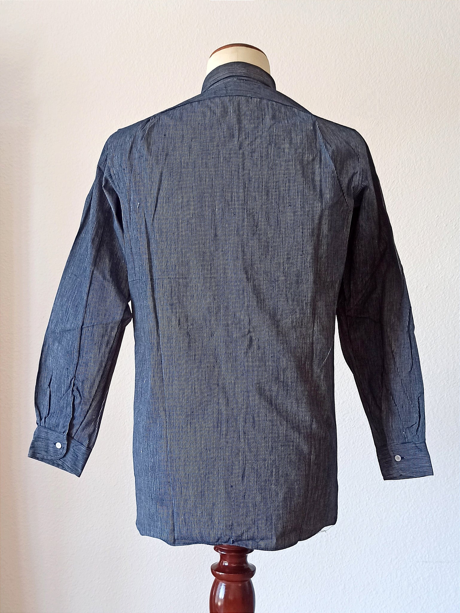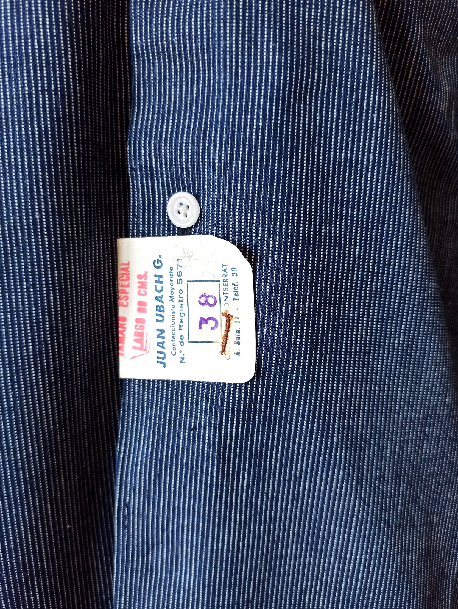 This is a rare and collectable men's shirt from the 1930s or early 1940s by Juan Ubach, Barcelona in deadstock condition with original tags. The fabric is blue striped cotton and it is still starched. Closes with front buttons. Bottom-side openings.