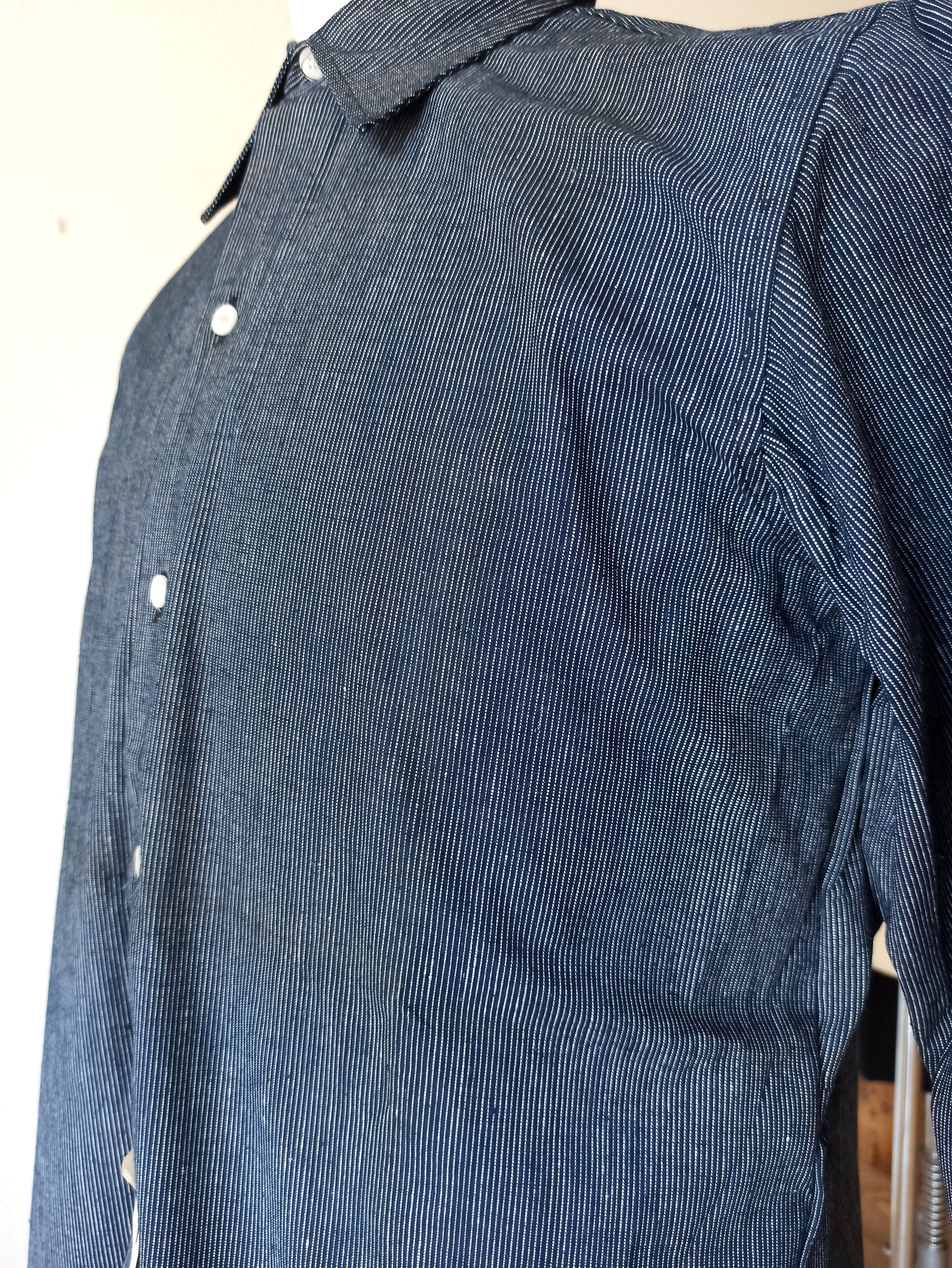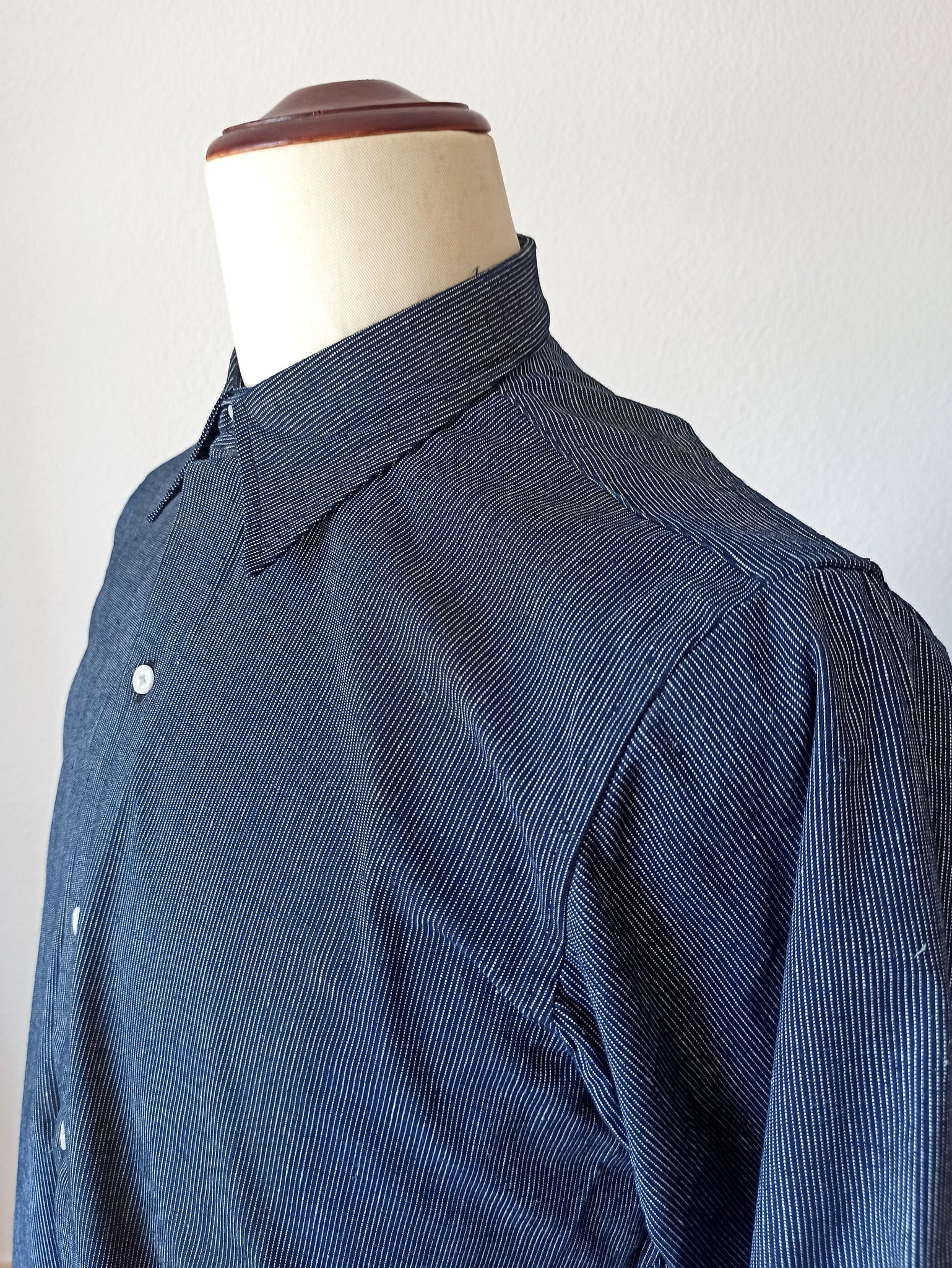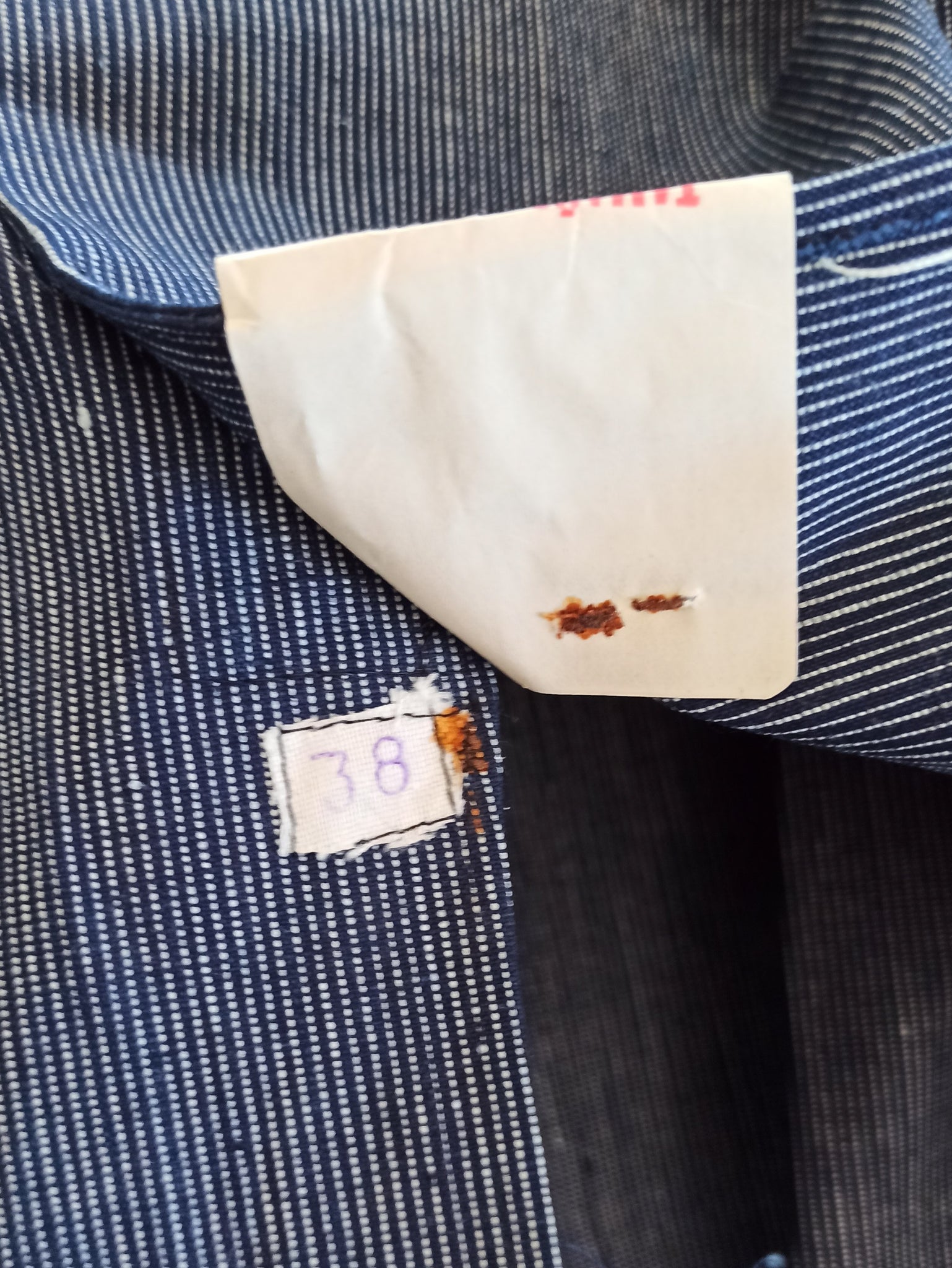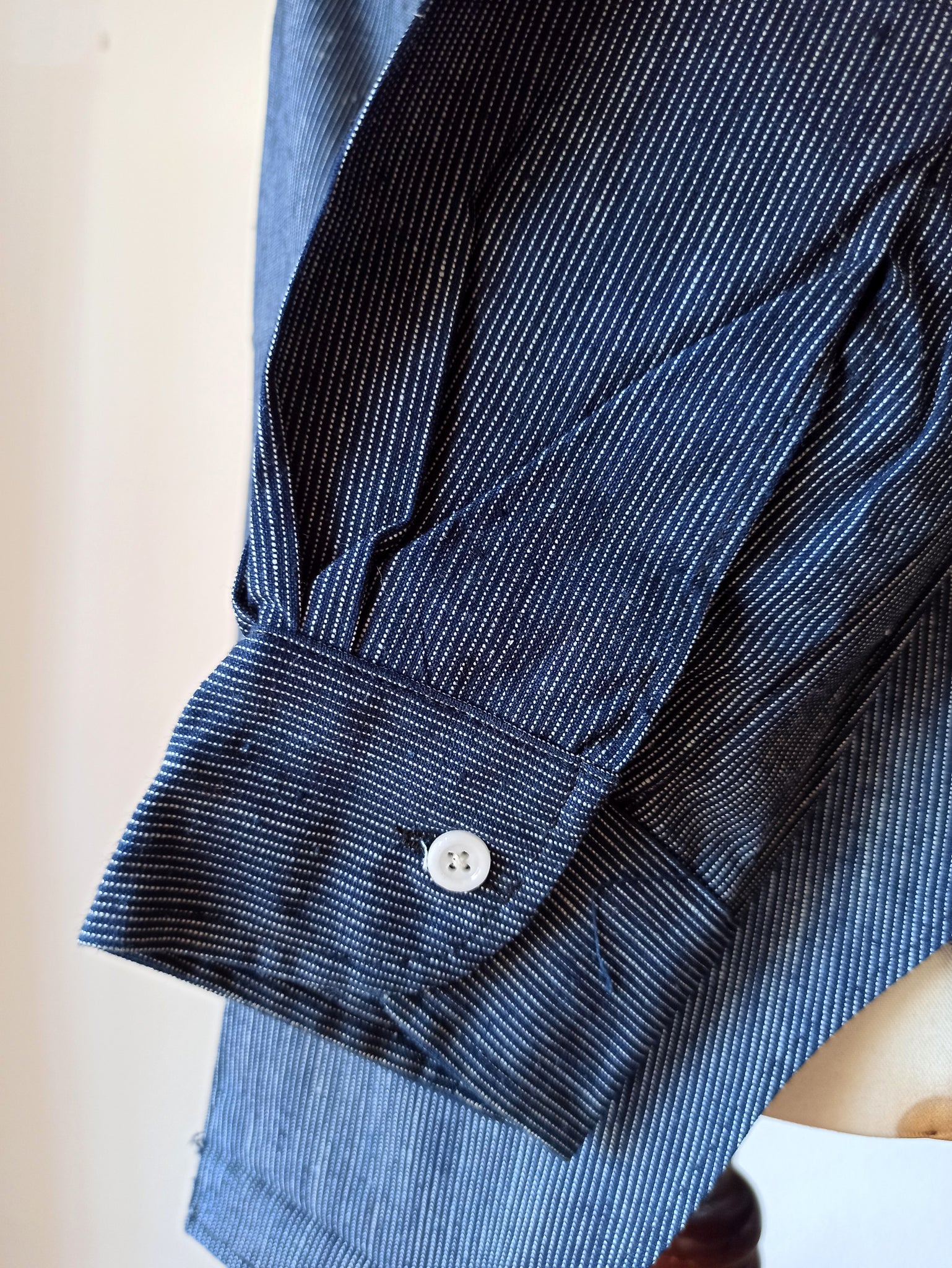 This is a rare and collectable men's shirt from the 1930s or early 1940s by Juan Ubach, Barcelona in deadstock condition with original tags. The fabric is blue striped cotton and it is still starched. Closes with front buttons. Bottom-side openings.