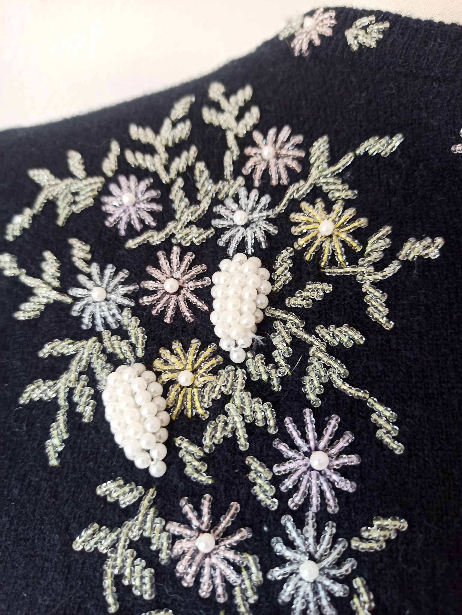 This is a truly stunning cardigan from the 1950s. Black angora wool with an amazing and precious vine leaves and grapes design. The vine leaves are pink, green, yellow and blue glass and the grapes are little pearls. Note how bold are those grapes! Satin lining. Simply fabulous!