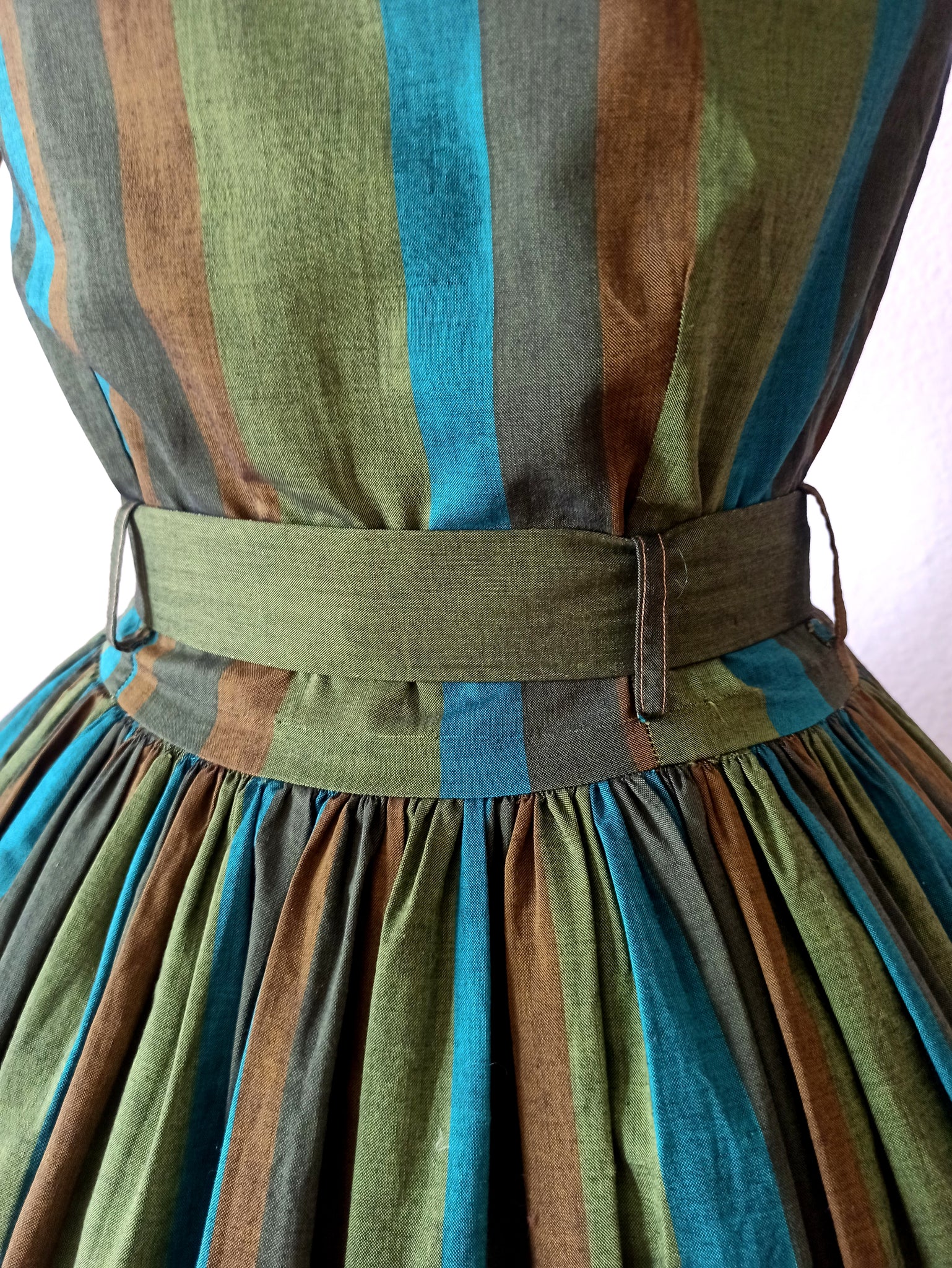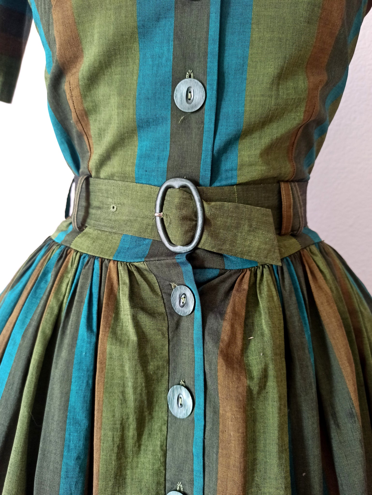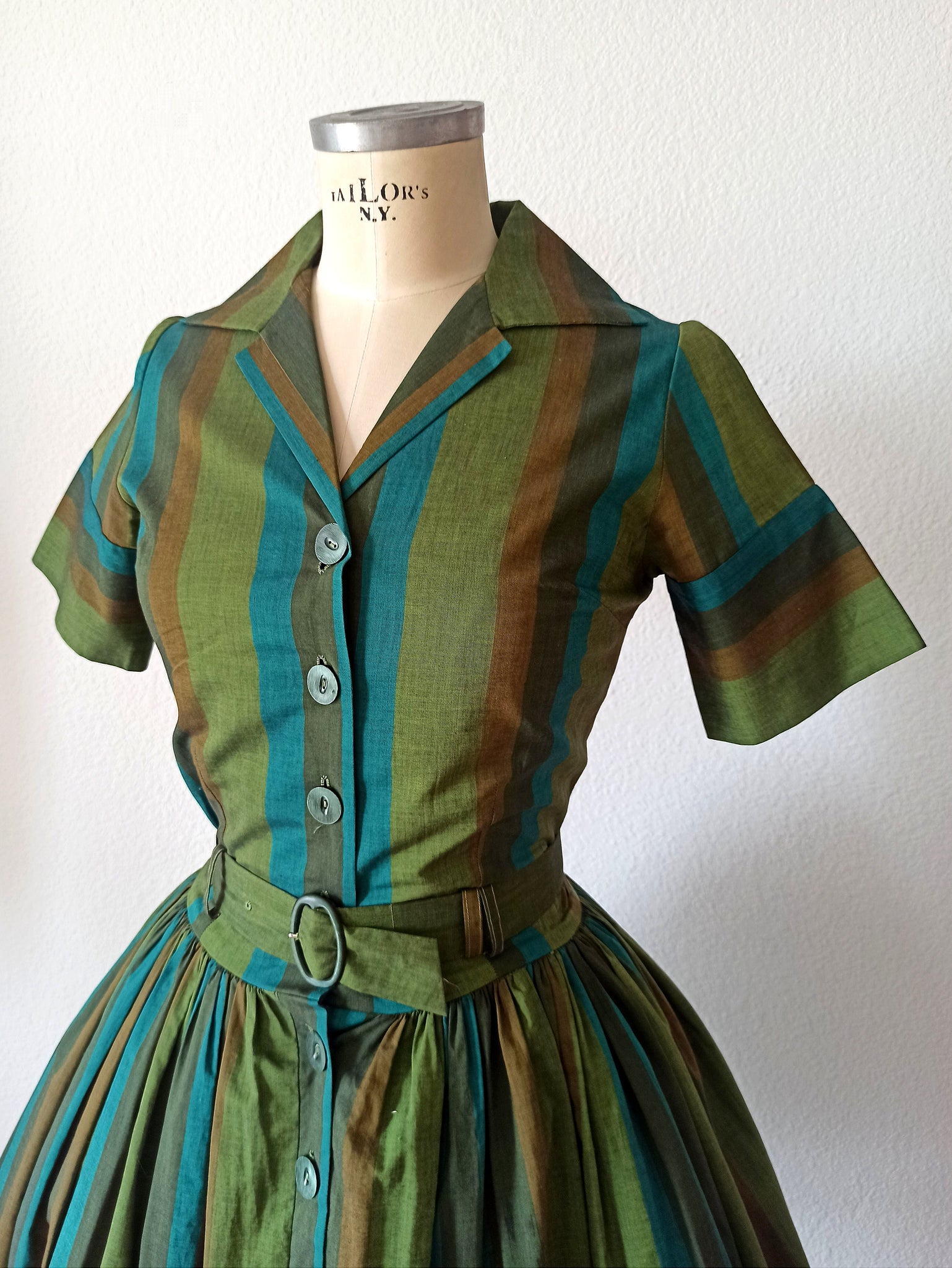 This is a truly spectacular dress from the 1950s in unworn condition. The fabric is cotton with a precious and autumnal combination of colours. She has an exquisite design with very original sleeves, a fabulous shirt collar, matching belt and an amazing gathered skirt. She closes with front buttons. This dress has no label but it is defenitely a top quality garment.